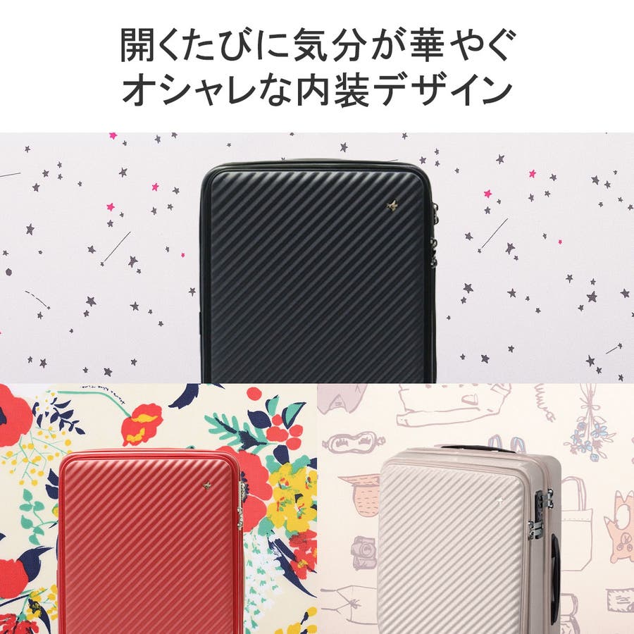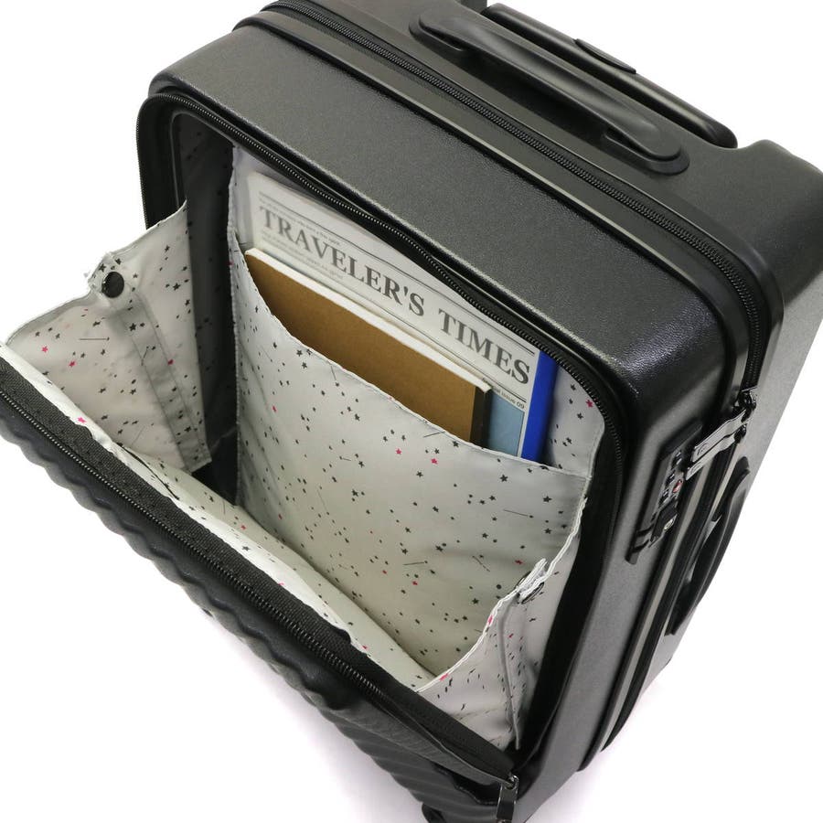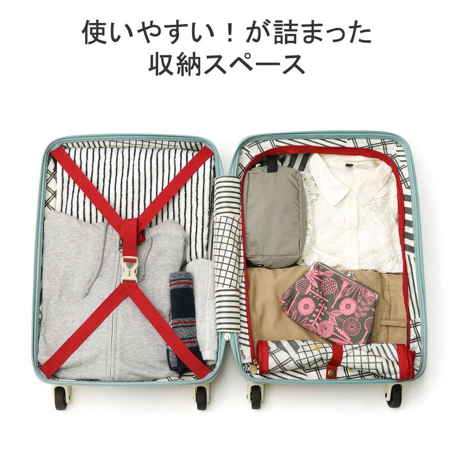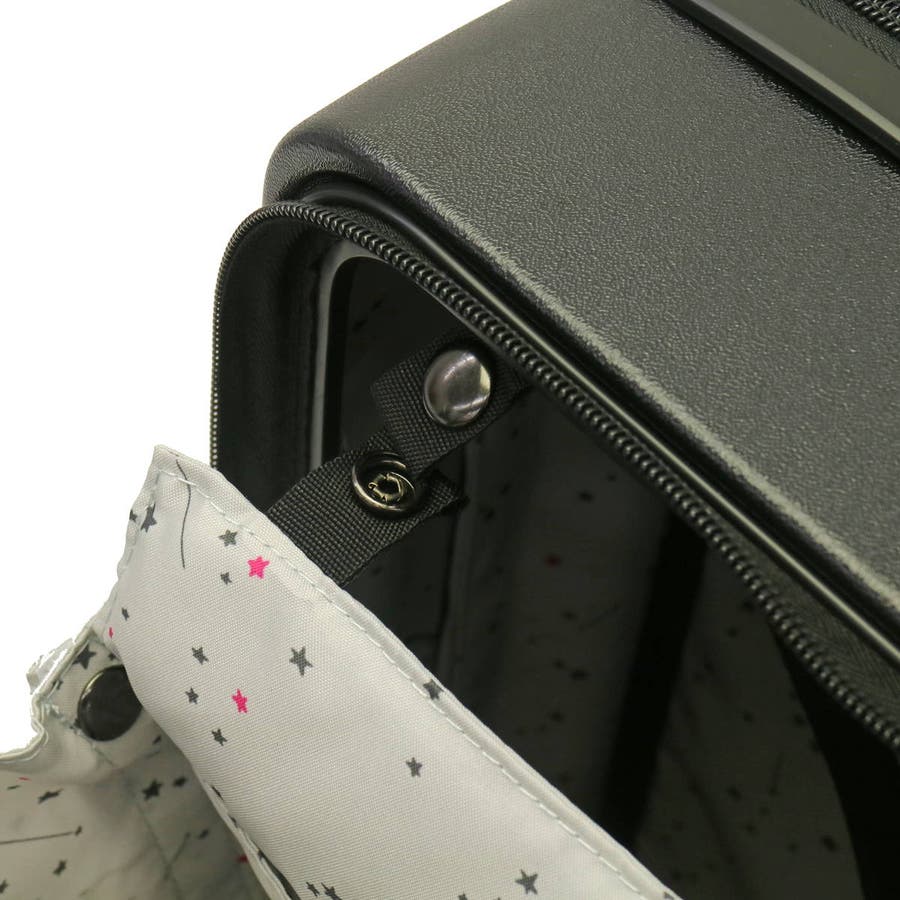 収納部は、可愛いだけでなく機能的で使い勝手に優れたつくりです。大きなフロントポケットは、スーツケースを立てたまま開けられるため、移動中の荷物の出し入れも楽々行うことができます。また、フロントポケット内のホックを外すと本体収納スペースにそのままアクセス可能。使い勝手のいい機能が満載です。