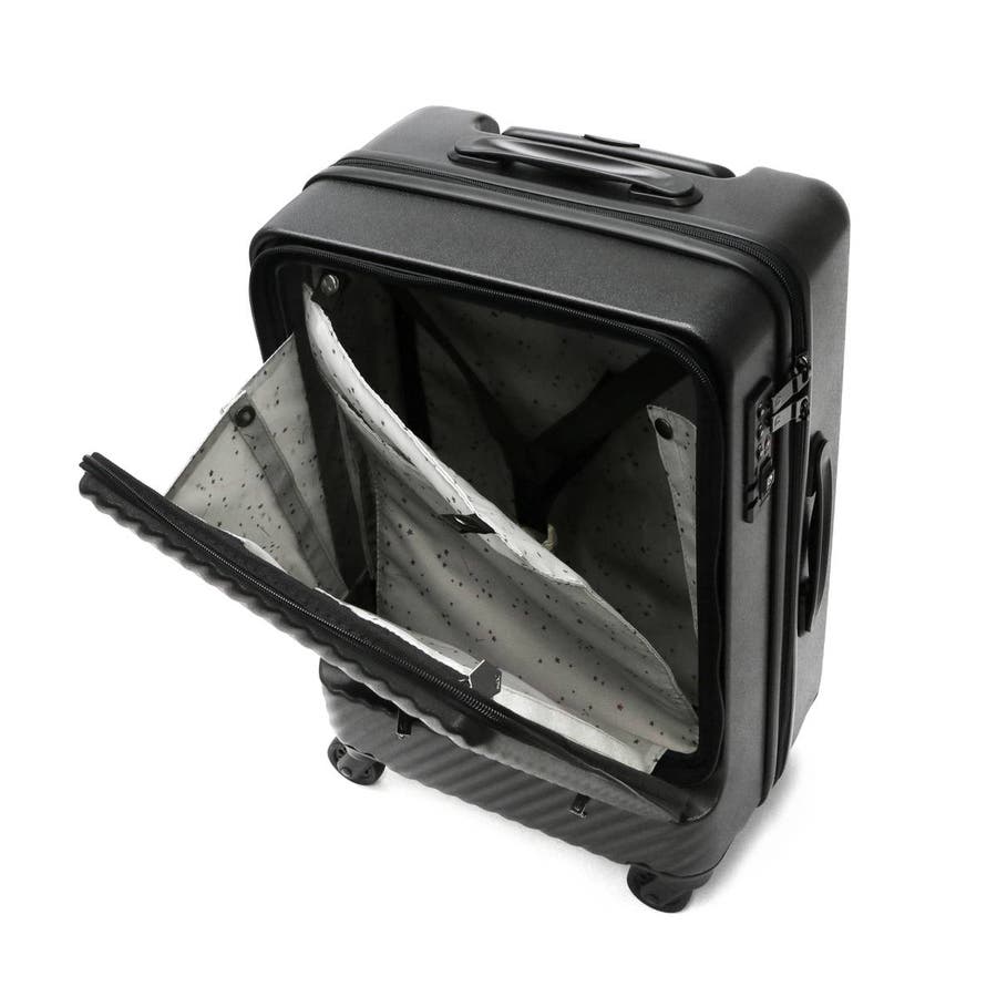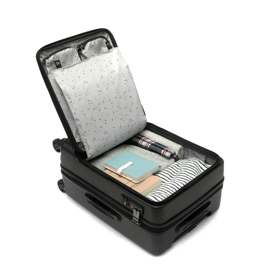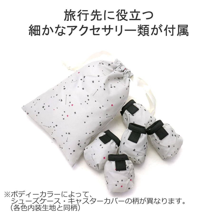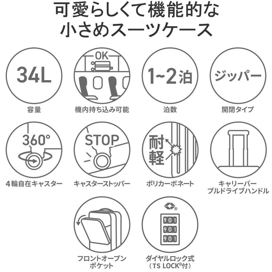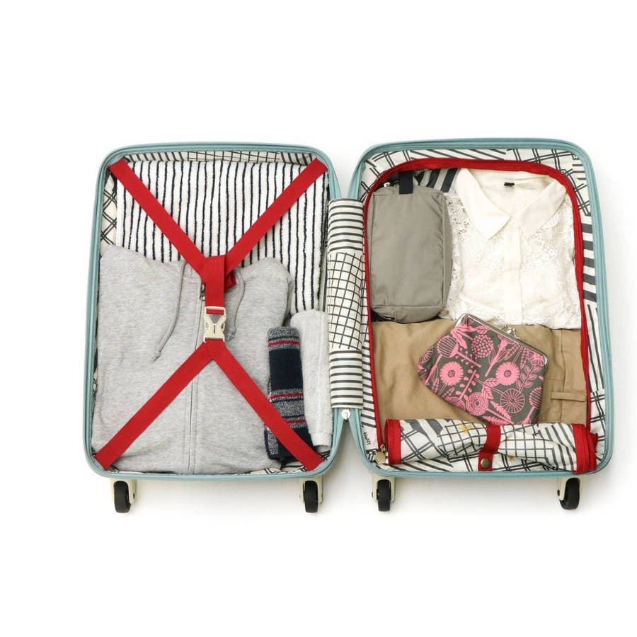 収納部は、可愛いだけでなく機能的で使い勝手に優れたつくりです。大きなフロントポケットは、スーツケースを立てたまま開けられるため、移動中の荷物の出し入れも楽々行うことができます。また、フロントポケット内のホックを外すと本体収納スペースにそのままアクセス可能。使い勝手のいい機能が満載です。