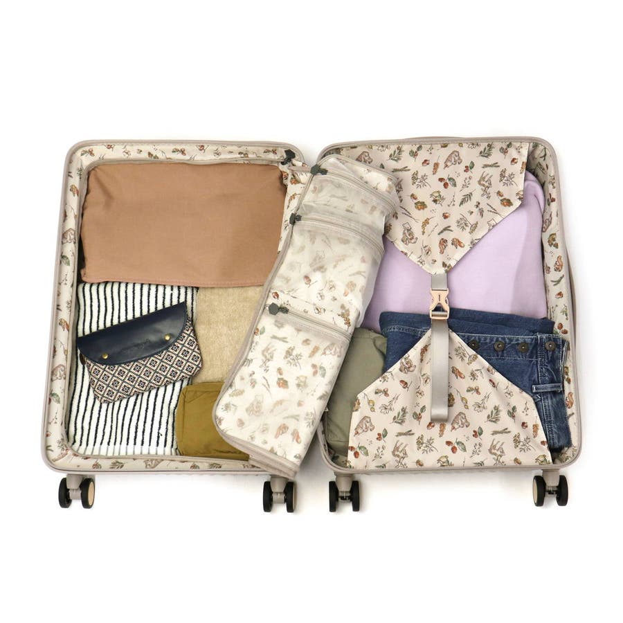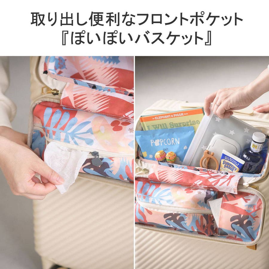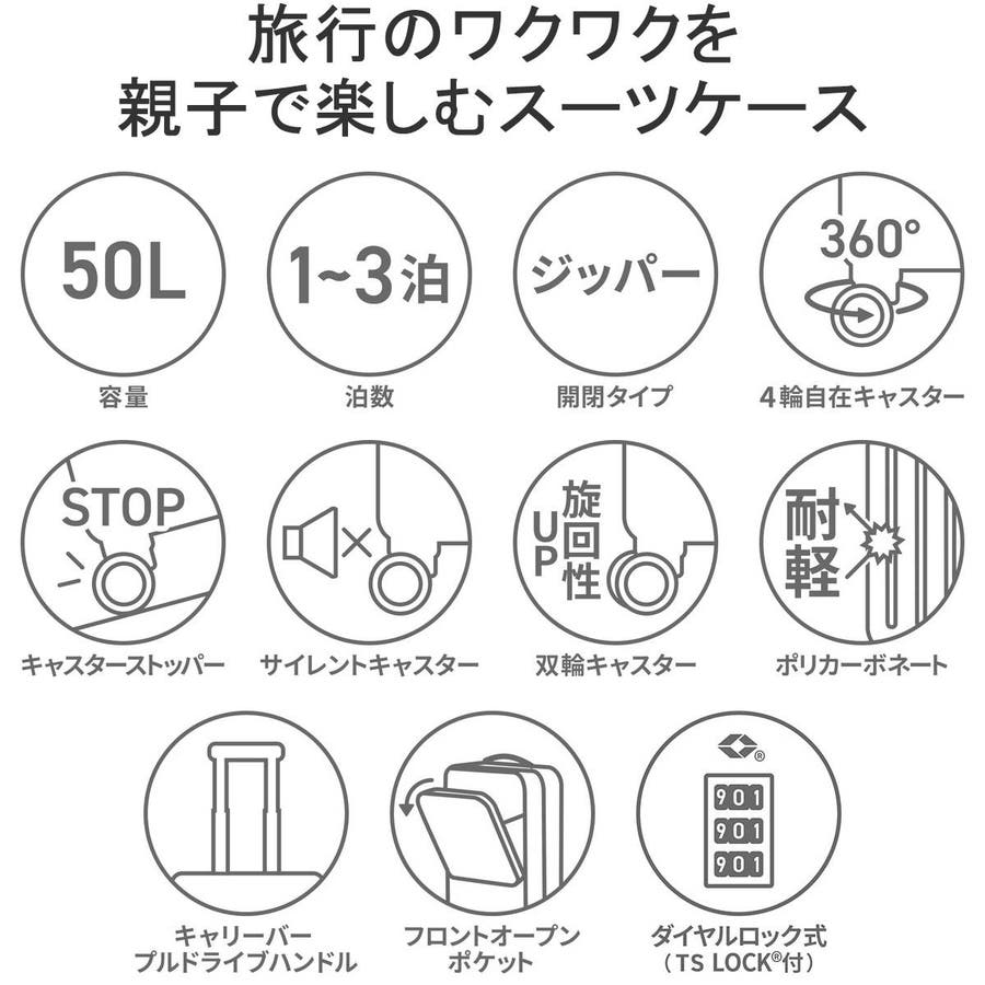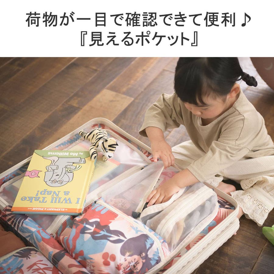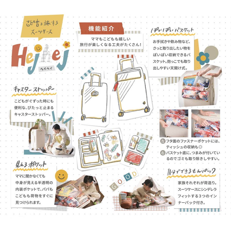 エースの社内研究会ace MAMA laboで開発された「子供と旅するスーツケース」シリーズ『ヘイヘイ』の、容量50Lタイプのスーツケース。内装はこどもが楽しくなるオリジナルのおはなしイラスト柄を採用。お出掛け先で人混みに行ってもはぐれないよう、子供の目線の高さに合わせた目印のストラップがついている気の利いた設計もポイント。家族での旅行が楽しくなる工夫がたくさん詰まったアイテムです。