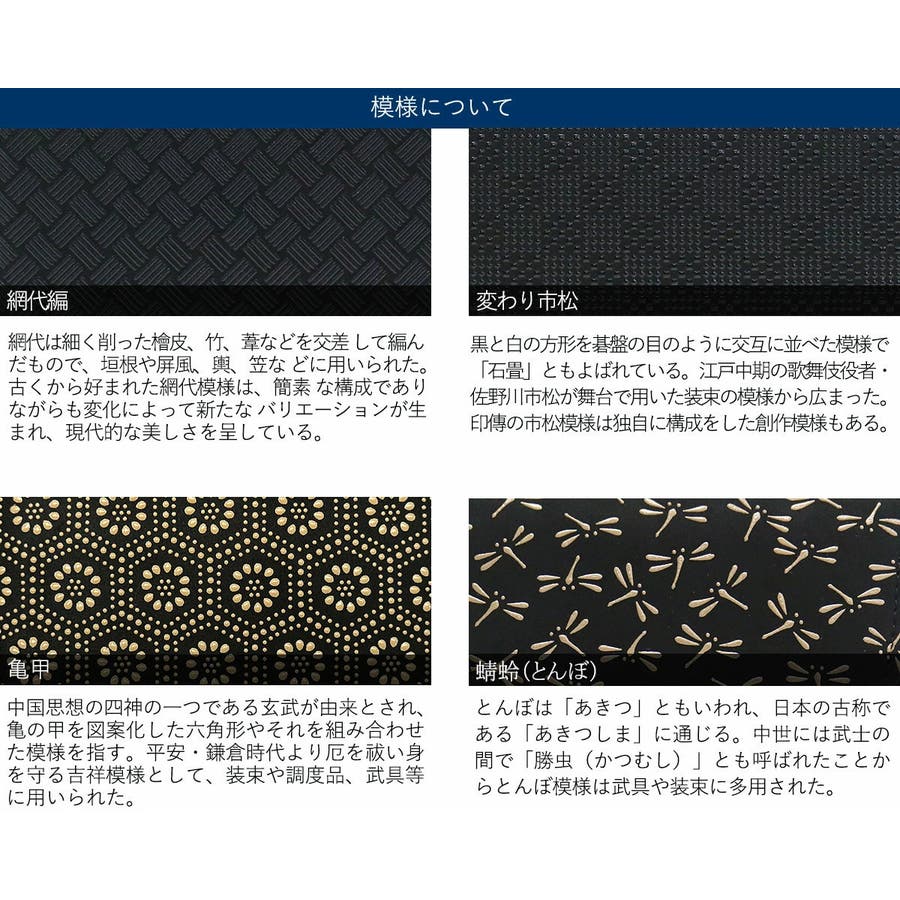 | カラー | 網代編(黒x黒) / 変わり市松小(黒x黒) / 亀甲(黒x白) / とんぼ(黒x白) / 七宝繋ぎ(紺x白) / 忘れな草(紺x白) / とんぼ(紺x黒) / 変わり市松小(紺x黒) |