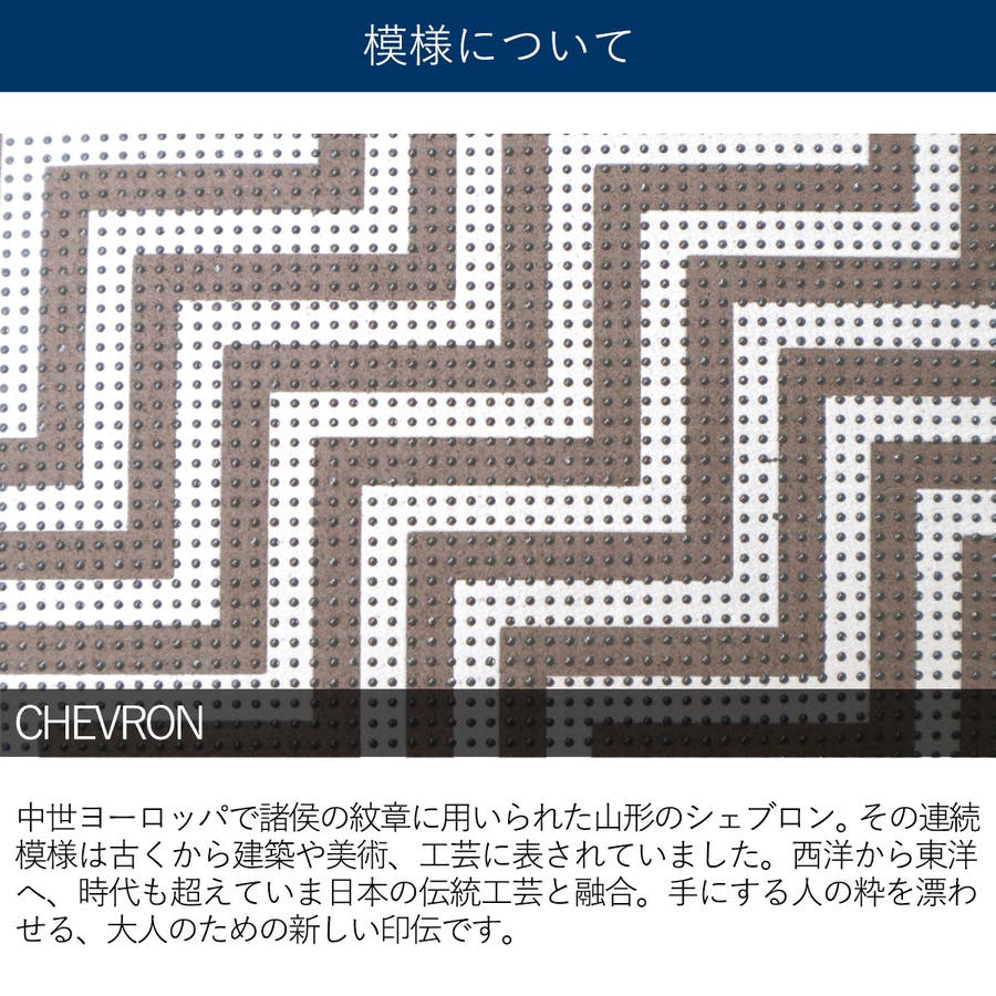 中世ヨーロッパで諸侯の紋章に用いられた山型のシェブロン。その連続模様は古くから建築や美術、工芸に表されました。西洋から東洋へ、時代も越えていま日本の伝統工芸と融合。手にする人の粋を漂わせる、大人のための新しい印伝の登場です。落ち着きのある色調で構成された幾何学模様のシェブロンは、オンオフ関わらず様々なスタイリングに調和しながら、大人の香気をほどよく添えます。