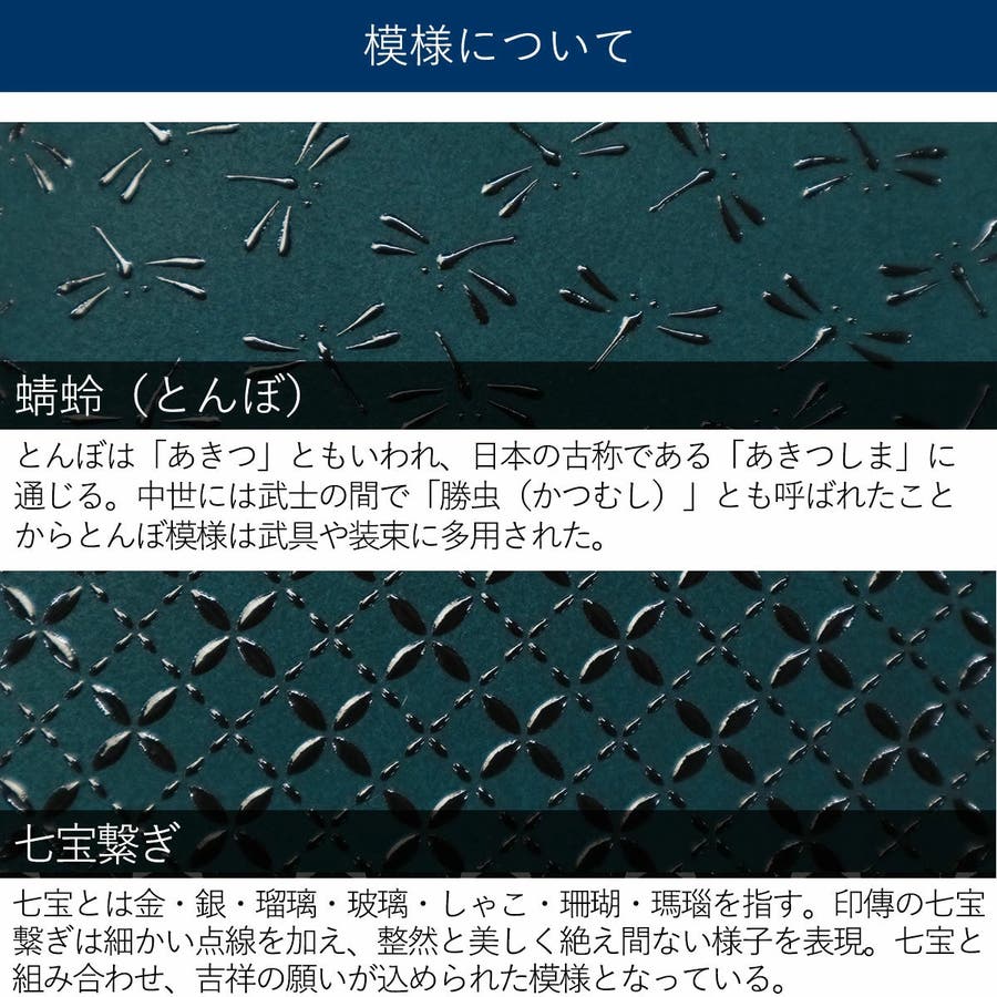 | カラー | とんぼ(黒×黒) / とんぼ(緑×黒) / 七宝繋ぎ(黒×黒) / 七宝繋ぎ(緑×黒) |