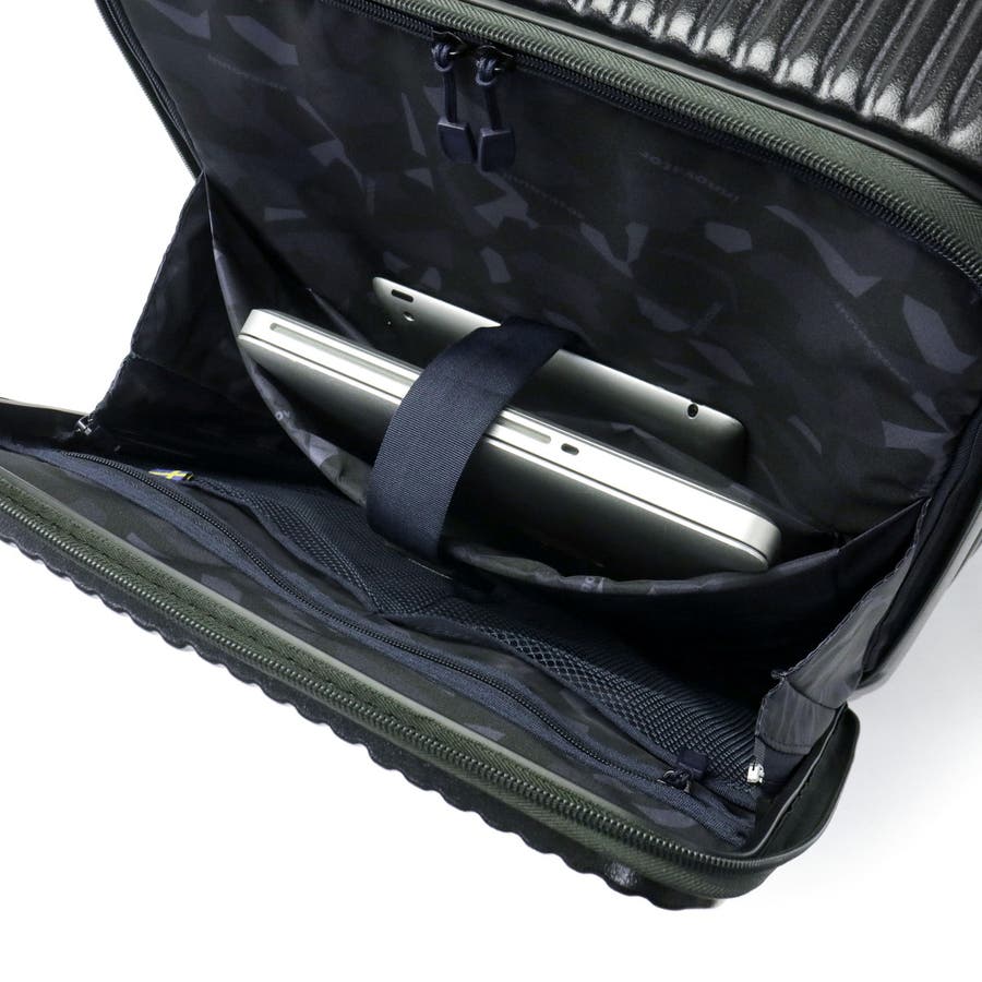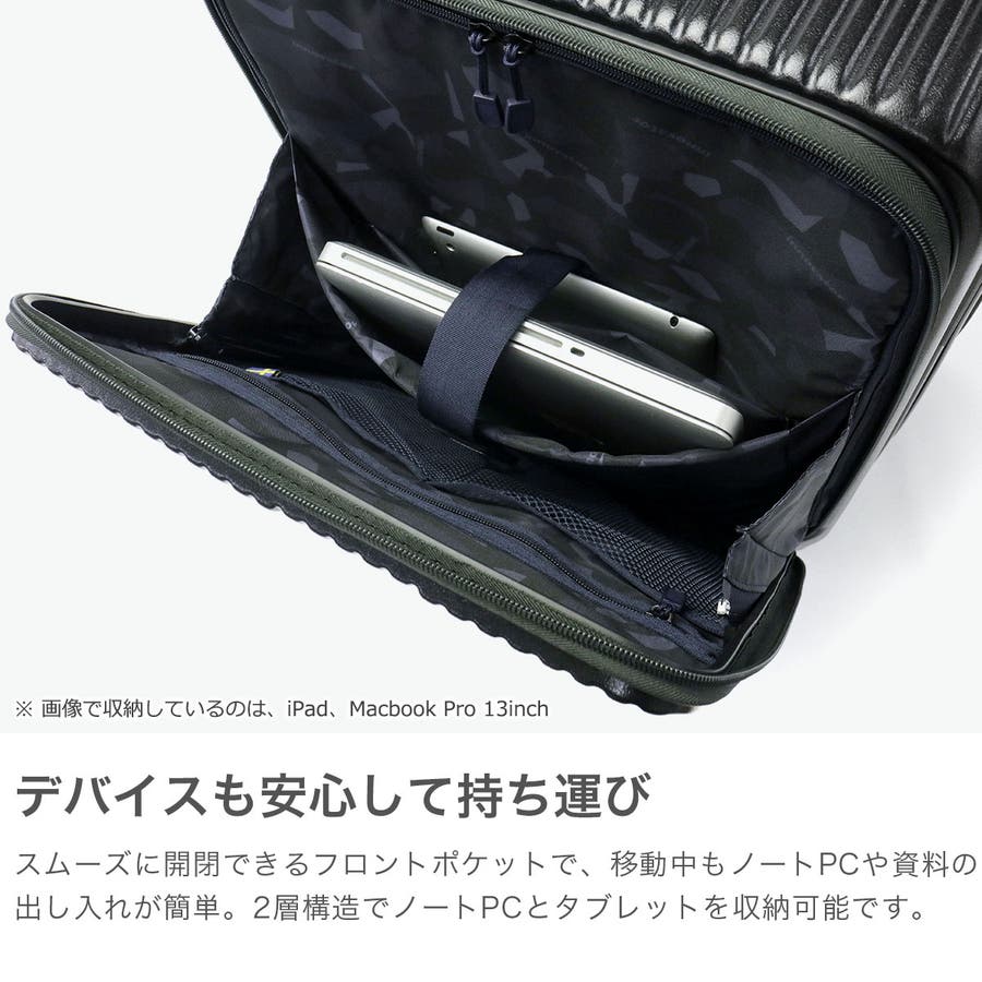身軽な旅を実現する、55L容量の使いやすいキャリーケース。本体は、衝撃に強いポリカーボネイトを採用。フロントにはクッション性のあるPC収納とタブレット収納を搭載しており、ビジネスシーンにも最適です。フロントからメインへアクセスできるため移動中の小物整理もスムーズ。ワンタッチブレーキが揺れを抑え、静音双輪キャスターが快適な走行をサポート。北欧テイストのカラーとデザインも魅力の、強度と機能性を兼ね備えた一台です。
