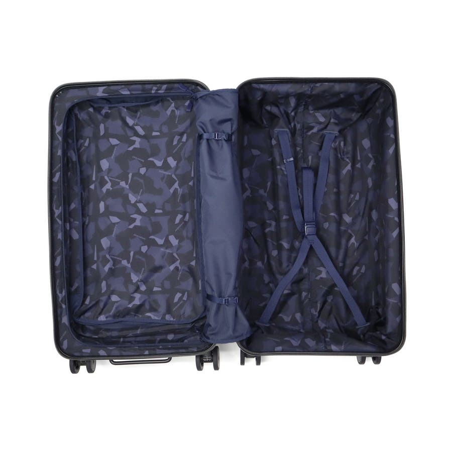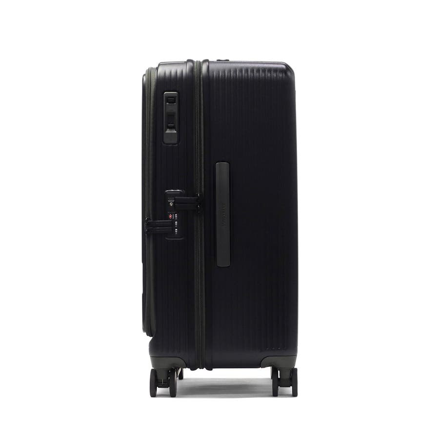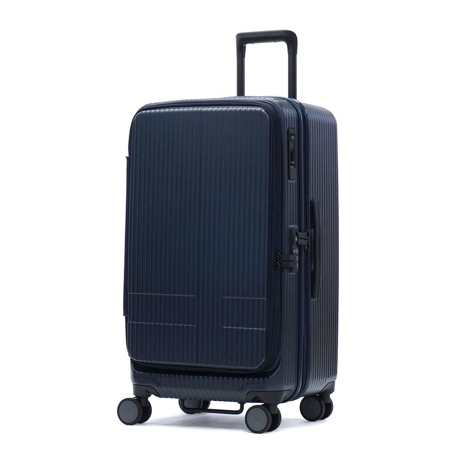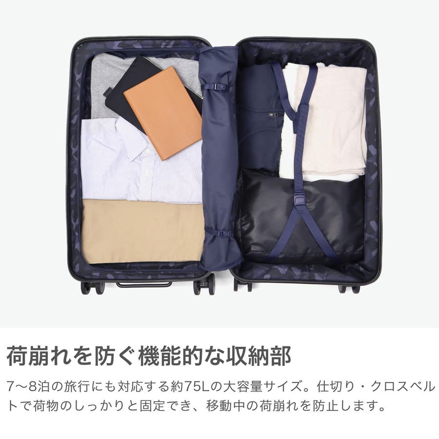 7~8泊の旅行にも対応する容量約75Lの大容量スーツケース。本体にはフロントオープンポケットを搭載しており、移動中の荷物の取り出しもスムーズに行えます。また静音キャスターやキャスターストッパー、海外旅行にも安心なTSAロックを装備するなど、便利な機能が集約された頼もしい設計が魅力です。