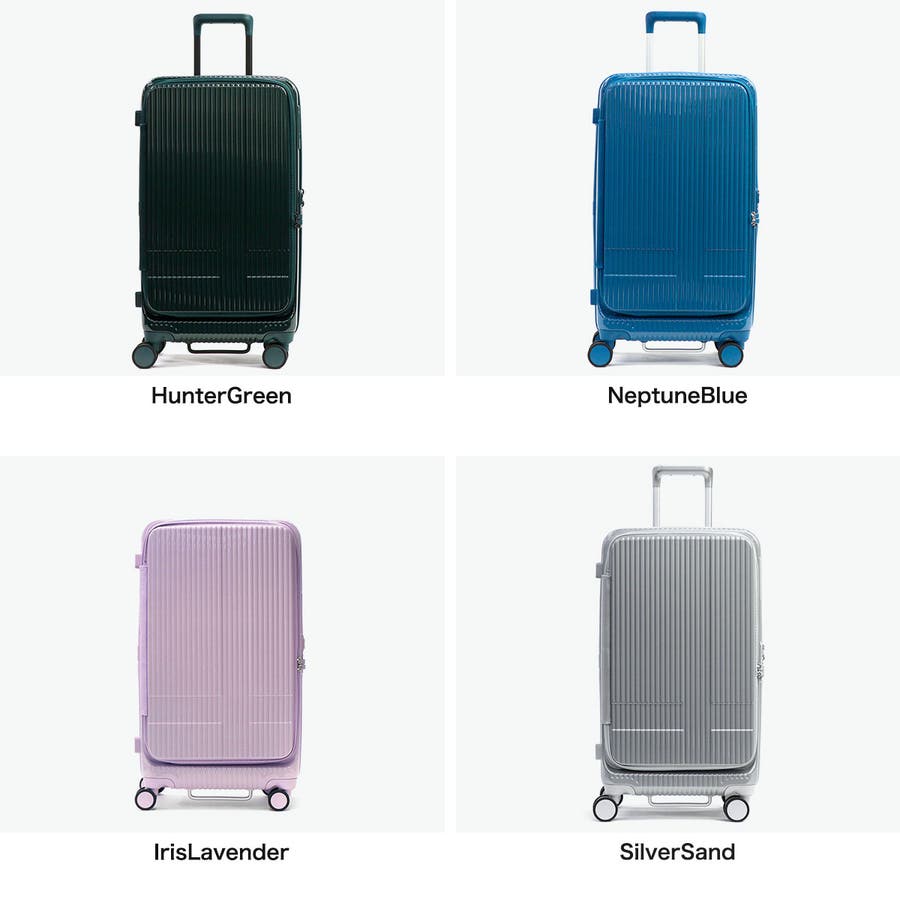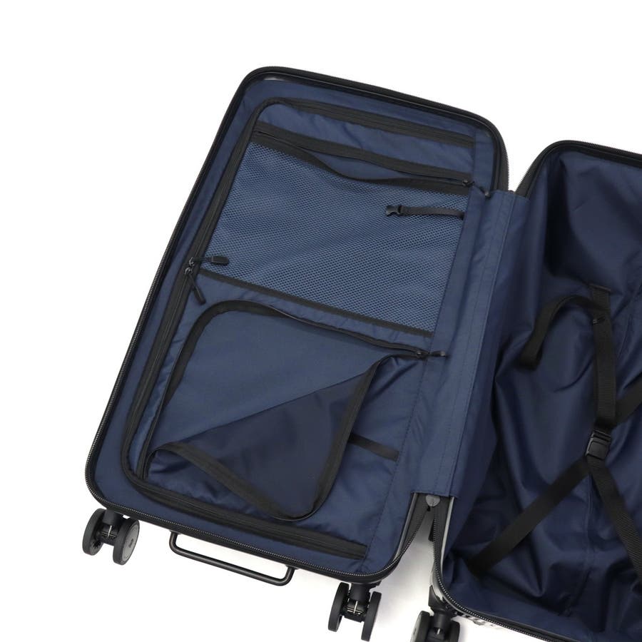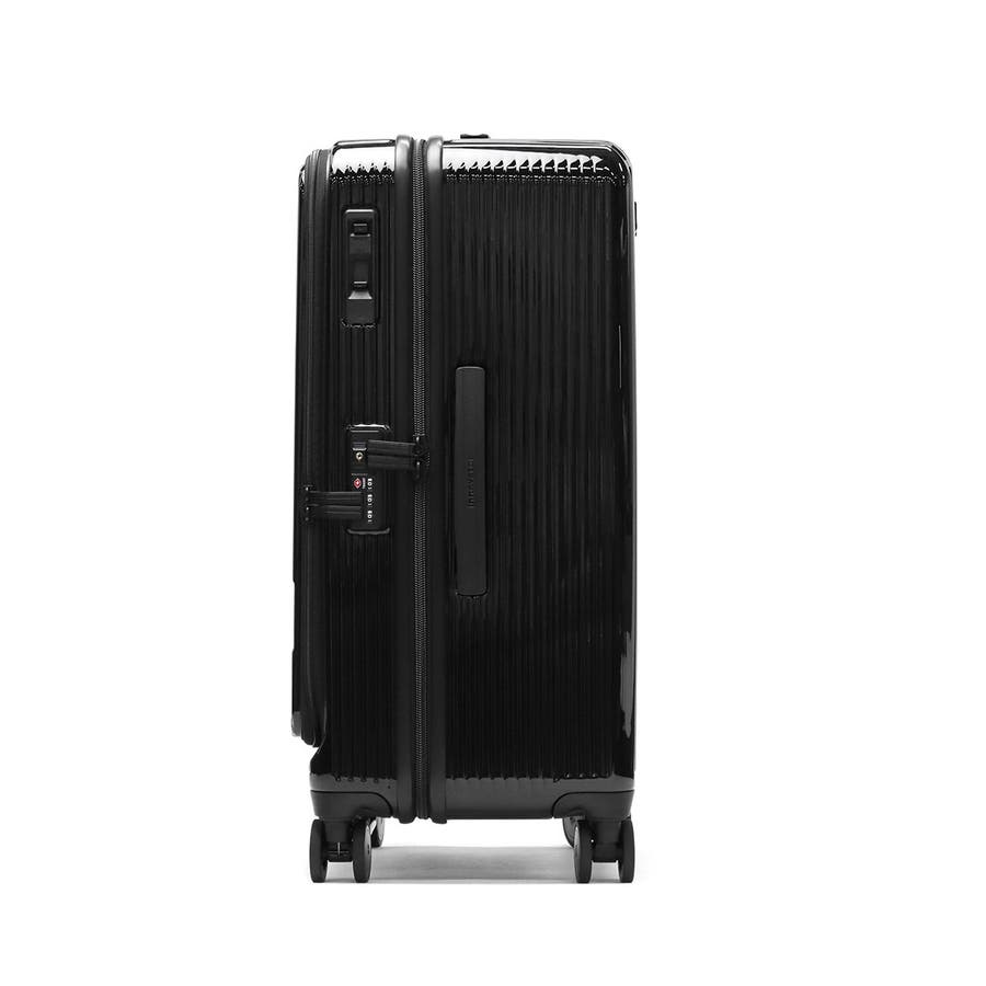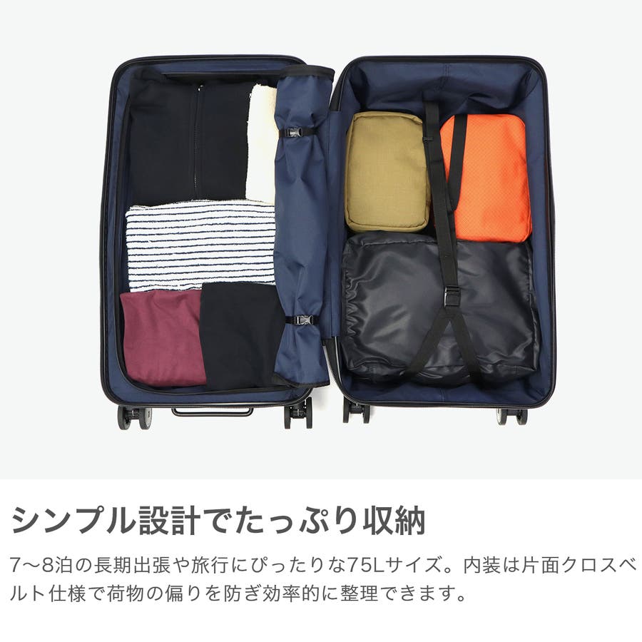 長期出張や旅行の荷物がまとまる、75L容量のキャリーケース。本体表面に鏡面加工を施したデザインがポイントです。前面にはワイドに開くフロントドアポケットがついており、奥にある荷物の取り出しも簡単。他にも、消音双輪キャスターや耐久性に優れたボディ、重い荷物の積み込みをサポートするボトムハンドルなど、旅を快適にする機能を搭載しています。
