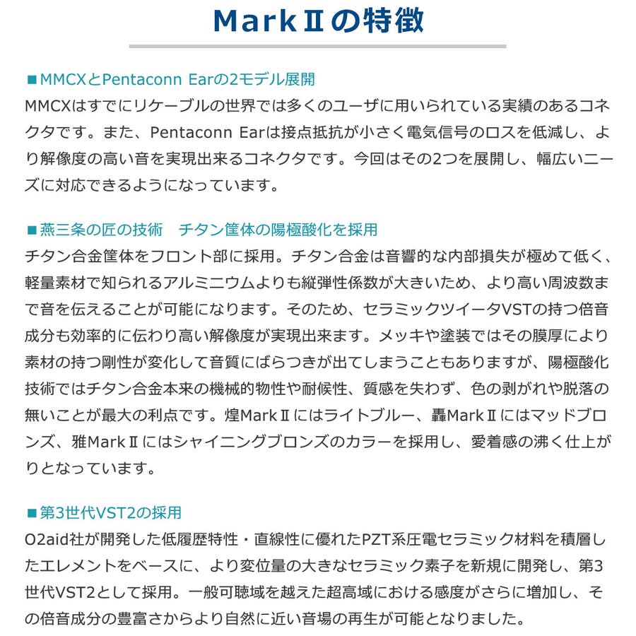 伸びのある中高域の再生が魅力のハイレゾ対応イヤホン「煌/KIRA」が、よりその方向性を極めた音作りへとリニューアルし『煌Mark2』として登場。こちらはMMCXのType-Mです。