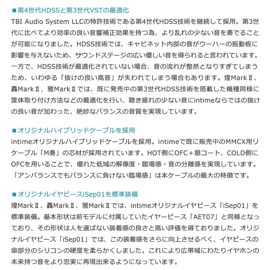 intimeの人気モデルである、中高域の「煌/KIRA」、重低音の「轟/GO」、そしてフラット特性の「雅/MIYABI」の位置づけを変えること無く、それぞれのモデルがさらにその特性をしっかりと明示した音作りとなったイヤホンシリーズ「Mark2」。