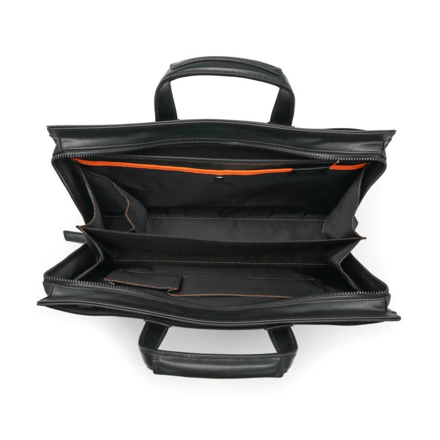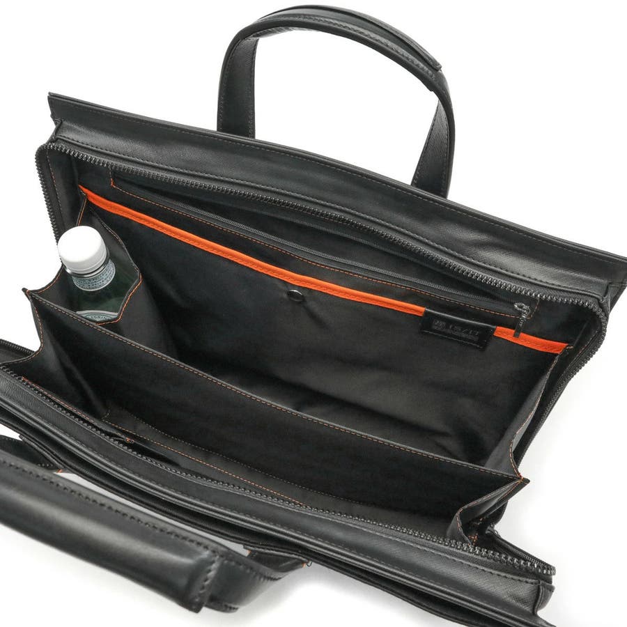 メインルームの収納口は大きく開き、中の荷物が見渡しやすいデザイン。内装の真ん中には仕切りを設け、ファイル類をすっきりと仕分けられる気の利いた設計です。ビジネス小物の整頓に役立つポケットや、ボトルホルダーなど便利な収納機能を豊富に設けているので、荷物の収納を効率的に行うことができます。また、本体外側には前面・背面共にあおりポケットを装備。収納口はマグネットボタン式で簡単に開閉できるので、すぐに手にしたい荷物の管理に重宝します。