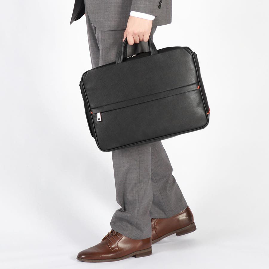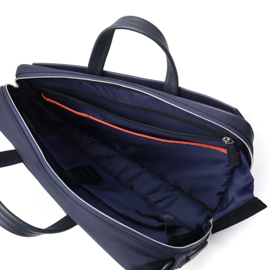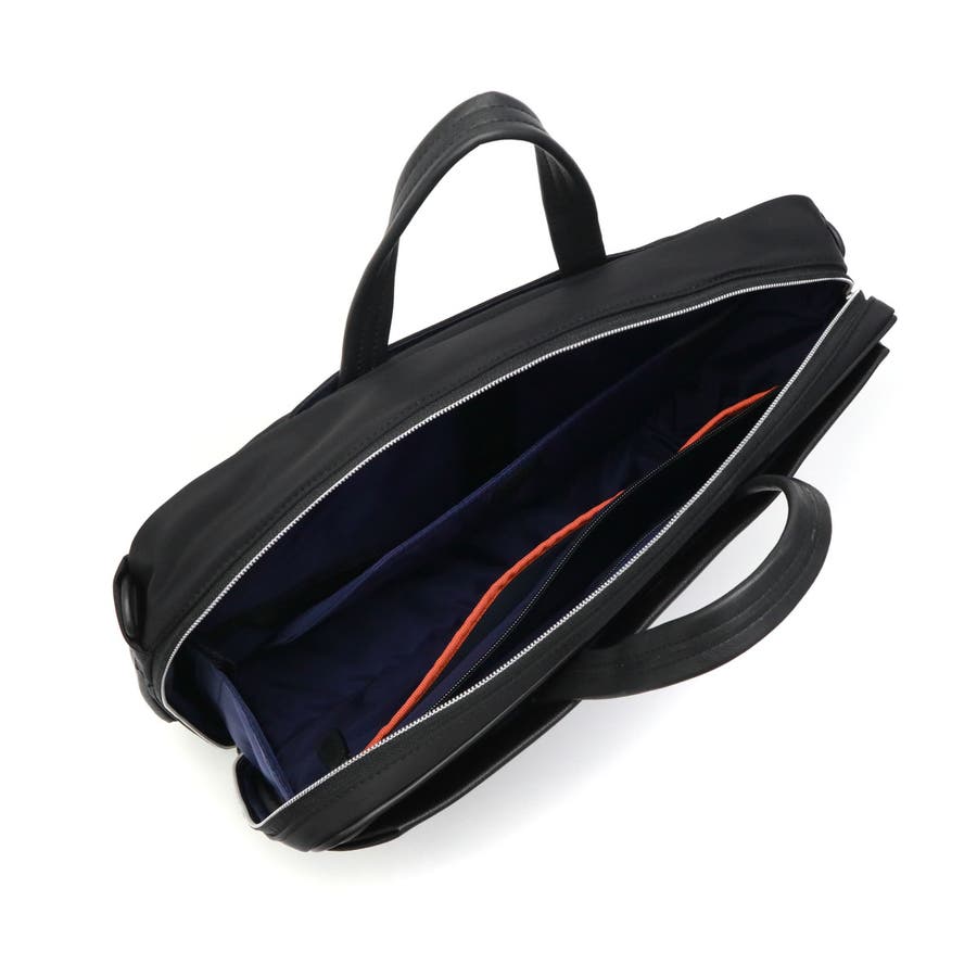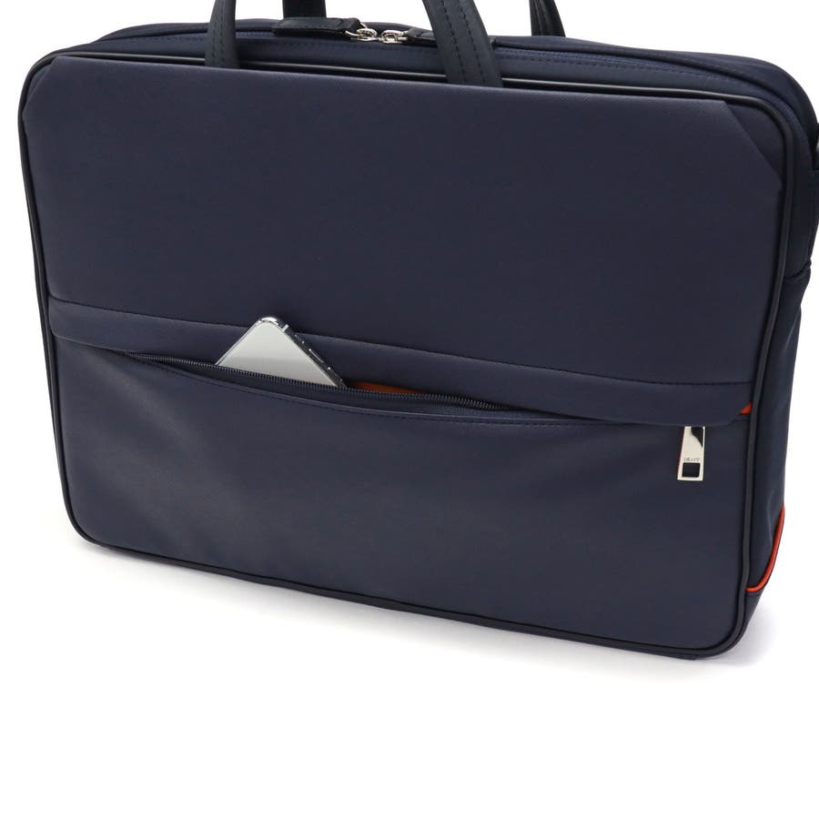 メインコンパートメントは、中身を一目で把握できるシンプルな構造。外側正面のファスナーポケットには、電子ツールが傷付きにくく、見やすいオレンジ色のパイル地を使用しております。また前面にはあおりポケットがあり、ハンドル収納はもちろんすぐに取り出したいアイテムの収納にも便利です。ビジネスシーンに特化した機能が随所に施され、日々の仕事を快適に過ごせます。