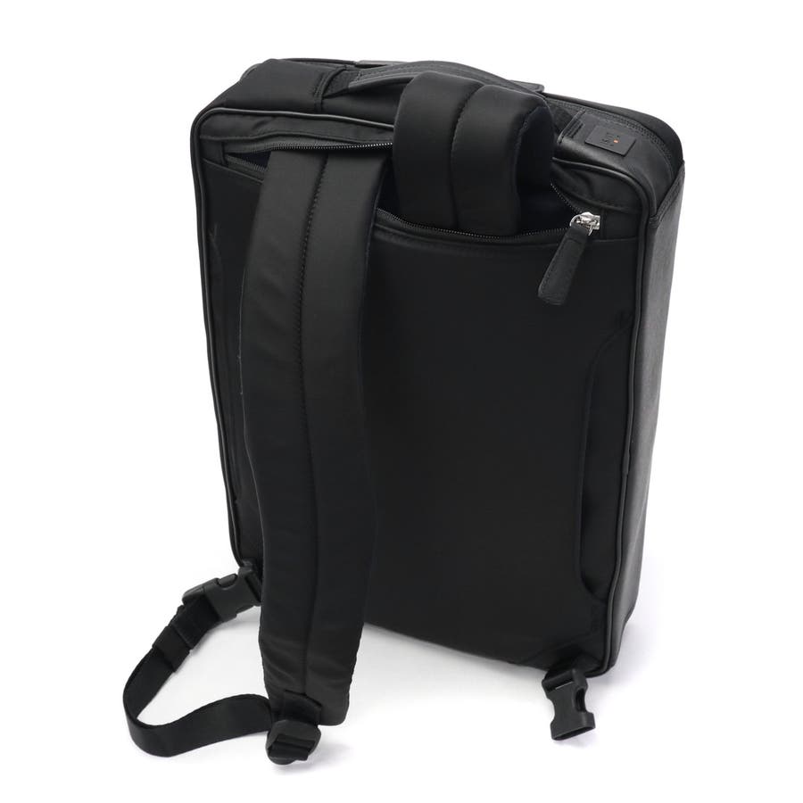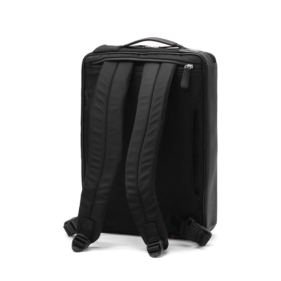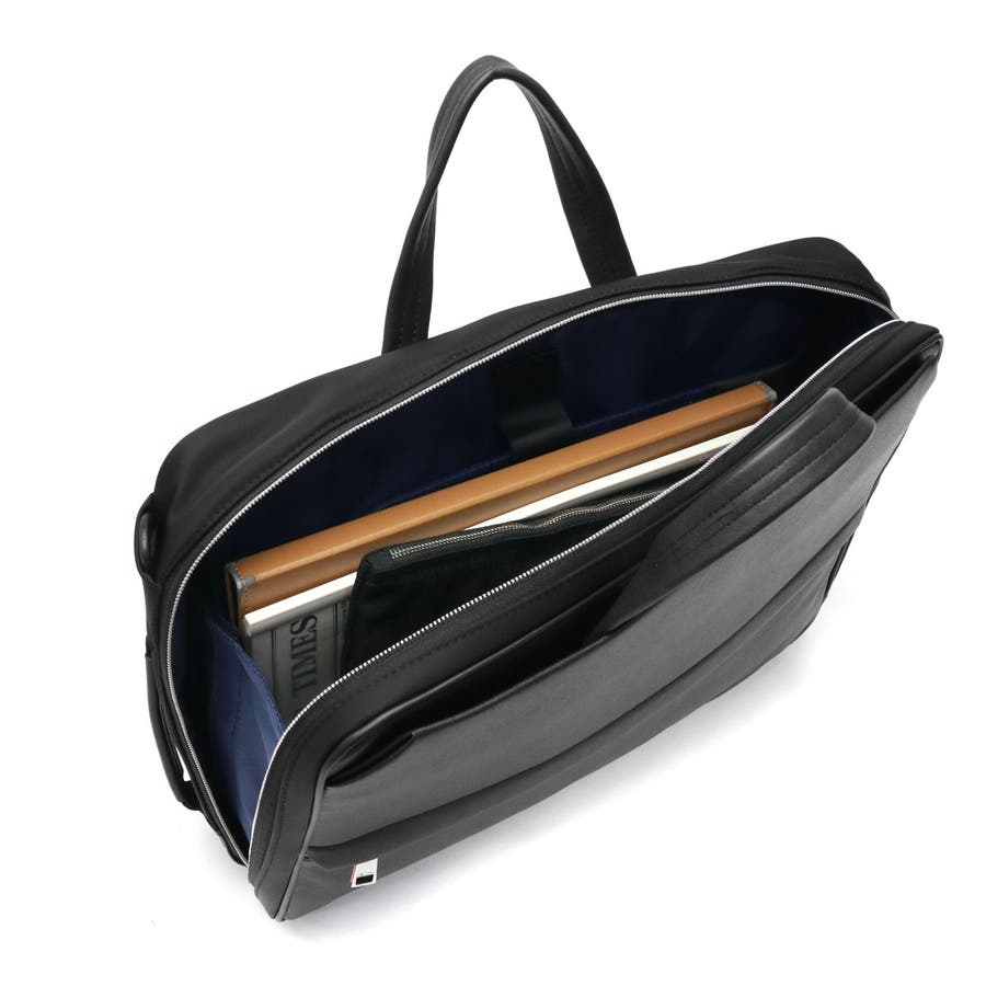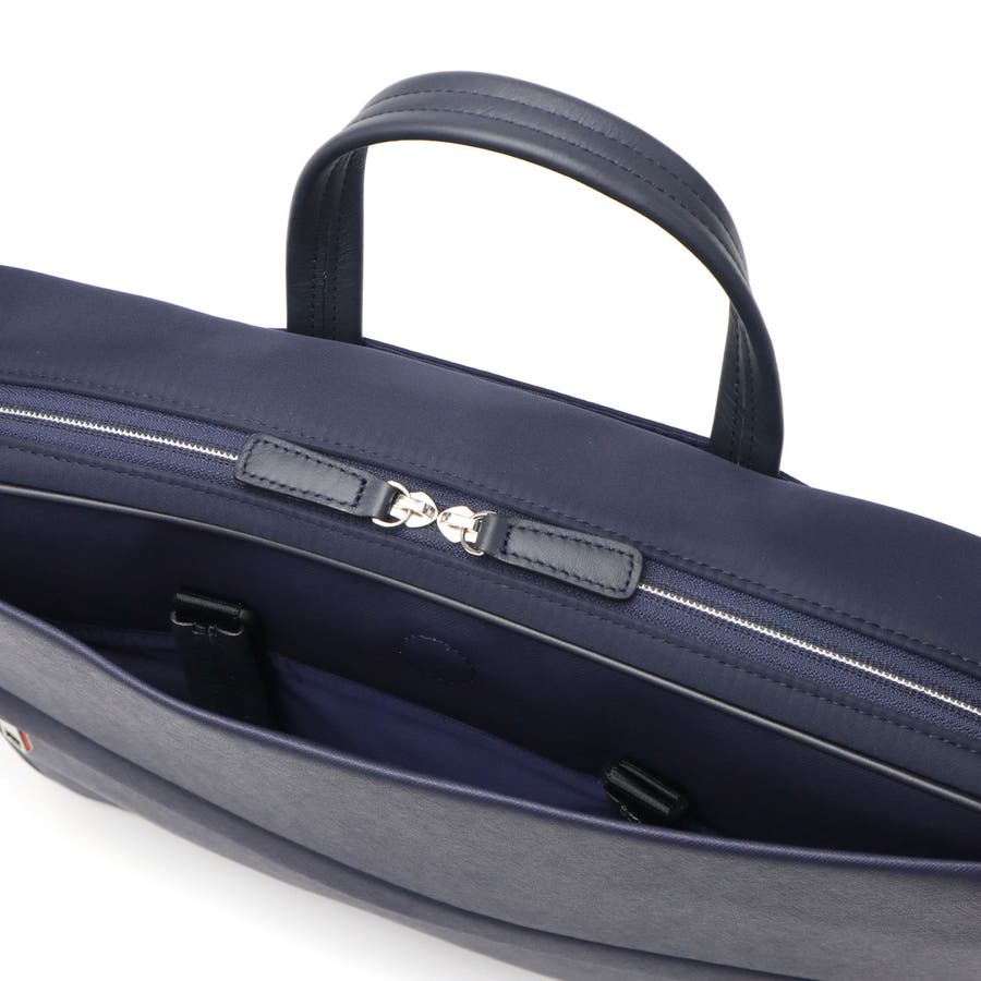 異素材コンビでスッキリとしたデザインのビジネスバッグ。こちらはA4ファイルの収納が可能で、手持ち、リュック、斜め掛けとシーンに応じて使い分けのできる3WAYタイプです。本体の前面にはサフィアーノ型合成皮革を使用し、ハンドルには手に馴染む牛革を、そしてマチと背面にはナイロンを採用。スーツスタイルにマッチするスタイリッシュな仕上がりです。
