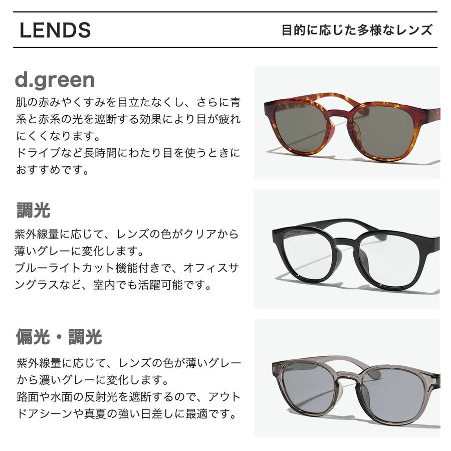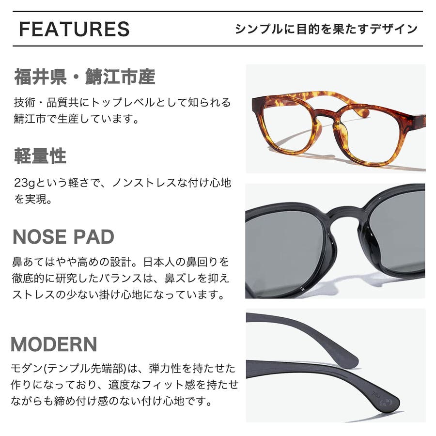 | カラー | ブラック×ダークグリーン / ブラック×調光 / ブラック×偏光調光 / ディープブラック×ダークグリーン / ディープブラック×調光 / ディープブラック×偏光調光 / トータスブラック×ダークグリーン / トータスブラック×調光 / トータスブラック×偏光調光 / グレー×ダークグリーン / グレー×調光 / グレー×偏光調光 / トータスブラウン×ダークグリーン / トータスブラウン×調光 / トータスブラウン×偏光調光 |