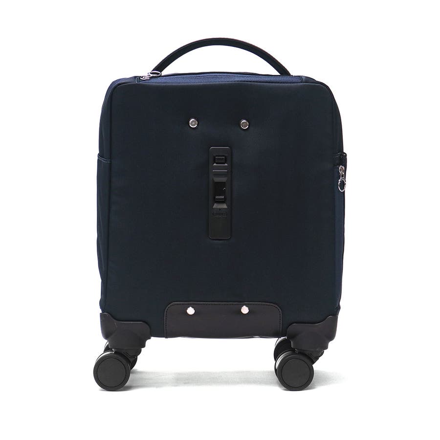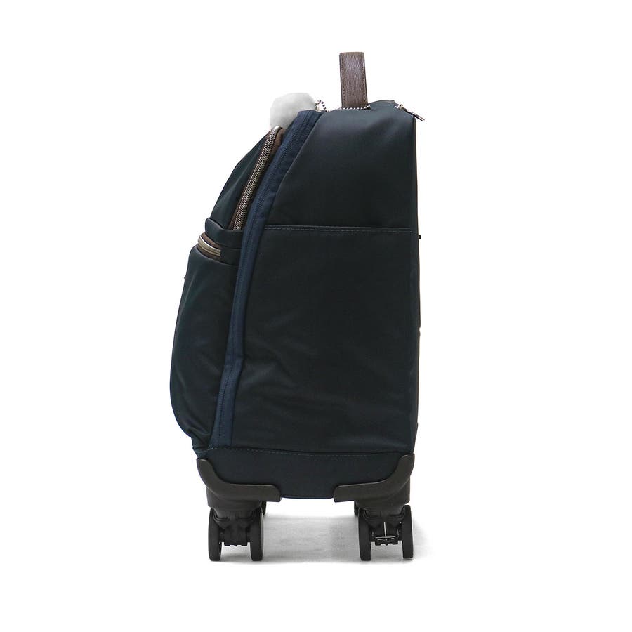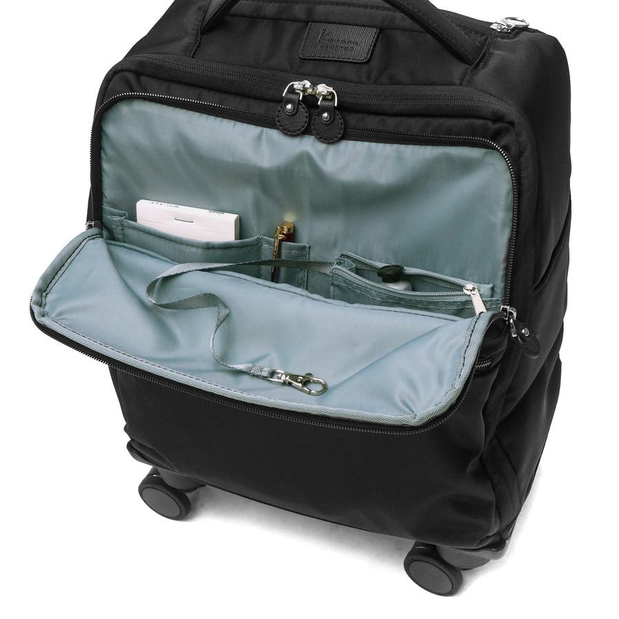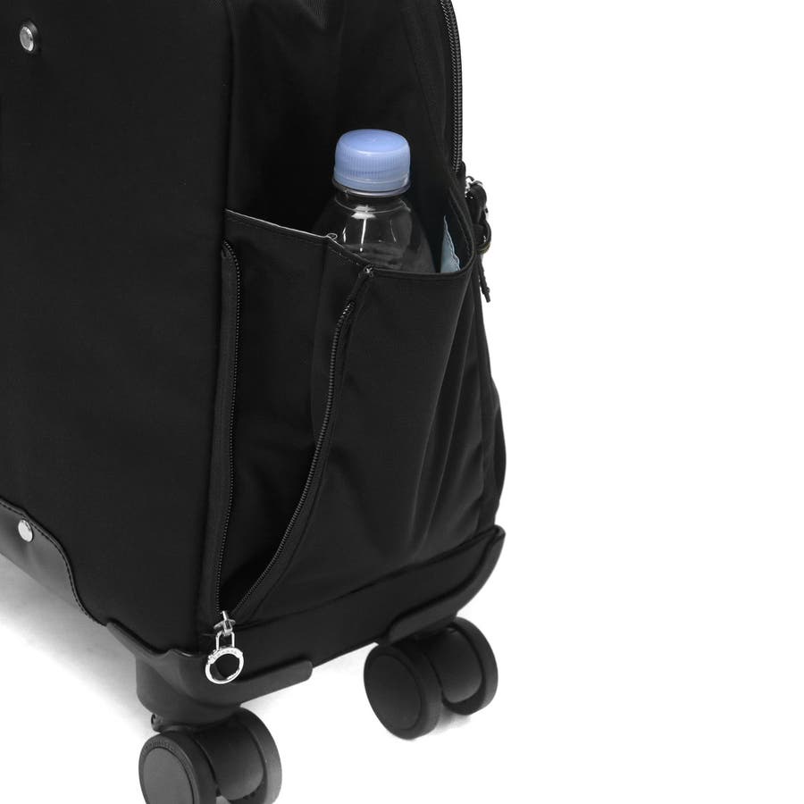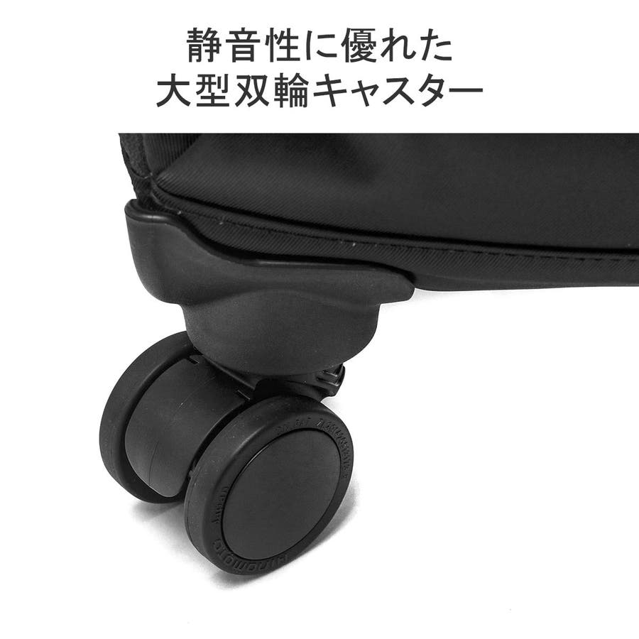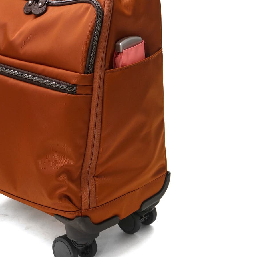 本体にはツイル生地を使用し、肌触りも滑らかで絶妙な光沢感が上品な印象を与えます。テフロン加工、PU加工を施しているので撥水・撥油性能に優れ、お手入れも簡単。メインファスナーは大きく開くダブルジップ仕様かつ、付属のTSA南京錠を取り付けることができてセキュリティ面も安心です。外側にはポケットが充実しているので使い勝手が良く、バッグ感覚で小物を整理できます。また、使わない際にしまっておける格納式のキャリーバーや、ワンタッチで車輪を固定できるキャスターストッパーも便利なポイントです。