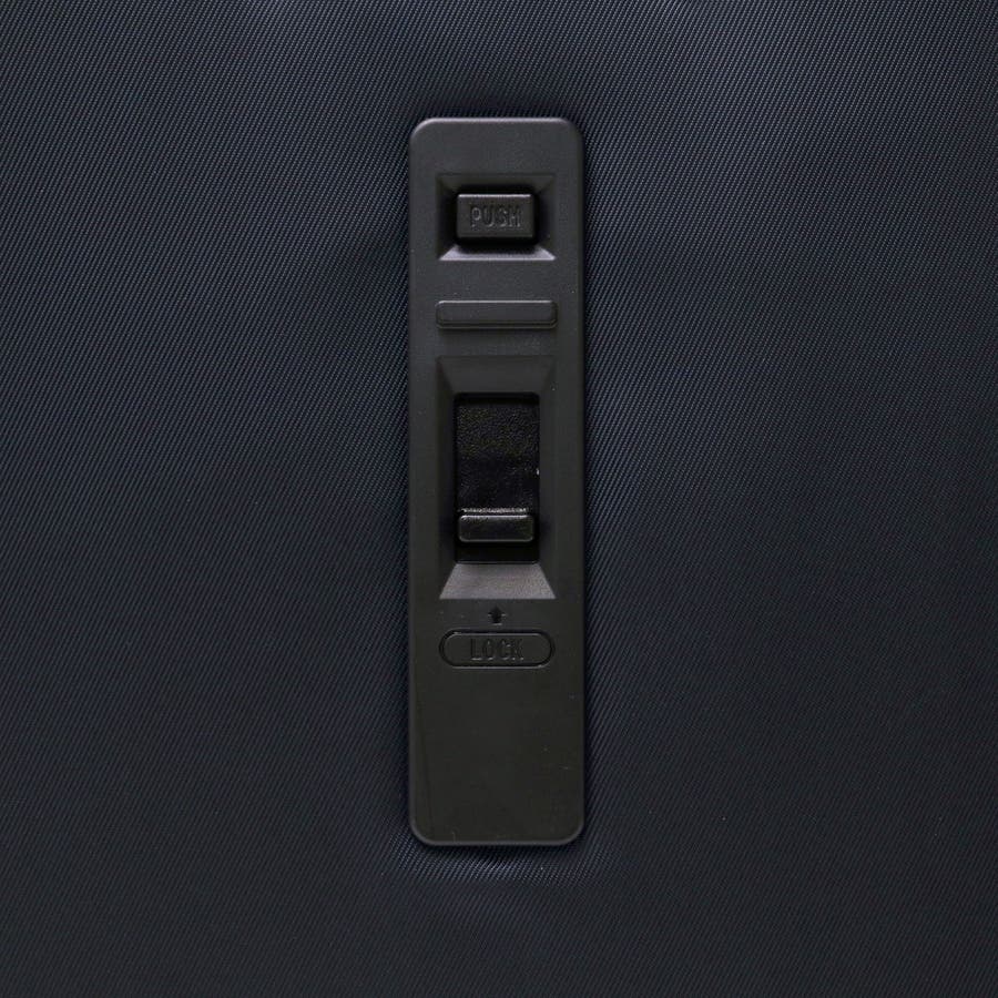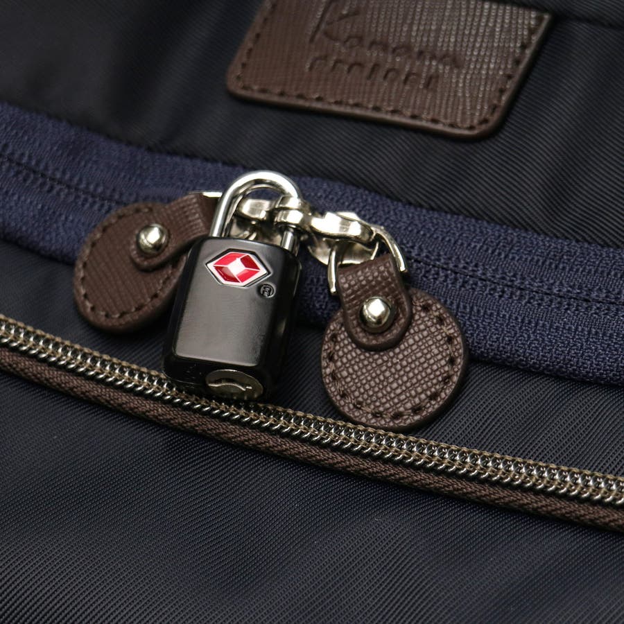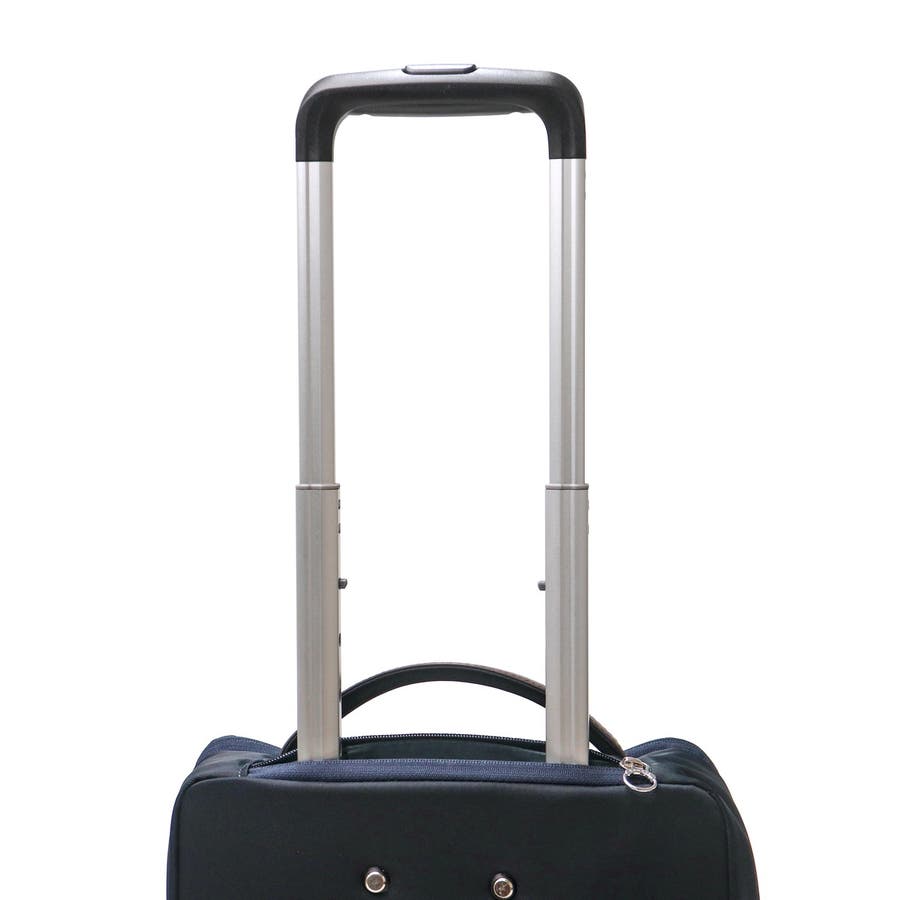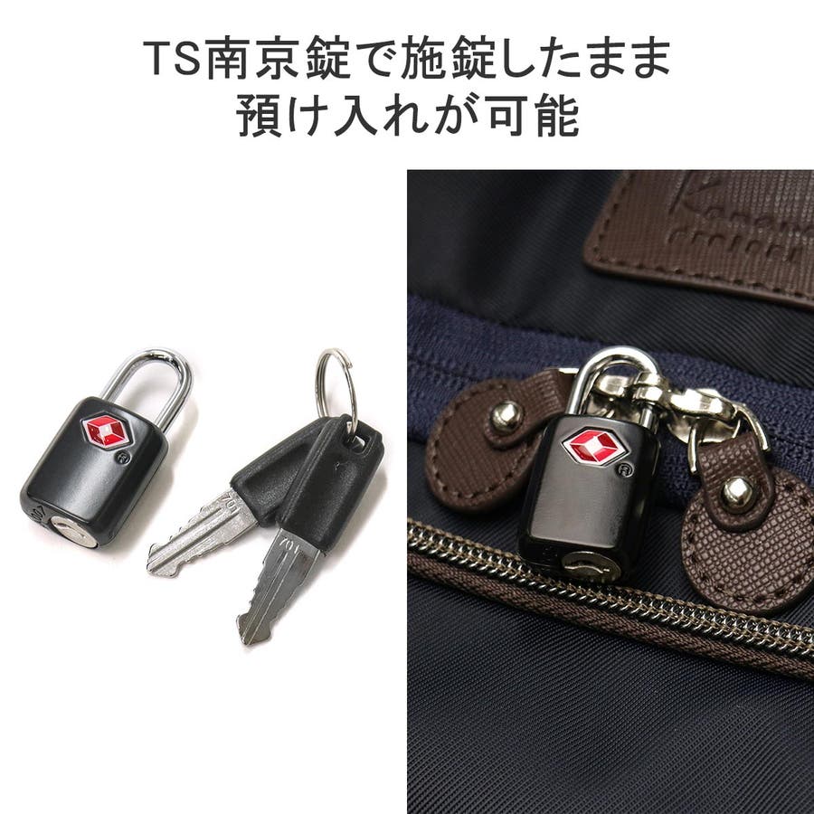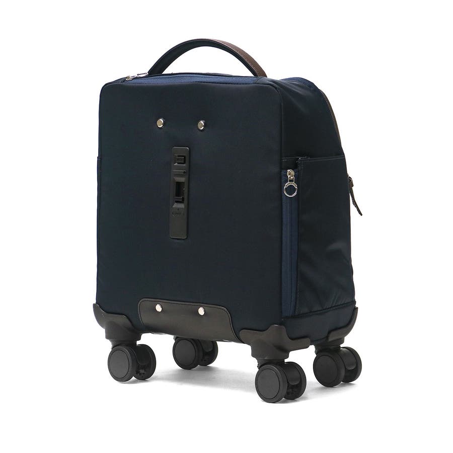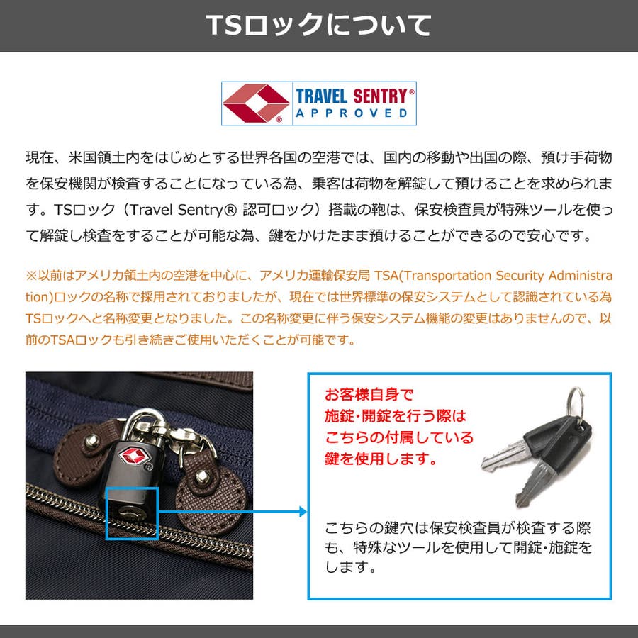本体にはツイル生地を使用し、肌触りも滑らかで絶妙な光沢感が上品な印象を与えます。テフロン加工、PU加工を施しているので撥水・撥油性能に優れ、お手入れも簡単。メインファスナーは大きく開くダブルジップ仕様かつ、付属のTSA南京錠を取り付けることができてセキュリティ面も安心です。外側にはポケットが充実しているので使い勝手が良く、バッグ感覚で小物を整理できます。また、使わない際にしまっておける格納式のキャリーバーや、ワンタッチで車輪を固定できるキャスターストッパーも便利なポイントです。