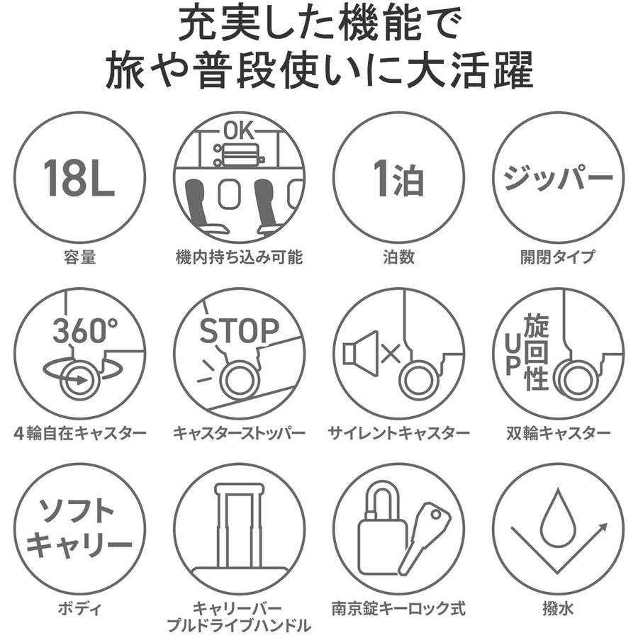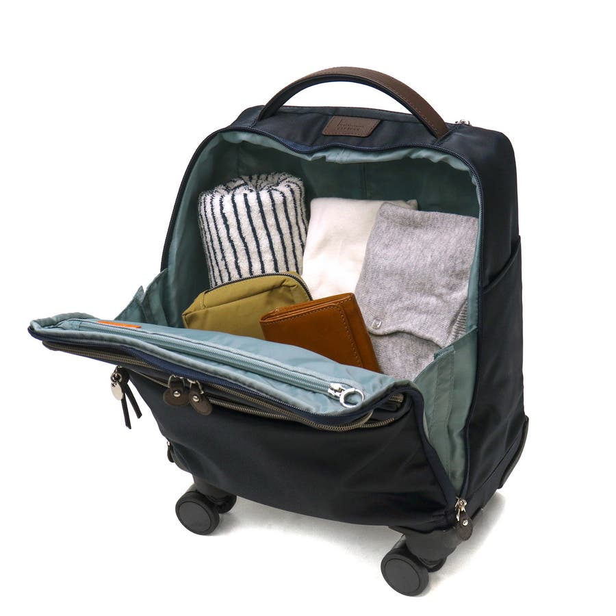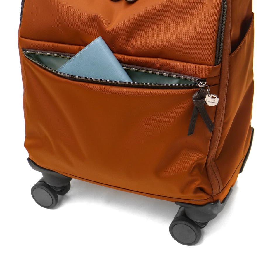 お出かけに嬉しい充実した機能が魅力の『カナナマイトローリー』シリーズ。こちらは容量約18Lの小ぶりなキャリーケースで、旅行だけでなく普段使いにもおすすめです。機内持ち込みサイズなのでフットワーク良く動け、静音キャスターを採用しているので移動時の音を抑えられて快適に過ごせます。奥行があるので厚みのある物もたっぷり収まり、お稽古ごとの道具類を入れたり、重たい荷物を運んだりと様々なシーンで活躍すること間違いなしのアイテムです。
