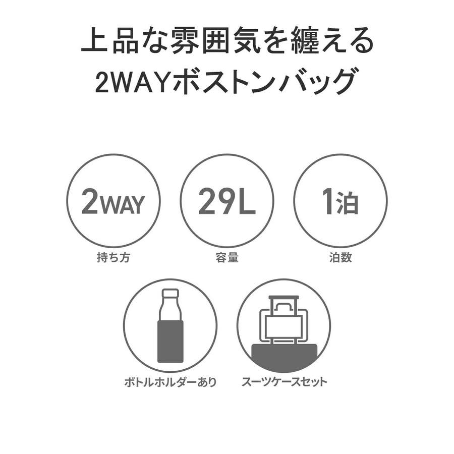 | 上品な雰囲気を纏える 2WAYボストンバッグ デイリー使いからトラベルまで幅広く活躍するバッグシリーズ『ルフレ』の2WAYボストンバッグ。きれいめなスタイルにも合わせやすい、上品な光沢感のある素材を使用したとても軽量なアイテムです。内装には複数のポケットとボトルホルダーが完備され、細々としたアイテムを仕分けて収納可能。付属のショルダーストラップを取り付けることで、肩掛けや斜めがけなど気分やコーデに合わせて持ち方をアレンジできます。 |