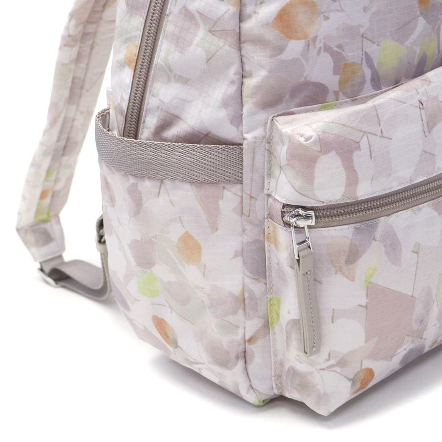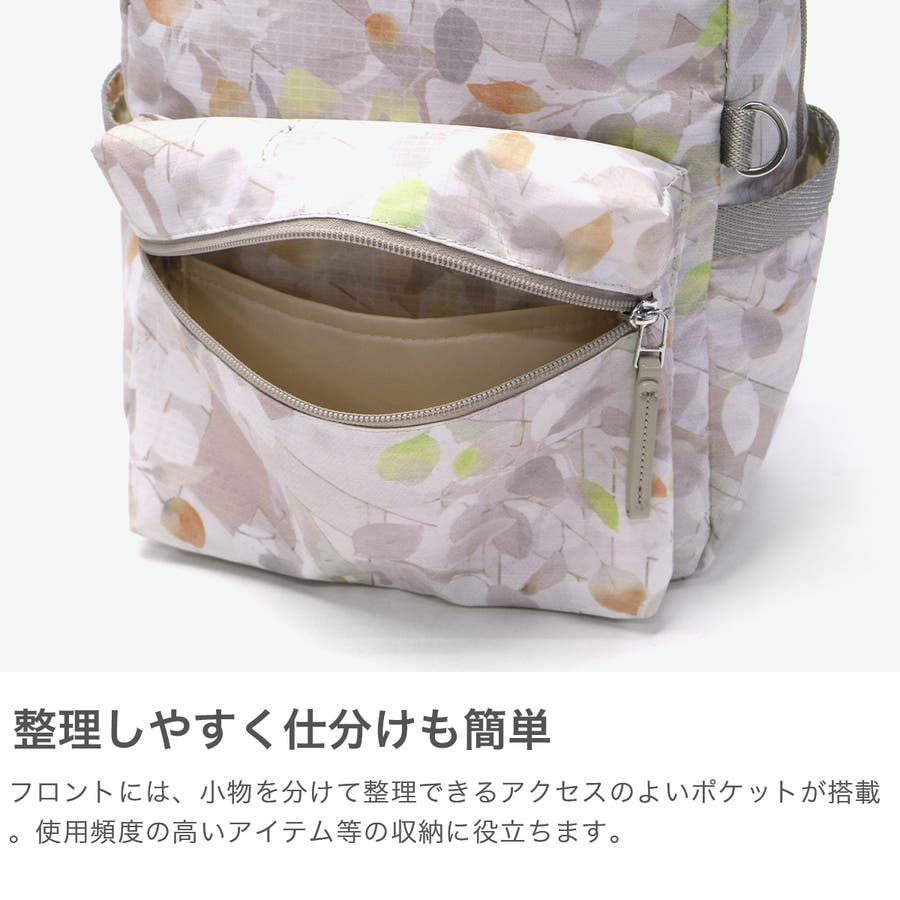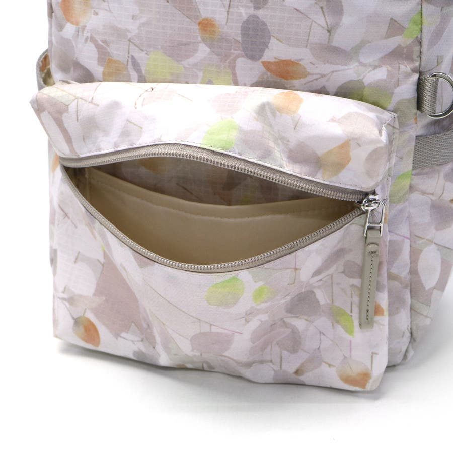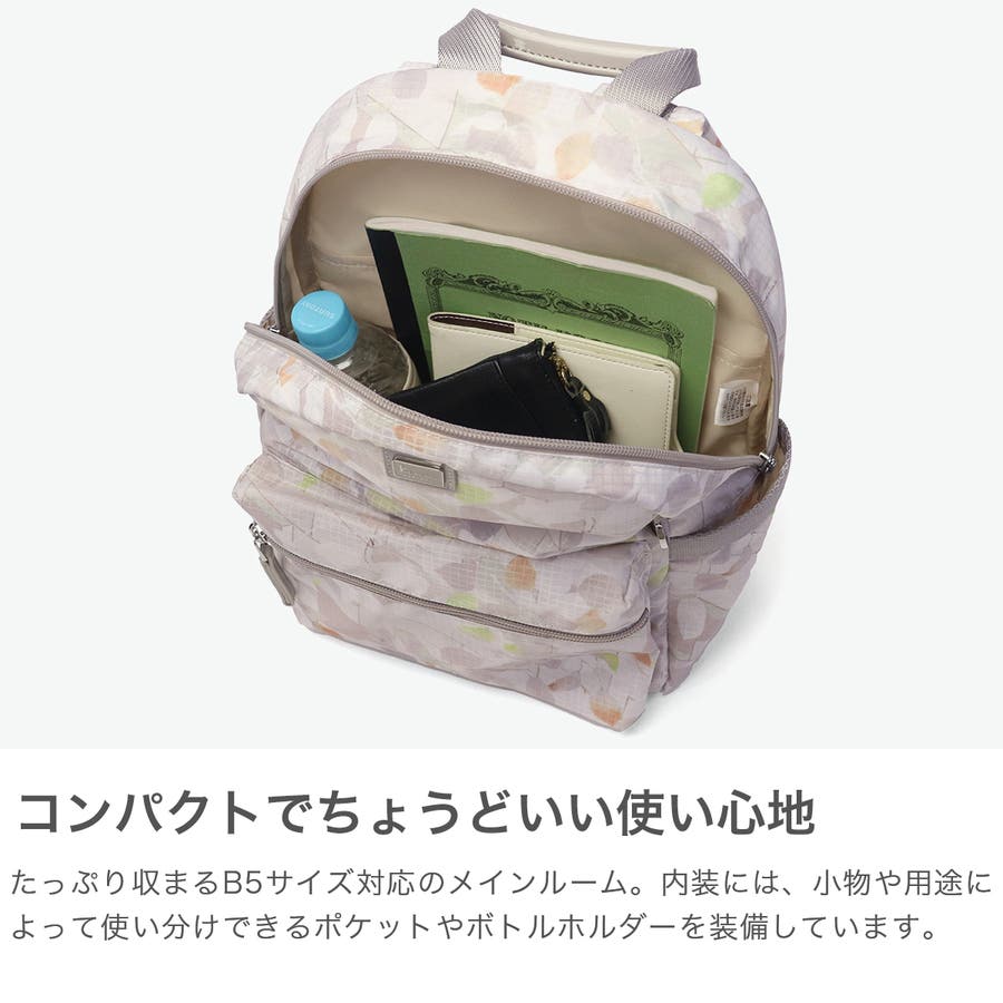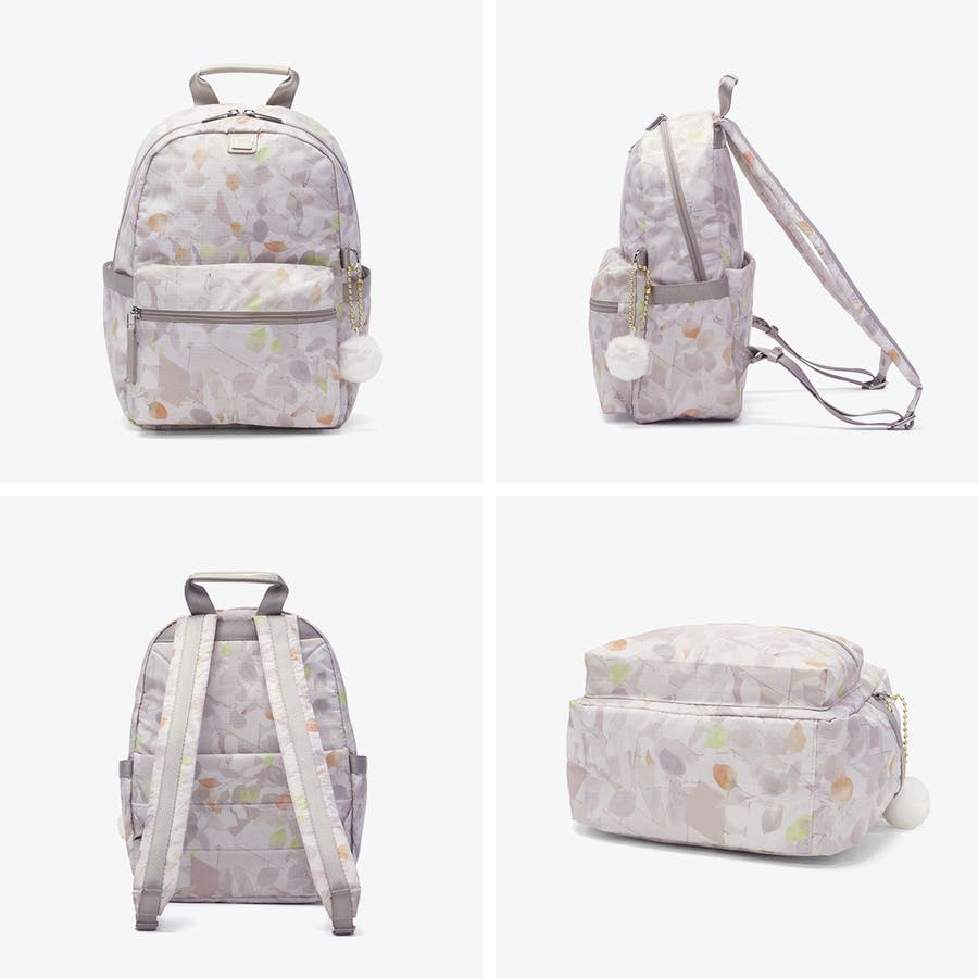 デイリーからトラベルまで幅広く活躍するカジュアルシリーズより、上品な光沢感のある素材を採用した、きれいめスタイルにもなじむリュックサックが登場。B5サイズ対応・13L容量で、通勤やお出かけにちょうどいい使いやすさです。やさしいボタニカル柄が、大人のスタイルにさりげない彩りを添えます。