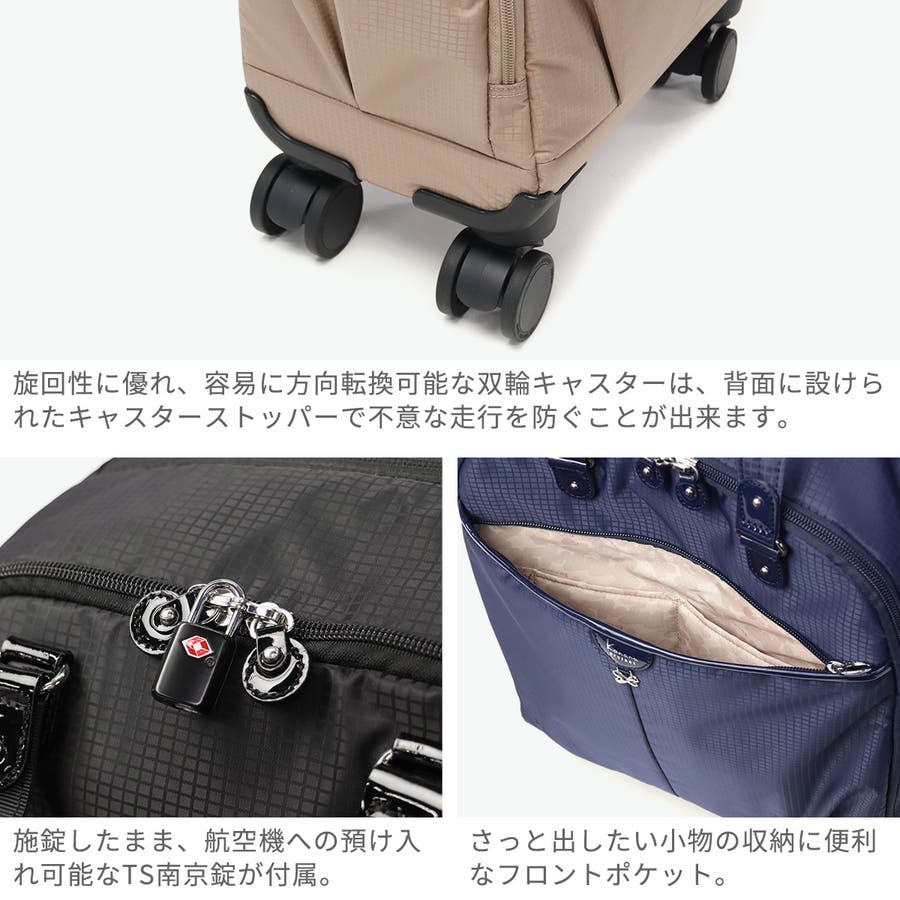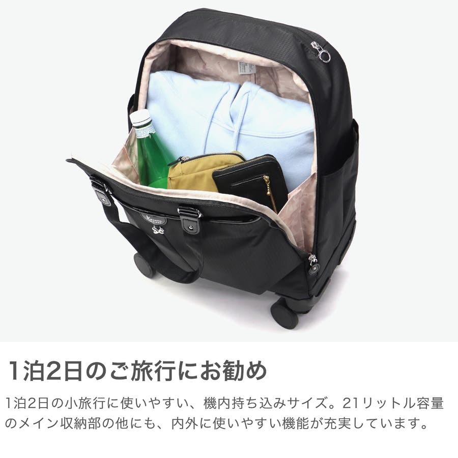 トラベルシーンや日常使いに便利なソフトキャリーバッグ。容量21Lで小旅行にオススメのコンパクトサイズです。キャスターストッパー付きなど機能面でも安心の設計で、旅行でのご使用はもちろん、お買い物時にも活躍してくれる実用性の高いアイテムとなっています。
