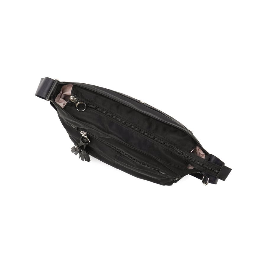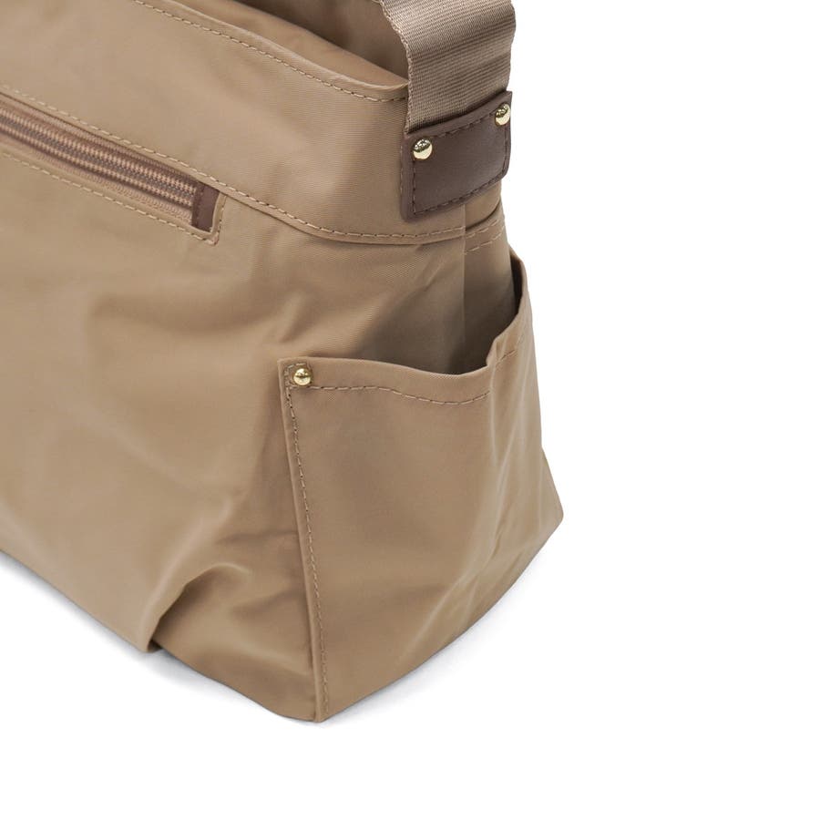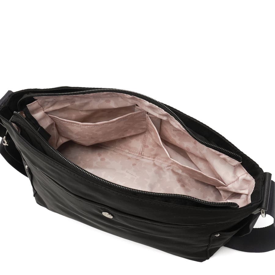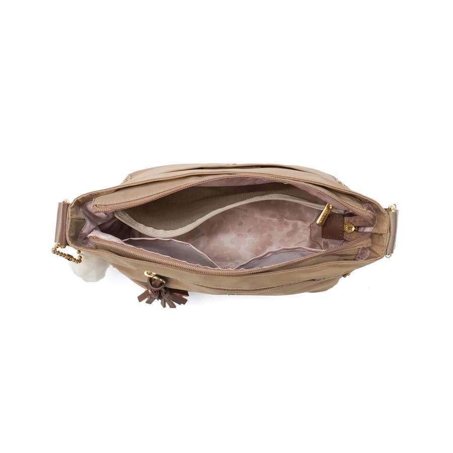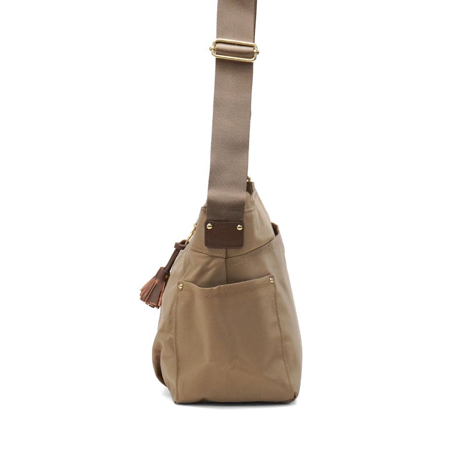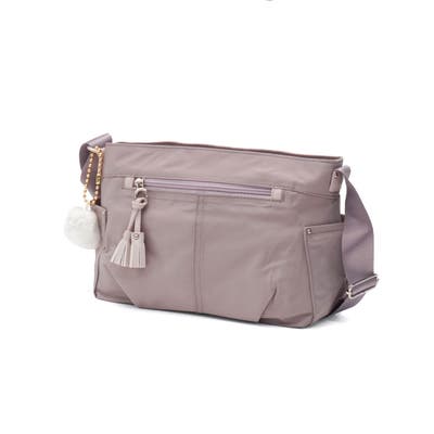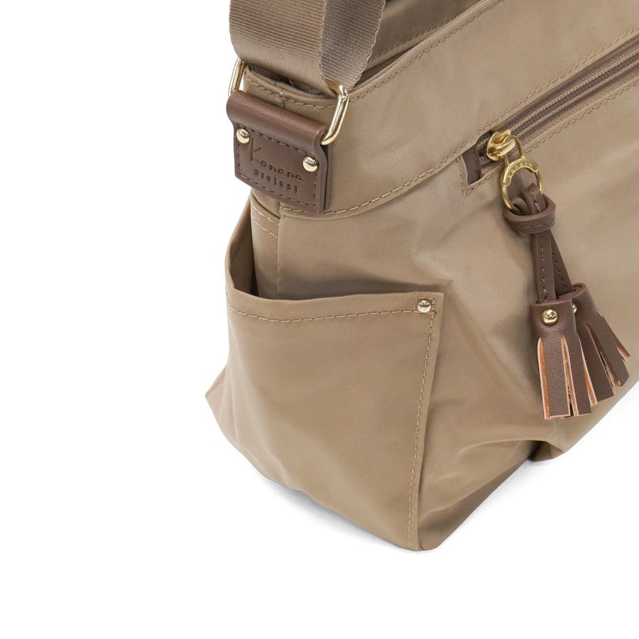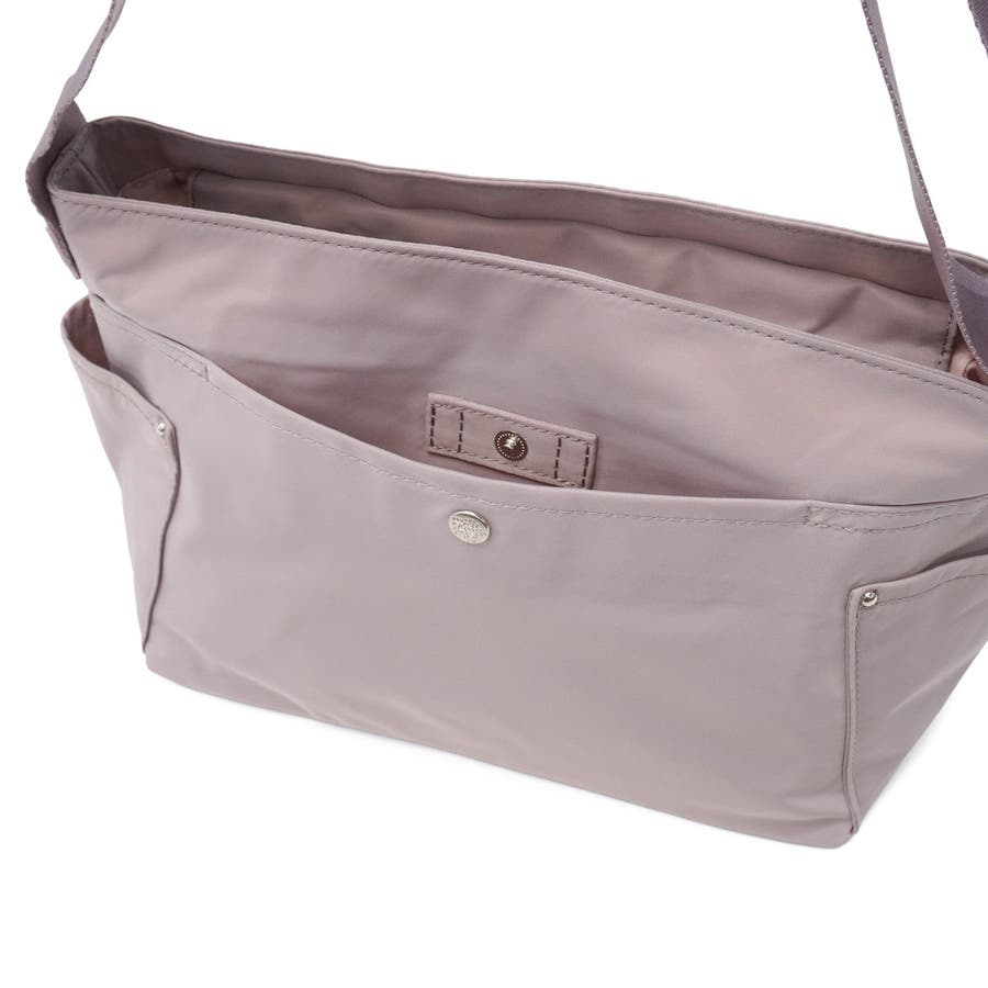 小さなタッセルをあしらったカジュアルバッグシリーズ『タッセル』から登場した横型ショルダーバッグ。ツヤ感ナイロン×フェイクレザーで上品に仕上げ、タック入りのふんわりシルエットが魅力。内装はピンクをベースにした木漏れ日柄で明るい印象。コンパクトなサイズながら、6L容量でポケットも充実。毎日使いから旅行まで幅広く活躍するアイテムです。