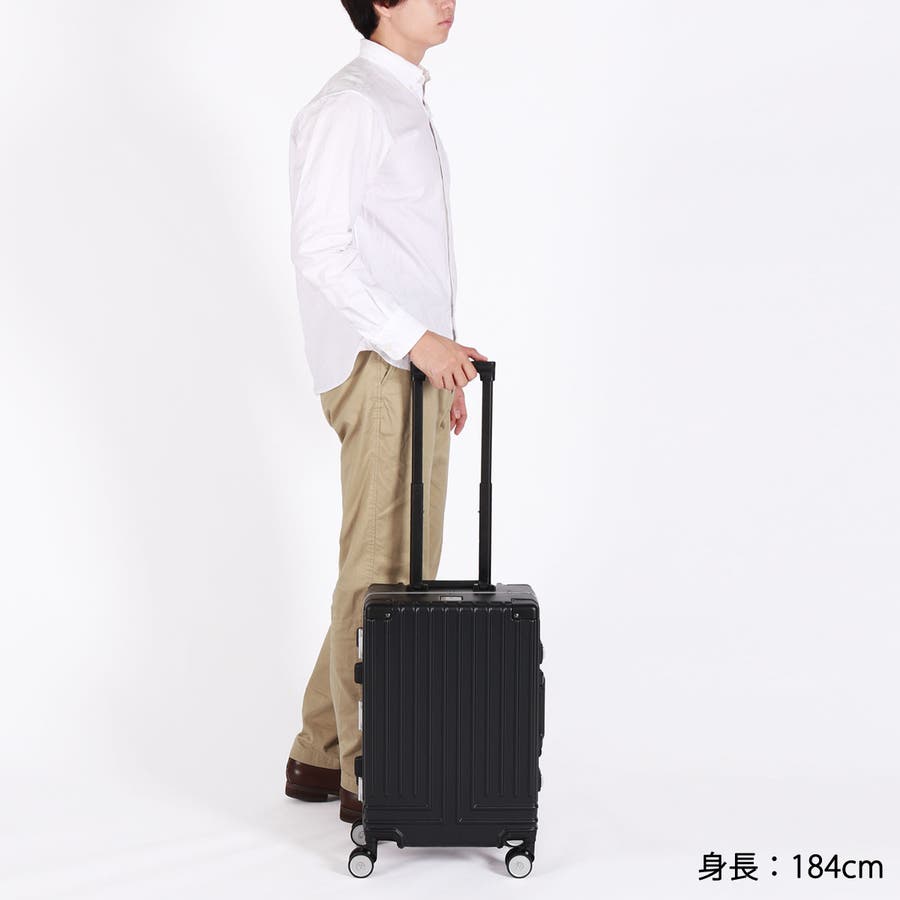 ブランドアイコンを全体に施し、スタイリッシュな印象を与えるフレームタイプのキャリーケース。こちらは、持ち込み可能サイズです。軽量で丈夫なPPE素材と強度を高めるアルミフレームを採用。3段階調整キャリーバーや、360°回転キャスターを搭載し、快適な移動をサポートします。
