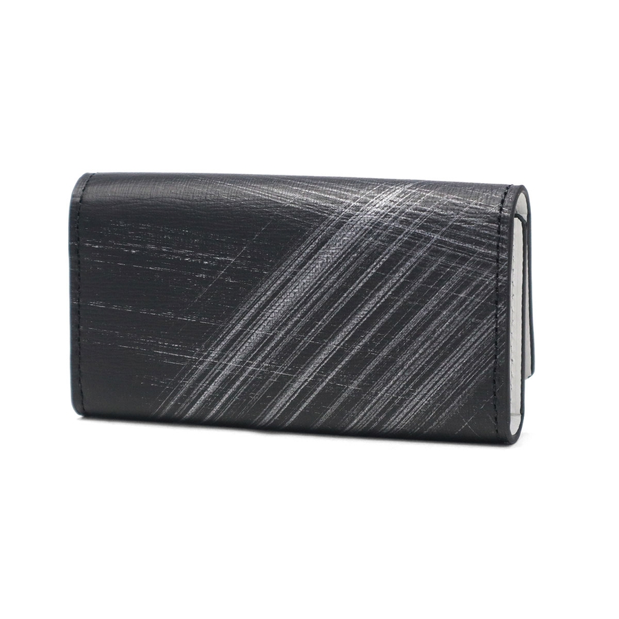 型押し牛革にシルバーの刷毛ムラプリントを施した、エレガントなキーケース。シルバープリントと角に施したクリアブローチは、光を通したり反射したりと、ダウンライトや太陽の下で映えるデザインに。ブローチの仕様は面を取っているため手触りがよく、樹脂の中にゴム成分を配合することによって割れにくい仕上がりになっているので、安心してお使いいただけます。