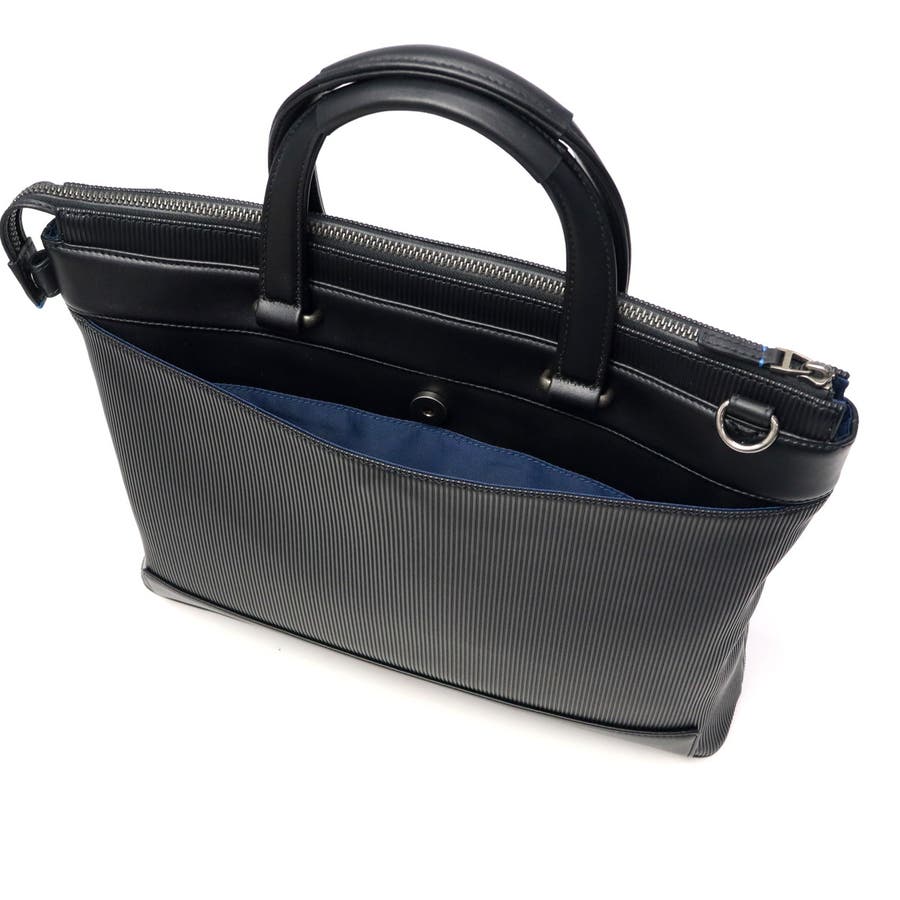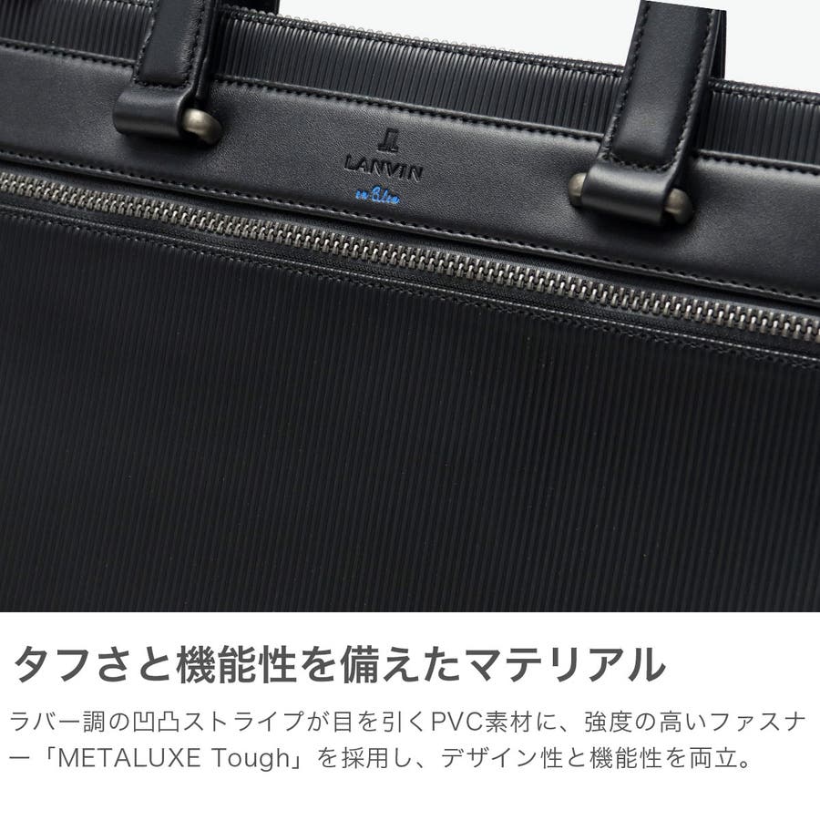 ラバー調の凹凸が特徴的なPVC素材を使用した『バンプ』シリーズのビジネスバッグです。耐水性・耐摩耗性に優れた高強度素材で、機能性とデザイン性を両立。立体感のあるストライプ柄が都会的なビジカジスタイルを引き立てます。A4対応サイズでPC収納や多彩なポケットを装備。手持ちと肩がけの2WAY仕様で、通勤から出張までスマートに活躍します。