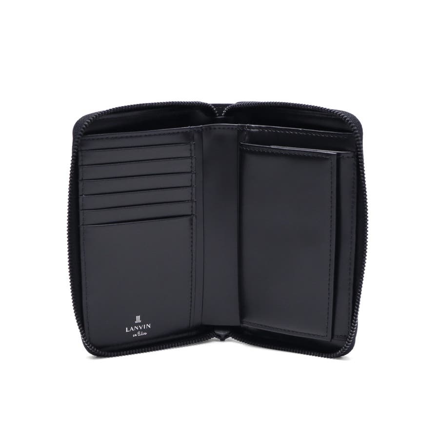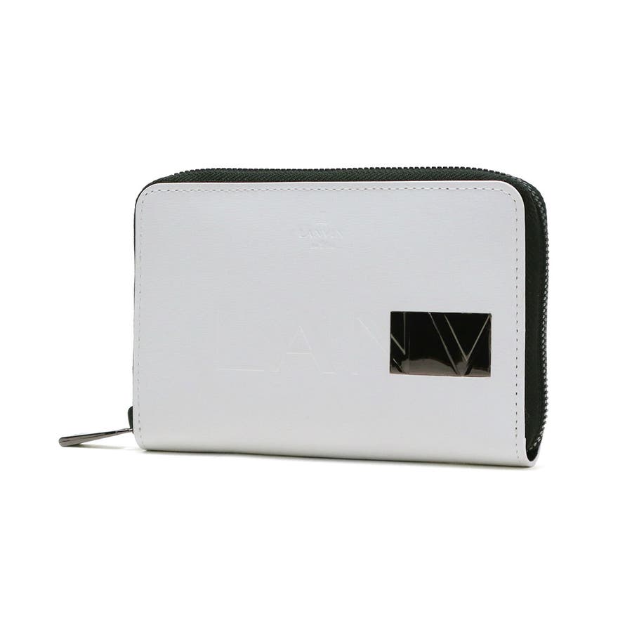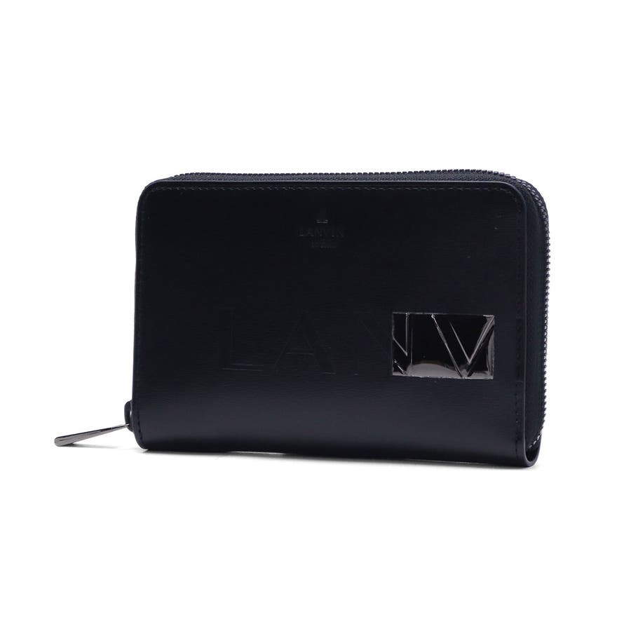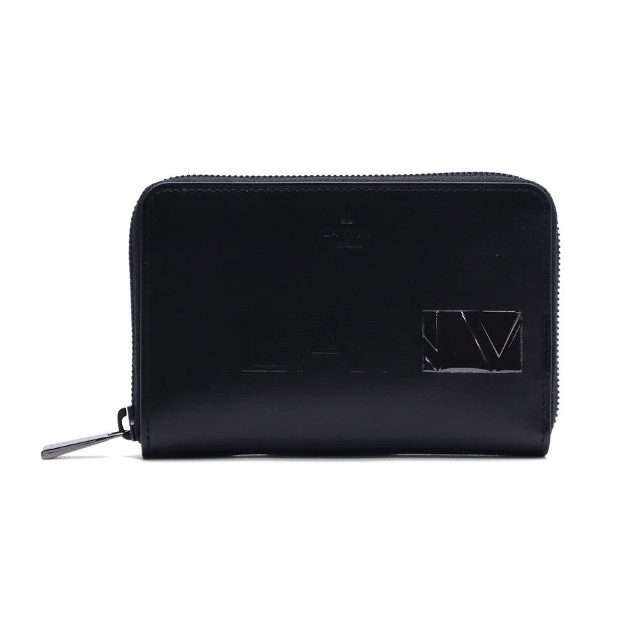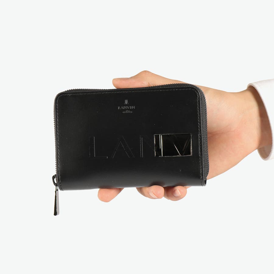 LANVIN en Bleuの楽しさを表現した小物シリーズ『ディアブロ』の二つ折り財布。立体的な型押しロゴと金具プレートと繋がっているように見えるデザインが印象的。ロゴはさらに背面へと回り込み、存在感とデザイン性を際立たせています。素材には細かな型押しが施されているため、傷がつきにくいのも魅力です。