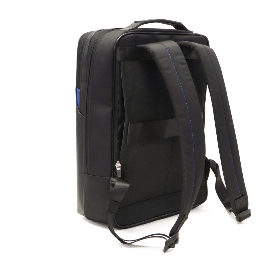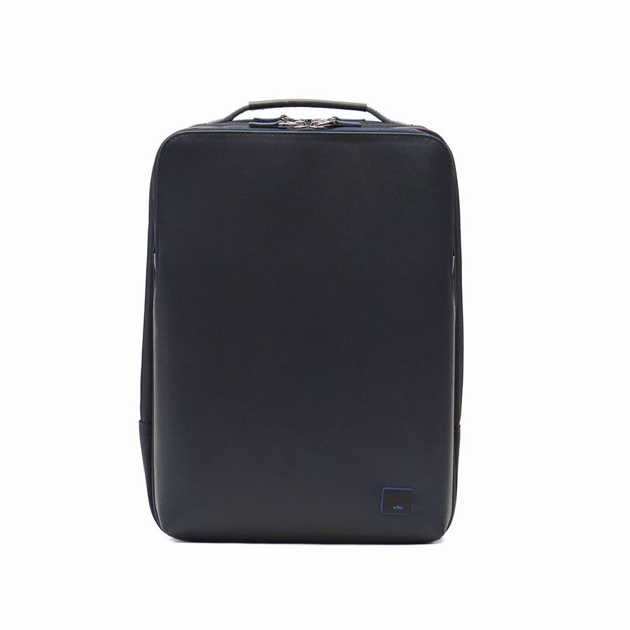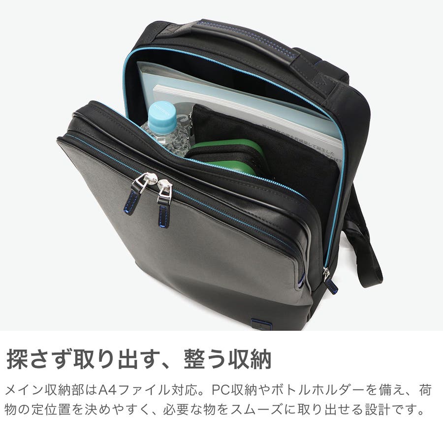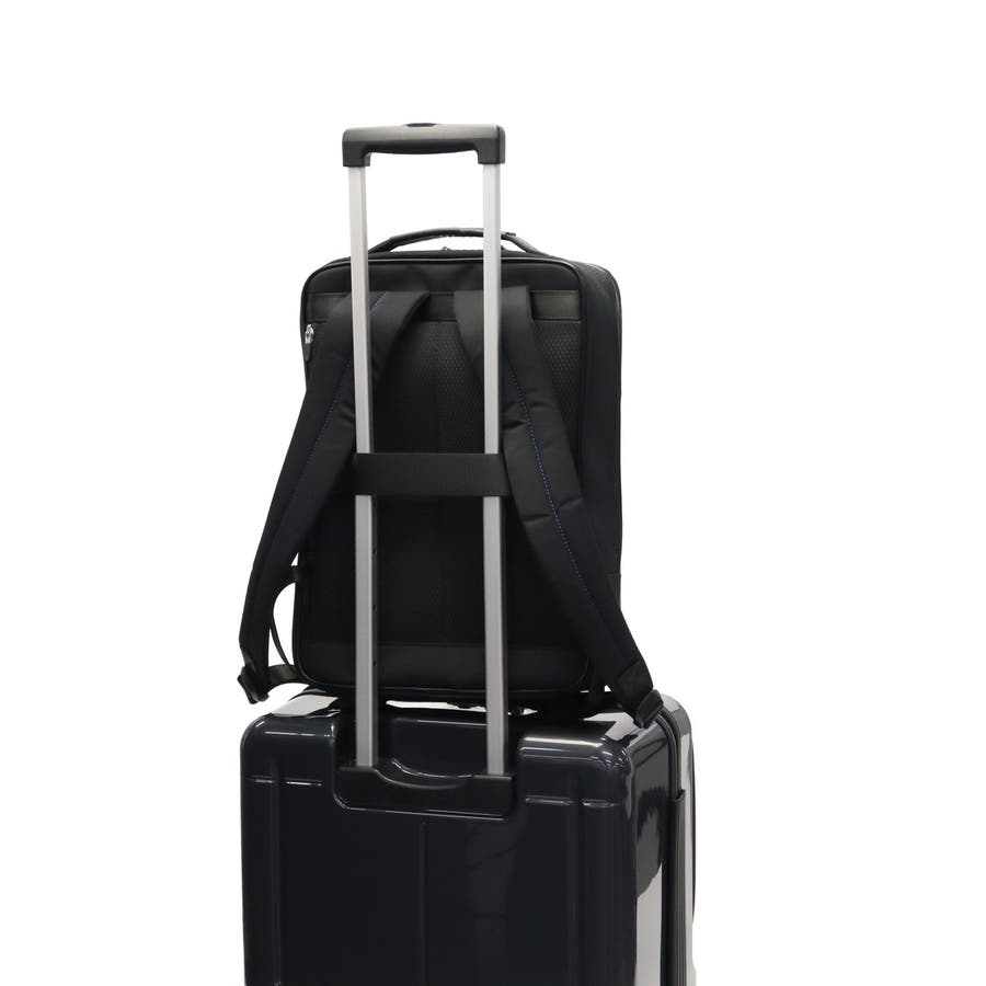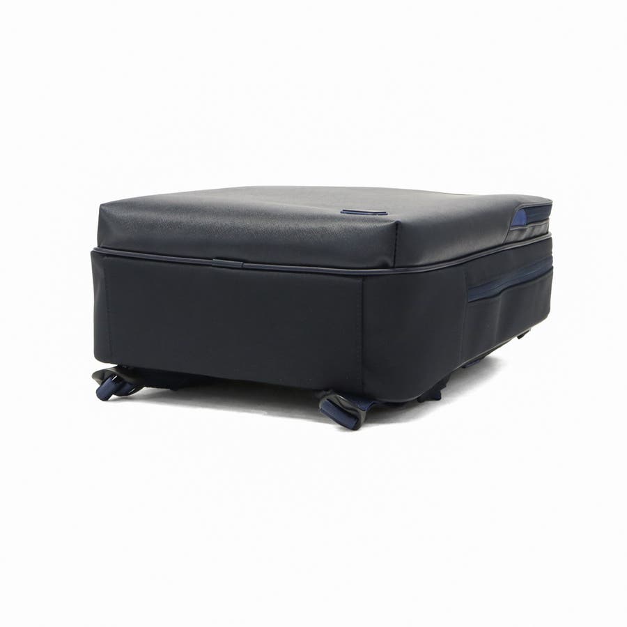 水に強いサフィアーノPVC素材を使用した『ホームズ』シリーズのA4ビジネスリュック。ファスナーやステッチ、ロゴプレートのブルーのアクセントが効いた、ブランドらしい仕上がりです。スマートなデザインながらPC収納や多彩なポケットを備え、通勤から出張まで活躍します。