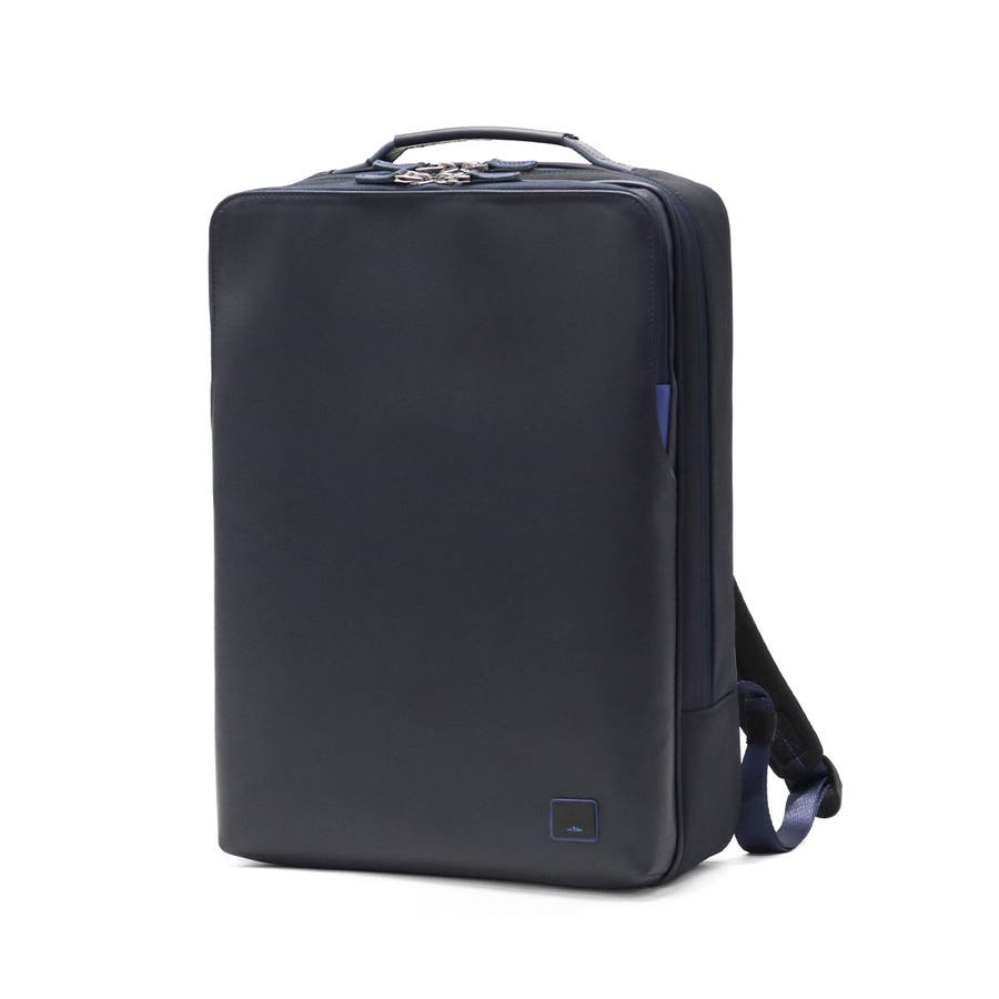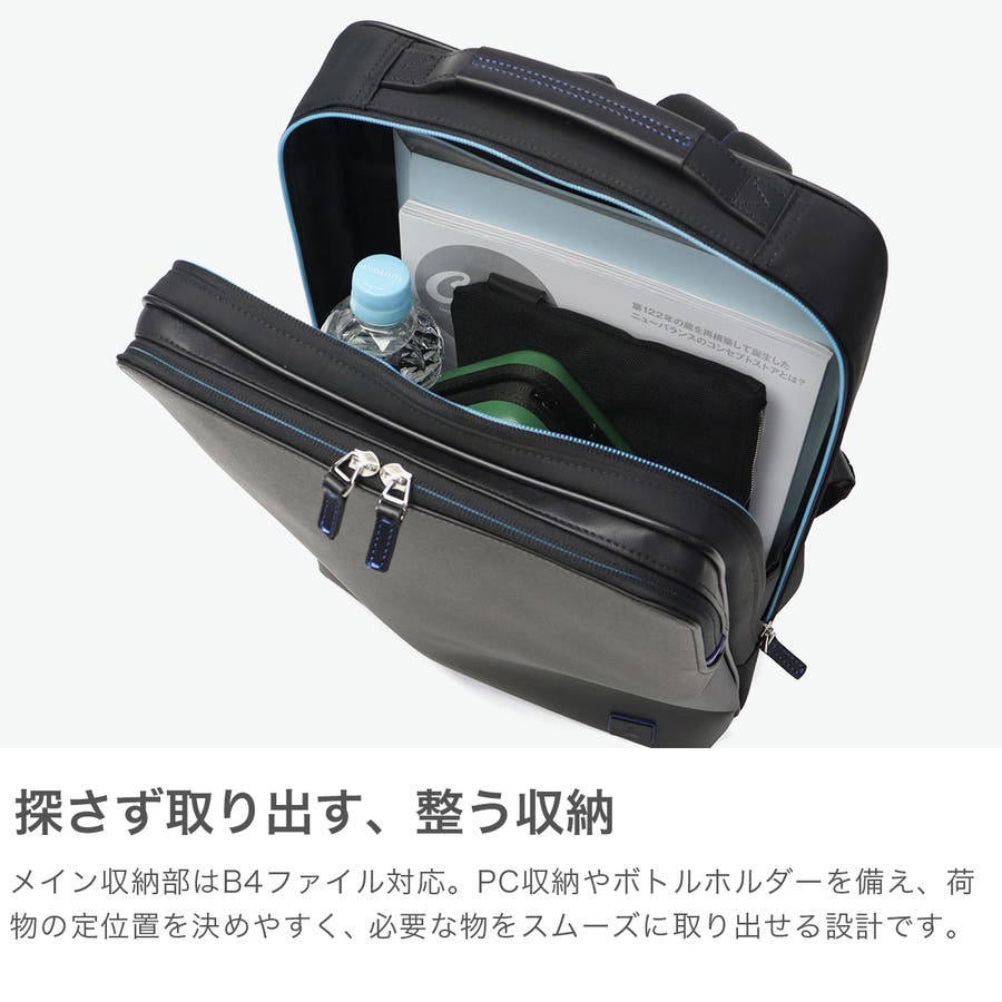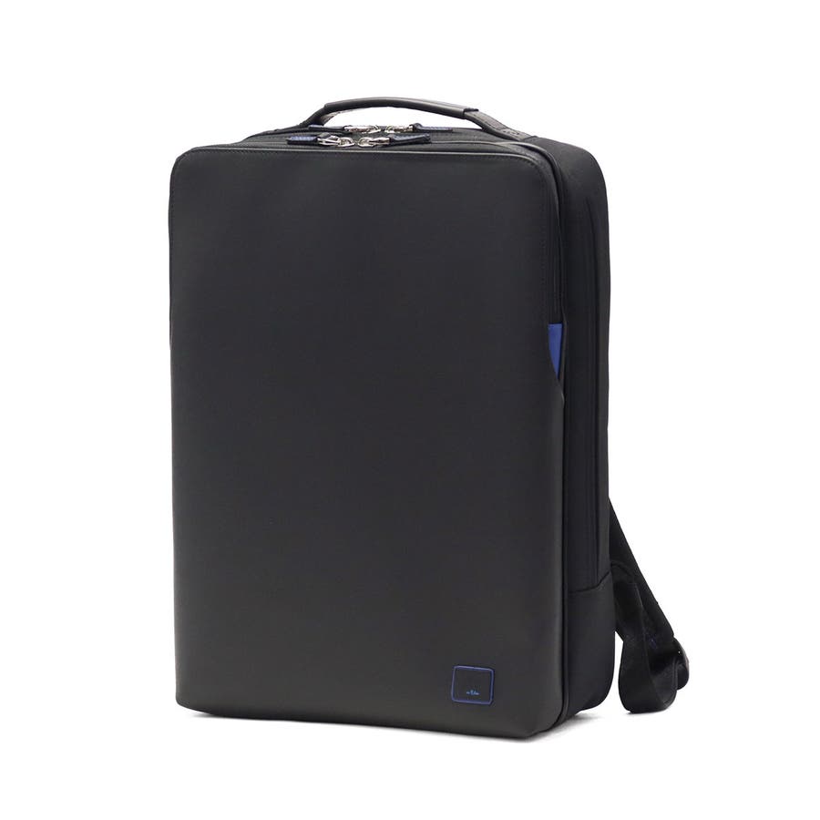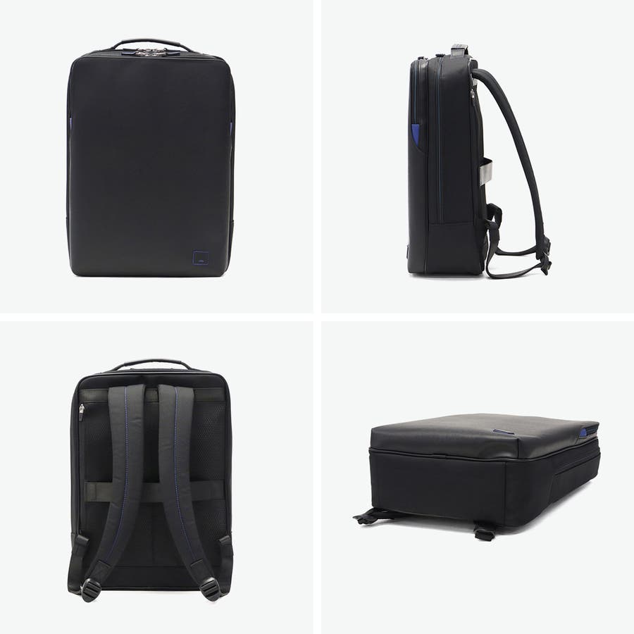 水に強いサフィアーノPVC素材を使用した『ホームズ』シリーズのB4ビジネスリュック。ファスナーやステッチ、ロゴプレートのブルーのアクセントが効いた、ブランドらしい仕上がりです。スマートなデザインながらPC収納や多彩なポケットを備え、通勤から出張まで活躍します。