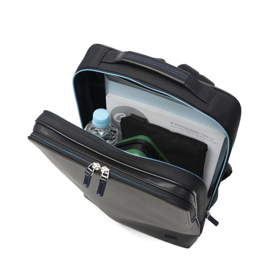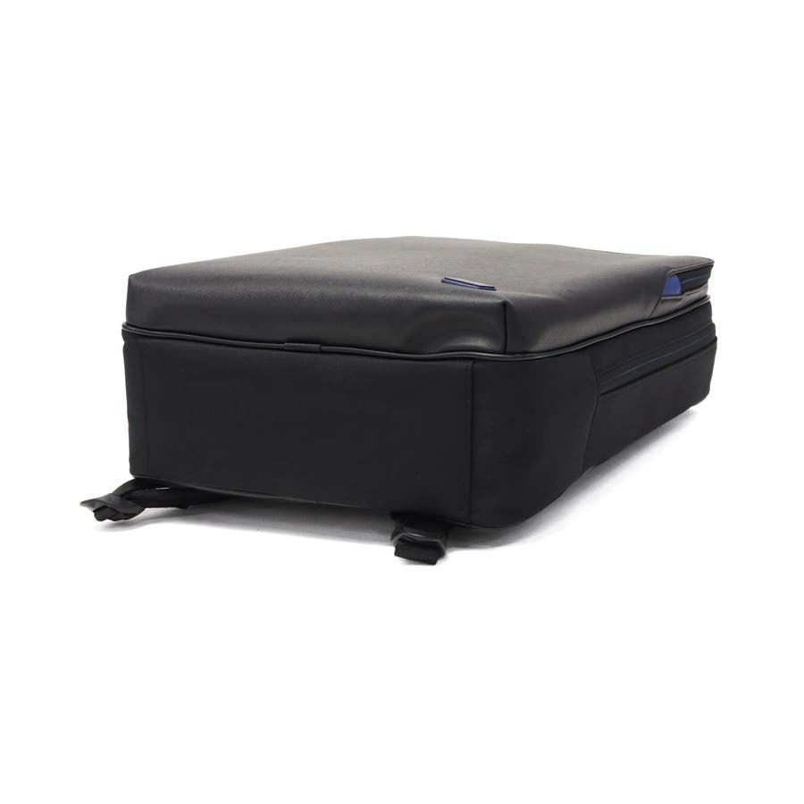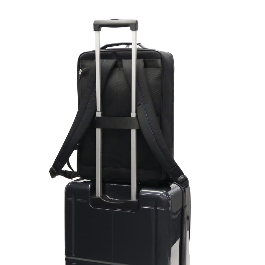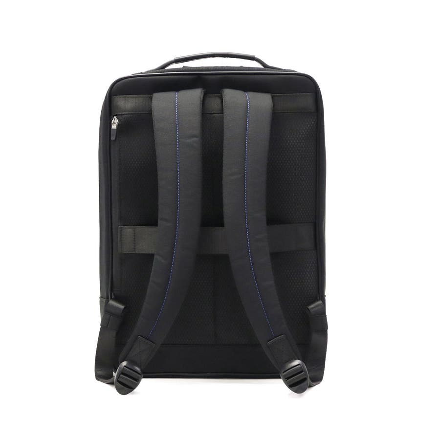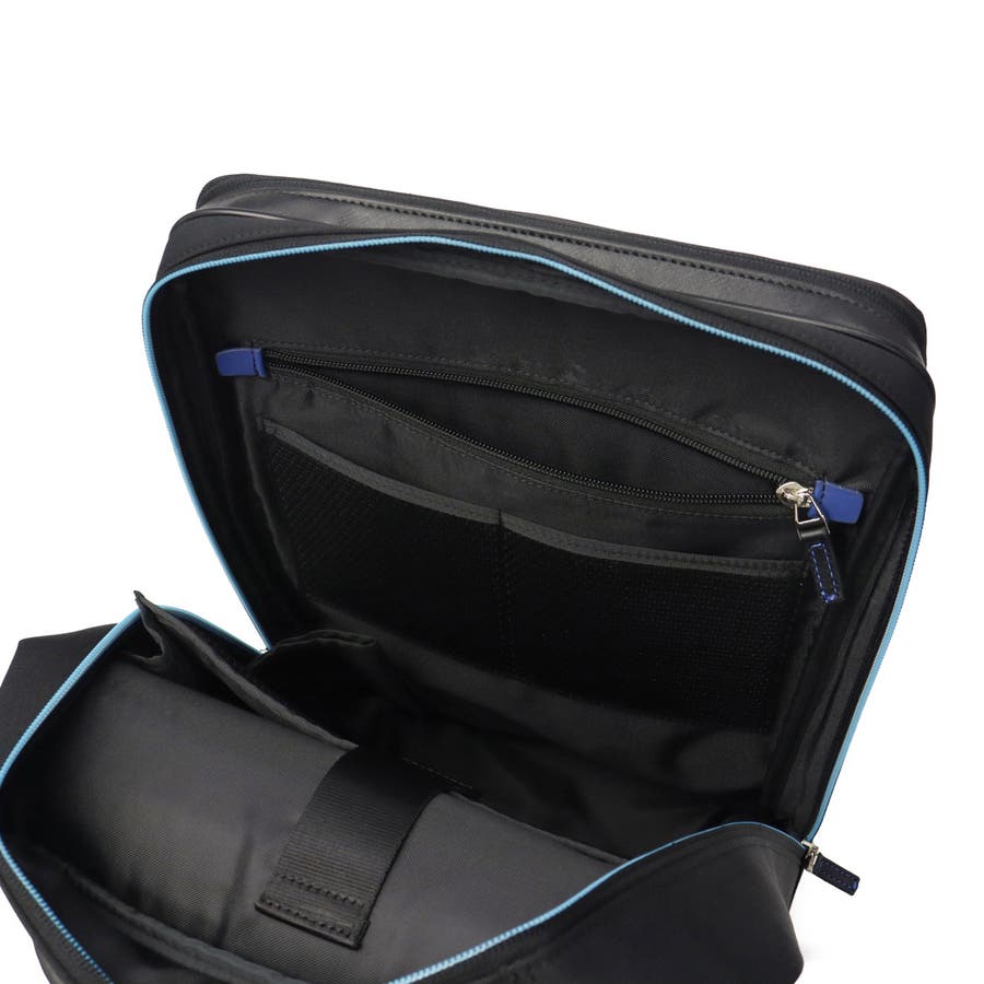 水に強いサフィアーノPVC素材を使用した『ホームズ』シリーズのB4ビジネスリュック。ファスナーやステッチ、ロゴプレートのブルーのアクセントが効いた、ブランドらしい仕上がりです。スマートなデザインながらPC収納や多彩なポケットを備え、通勤から出張まで活躍します。