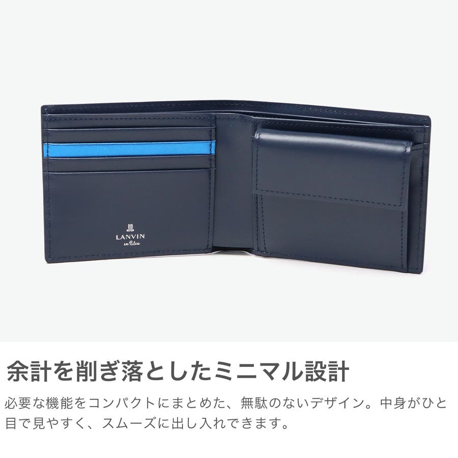 シックで上品な艶感が魅力のガラスレザーに部分的にサフィアーノ調のエンボス加工を施し、アパレル等で多用されるLANVIN en Bleuらしい切り替えを表現した『パーシャル』シリーズの二つ折り財布です。光をイメージしたメタリックブルーカラーを内装の一部分に使用することで、スタイリッシュで洗練されたデザインに仕上げています。コンパクトながら、しっかりした収納力を備え、毎日をスマートに整える上質なアイテムです。