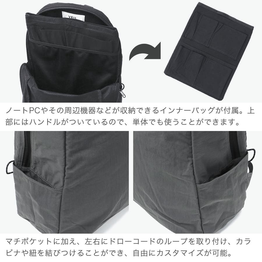 人気デザインユニット〈TENT〉と共同開発した『VEIL』は、「中身はそのまま、外側だけを着替える」という発想から生まれた機能的なバッグシリーズ。荷物を整理・保護するインナーバッグ(PCケース)と、シーンに応じて選べるアウターバッグを組み合わせ、柔軟な使い分けを実現します。本モデルは、「洗えるバッグ」として開発されたアウター(リュック)とインナーバッグのセット。大容量ながら、驚くほど軽量。インナーバッグを取り外して裏返せば、そのまま洗濯できます。インナーバッグは単体でも使用でき、ノートPCや周辺機器をすっきり整理できます。