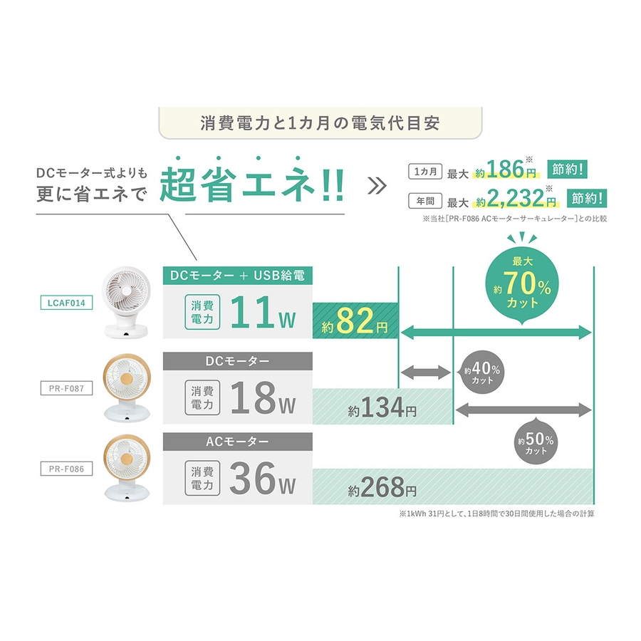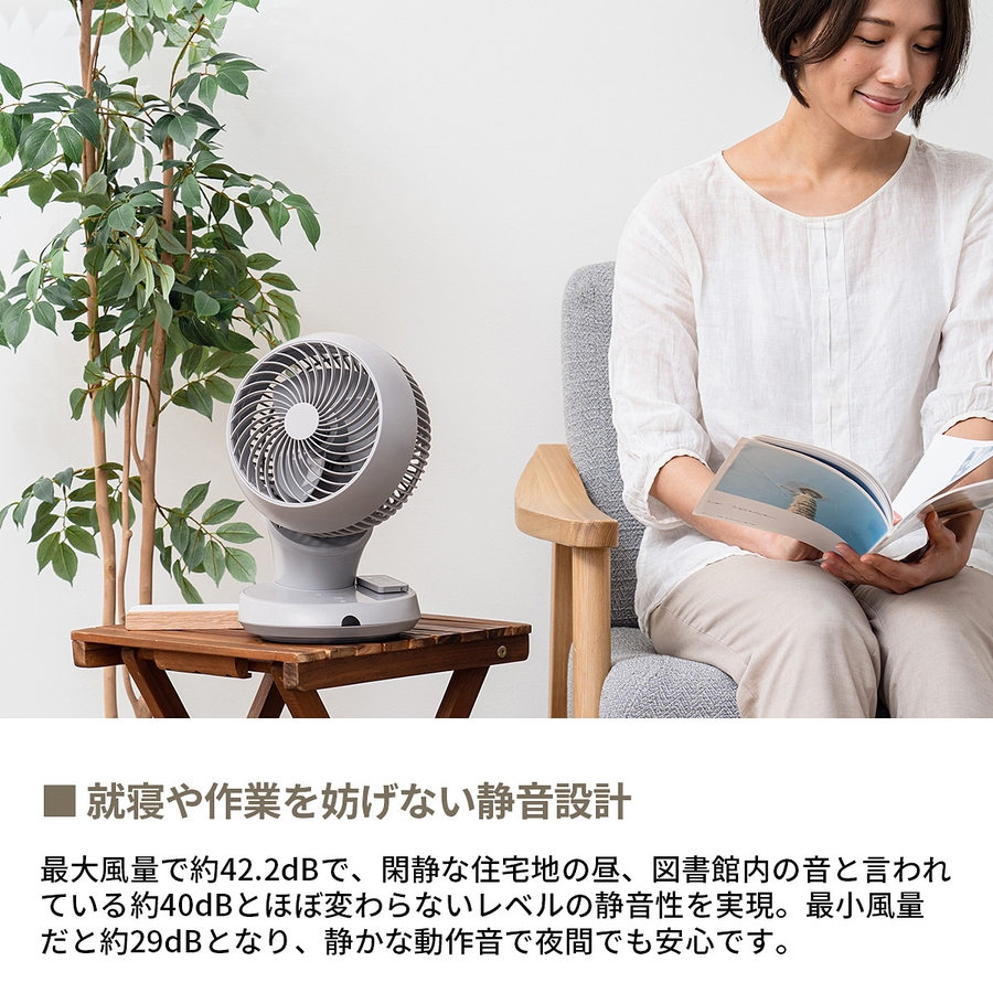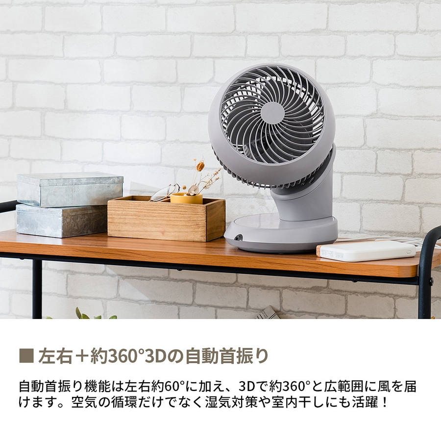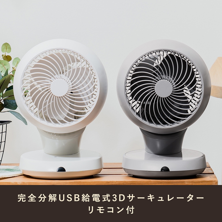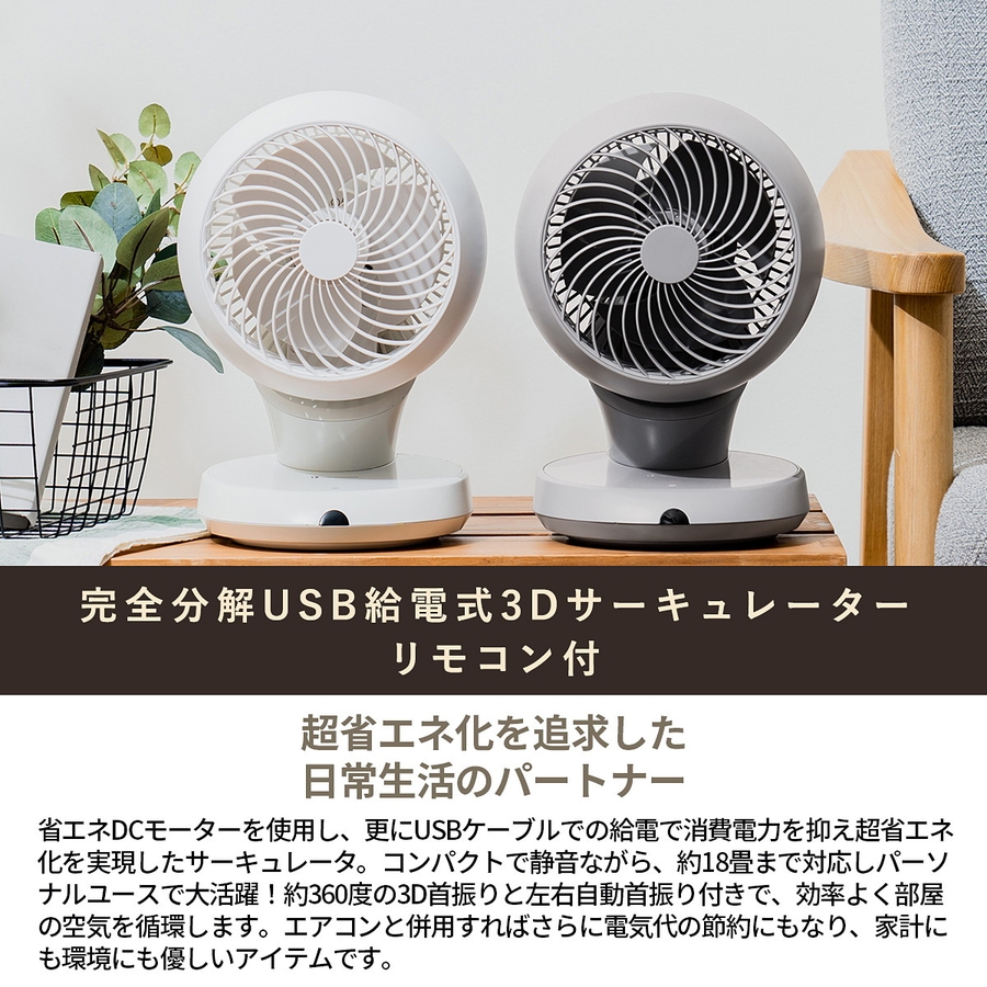 省エネDCモーターを使用し、更にUSBケーブルでの給電で消費電力を抑え超省エネ化を実現したサーキュレータ。コンパクトで静音ながら、約18畳まで対応しパーソナルユースで大活躍!約360度の3D首振りと左右自動首振り付きで、効率よく部屋の空気を循環します。エアコンと併用すればさらに電気代の節約にもなり、家計にも環境にも優しいアイテムです。