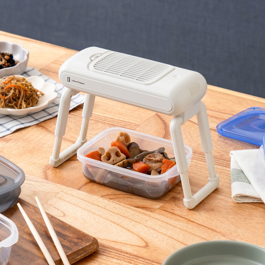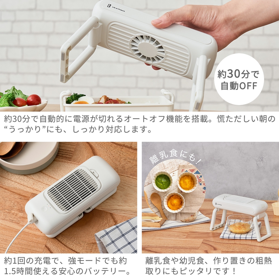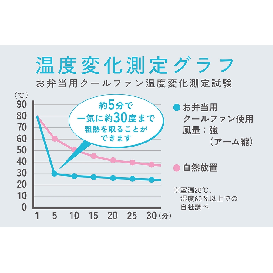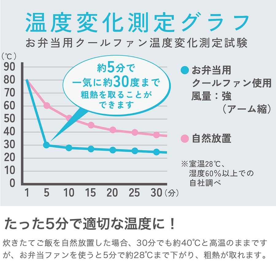 簡単にお弁当を冷ましたいけど時間がない!という忙しい朝にうってつけの「お弁当専用ファン」。お弁当の真上から全体的に直接送風するため、素早く効率的に粗熱を取ることが可能。炊きたてご飯も約5分で適切な温度まで冷ますことができます。