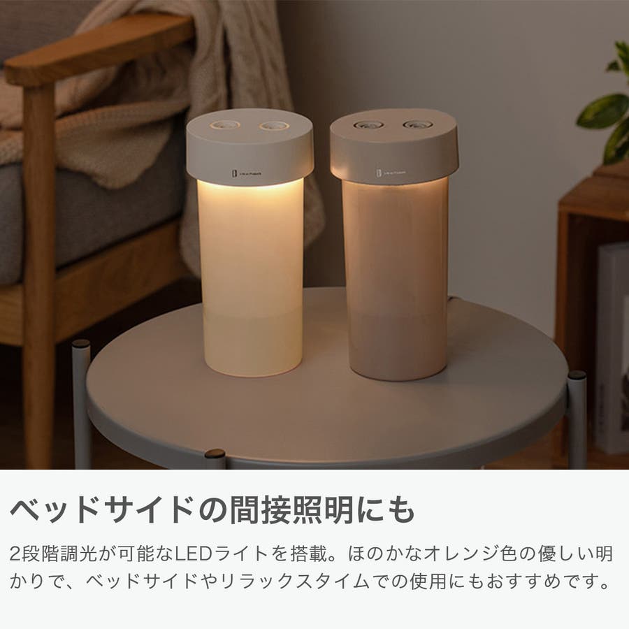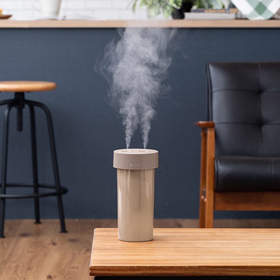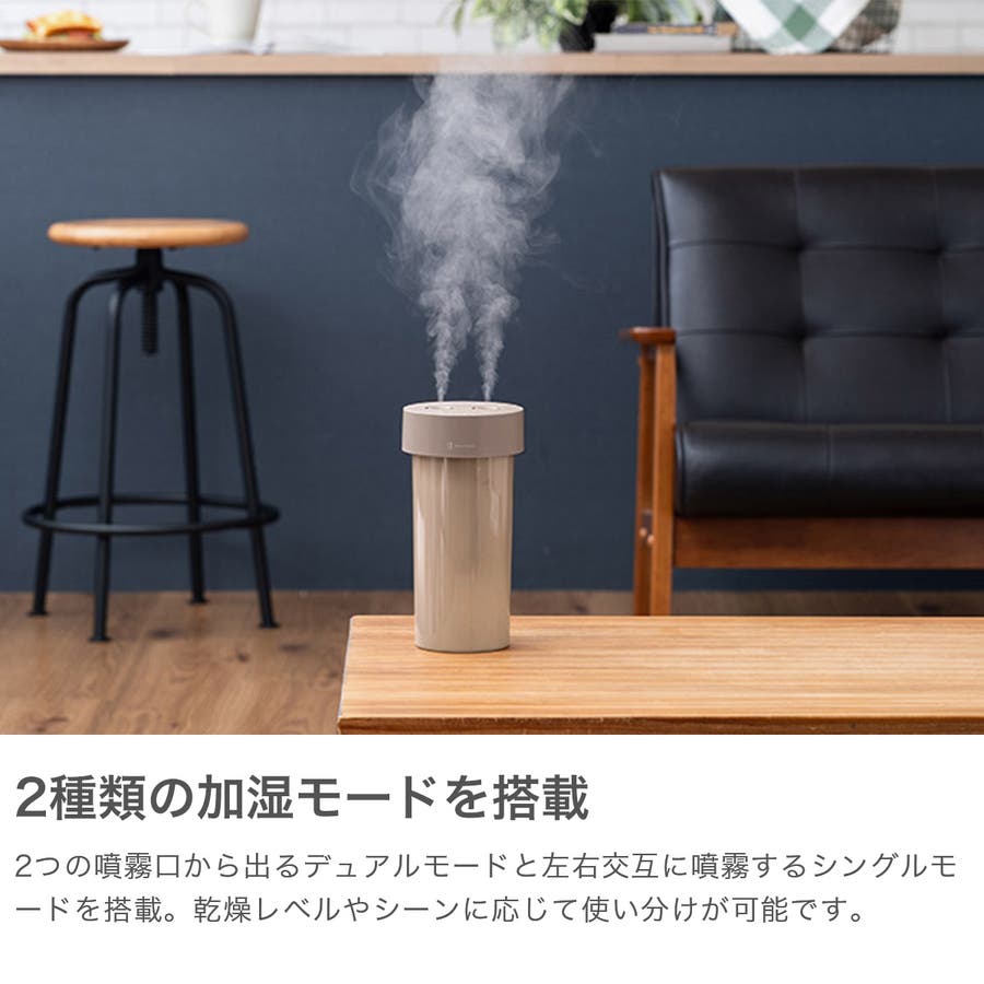 ミストを送風して広範囲を加湿するファン内蔵加湿器。コンパクトながらタンクは大容量800ml。超音波加湿器には珍しいファン内蔵タイプで、送風で広範囲にミストを届け、お部屋を加湿します。ミスト噴霧は2つの噴霧口から出るデュアルミストに加え、左右交互に噴霧するシングルミストの2種類を搭載し、お部屋の乾燥具合に合わせて最適な加湿が可能。また、倒れても水がこぼれにくい設計で、オートオフや2段階調光が可能なLEDライトを搭載するなど、便利な機能を備えた1台です。