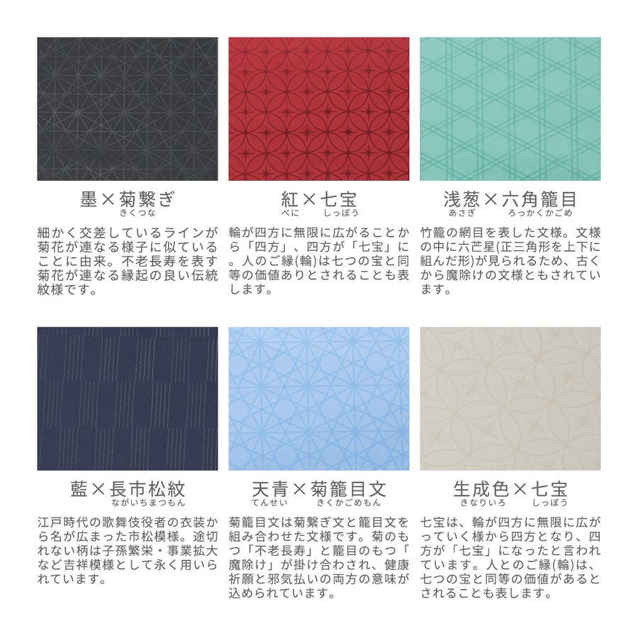 | カラー | 墨 / 紅 / 浅葱 / 藍 / 天青 / 生成色 |