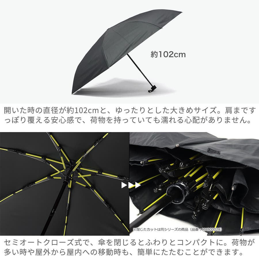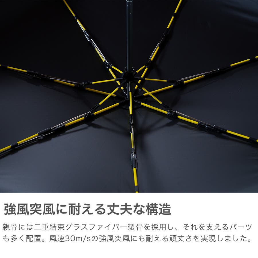 強風や突風に強いタフな構造に加え、快適な水切れが続く耐久撥水加工と雨の浸透を防ぐ高耐水加工により、強い雨に対応する豪雨モデルの折りたたみ傘です。荷物も濡れにくい親骨60cmの大きめサイズで、体をしっかりカバーします。UVカット90%以上で晴れの日にも対応。シンプルなデザインで、毎日の通勤・通学に活躍します。