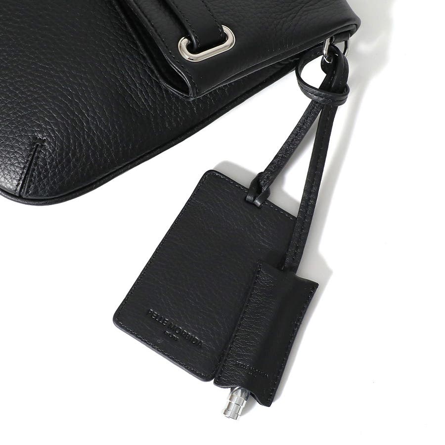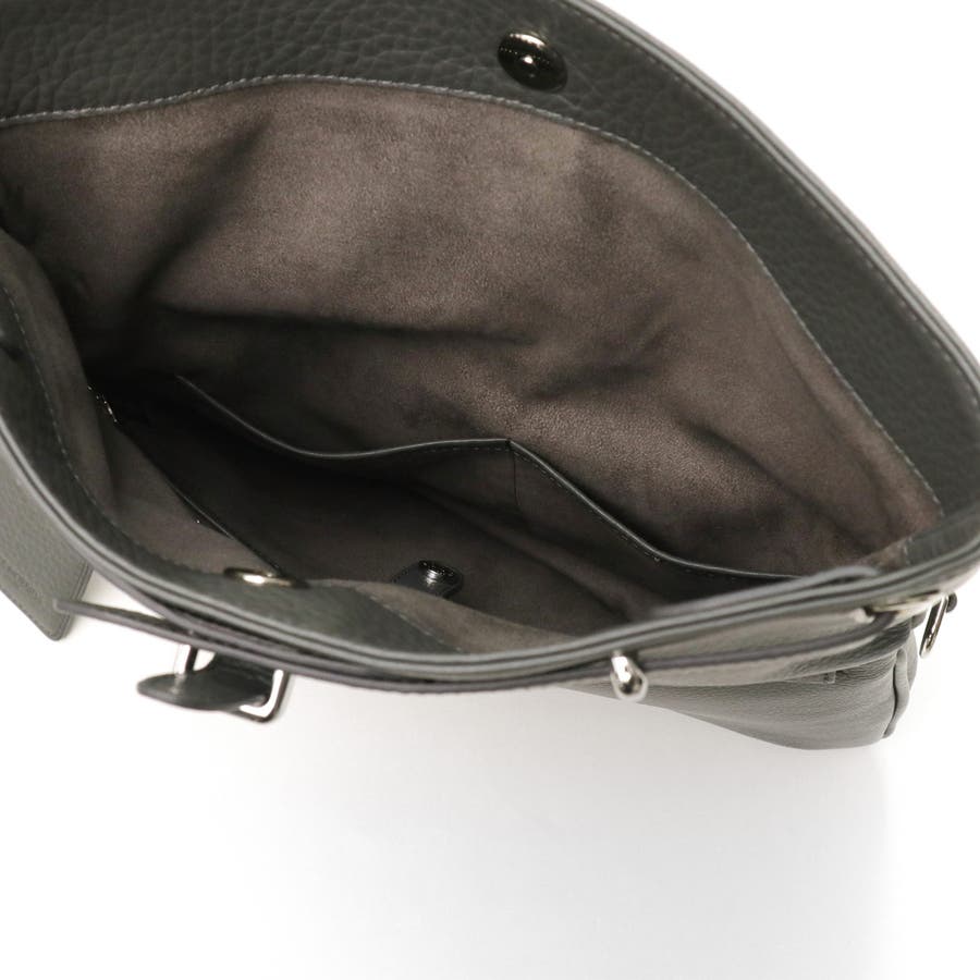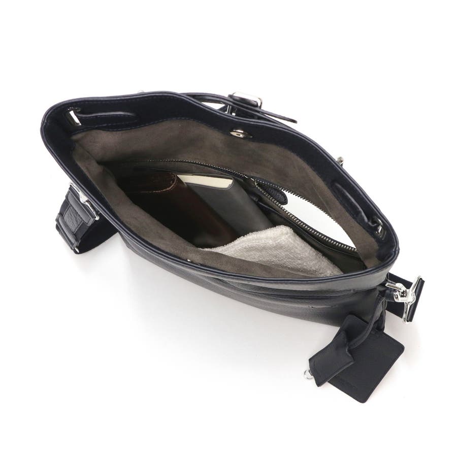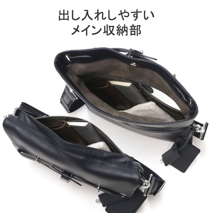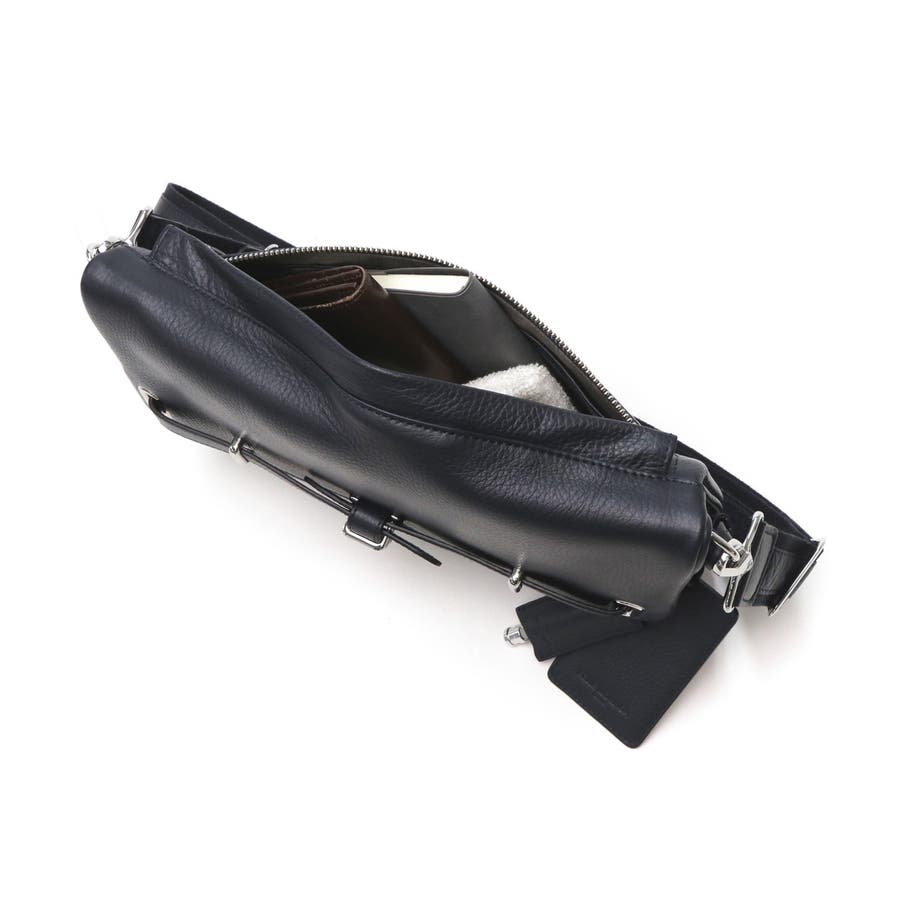 メイン収納部は外出の際に必要なお財布や手帳などのアイテムを持ち歩くのにちょうど良いサイズ感になっています。内外にはポケットが充実し、小物の整理に便利です。また、背面側にはファスナーが設けられ、背面側からもスムーズにアイテムの出し入れが可能です。