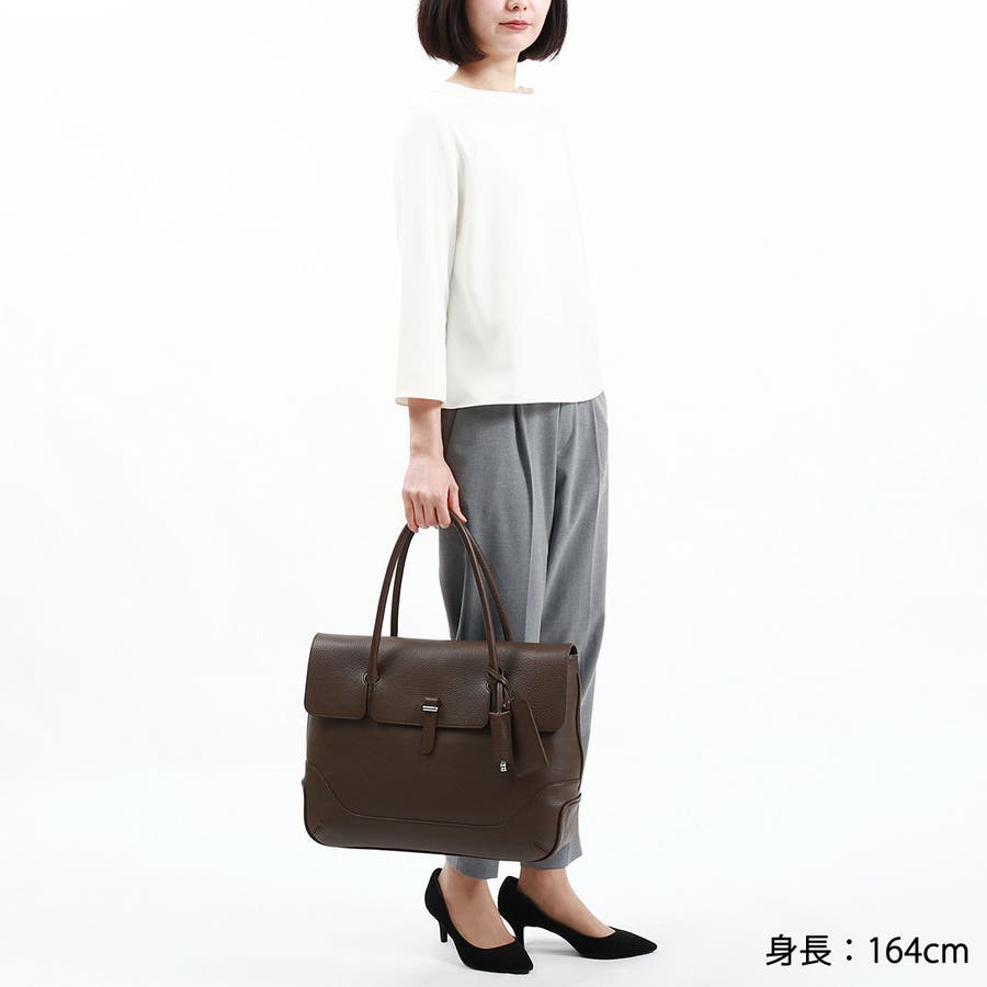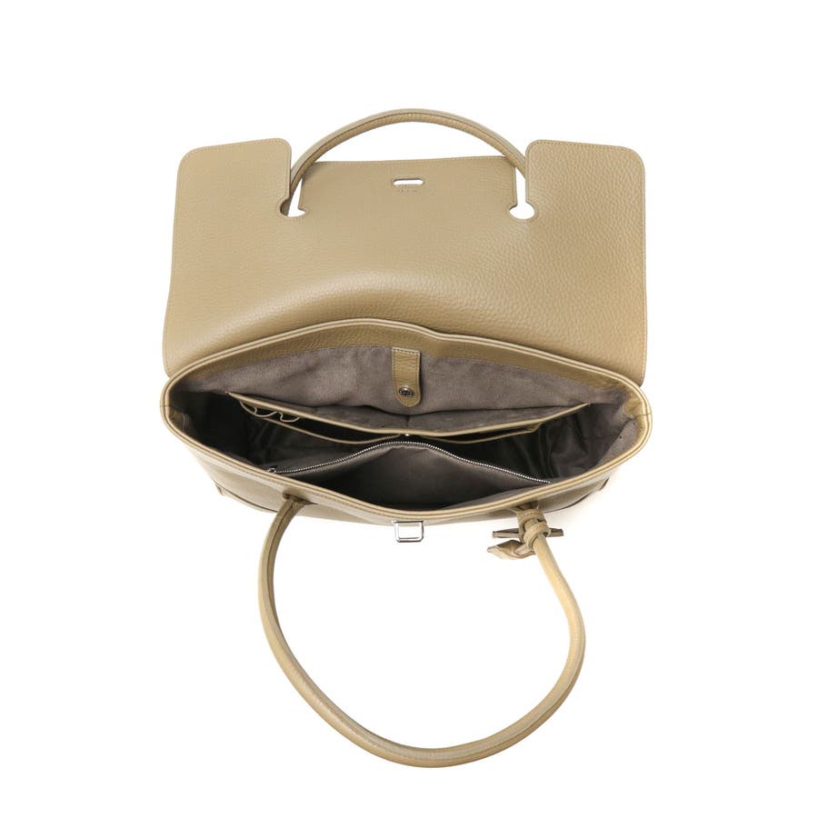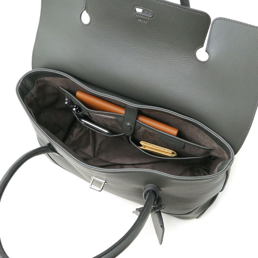 B4サイズがぴったり収まる本体は、スムーズな開閉を叶えるフラップ式の収納口を採用。広めのマチ幅を備えたことで、書類やファイル、飲み物などのかさばる荷物もスマートに収納できます。さらに内装には、大きさ違いのポケットを装備。アイテムの仕分けや小物の整理が難なく行うことができます。また、綺麗なフォルムを際立たせる華奢なハンドルは、肩掛けができる長めの設計がポイント。ルックスだけでなく、使いやすさも兼備しています。