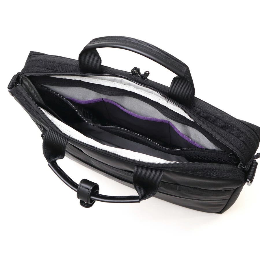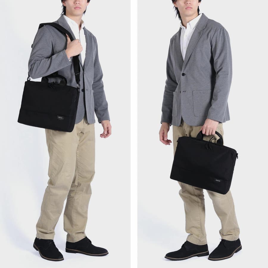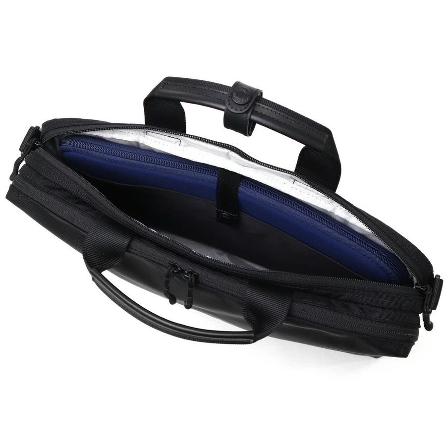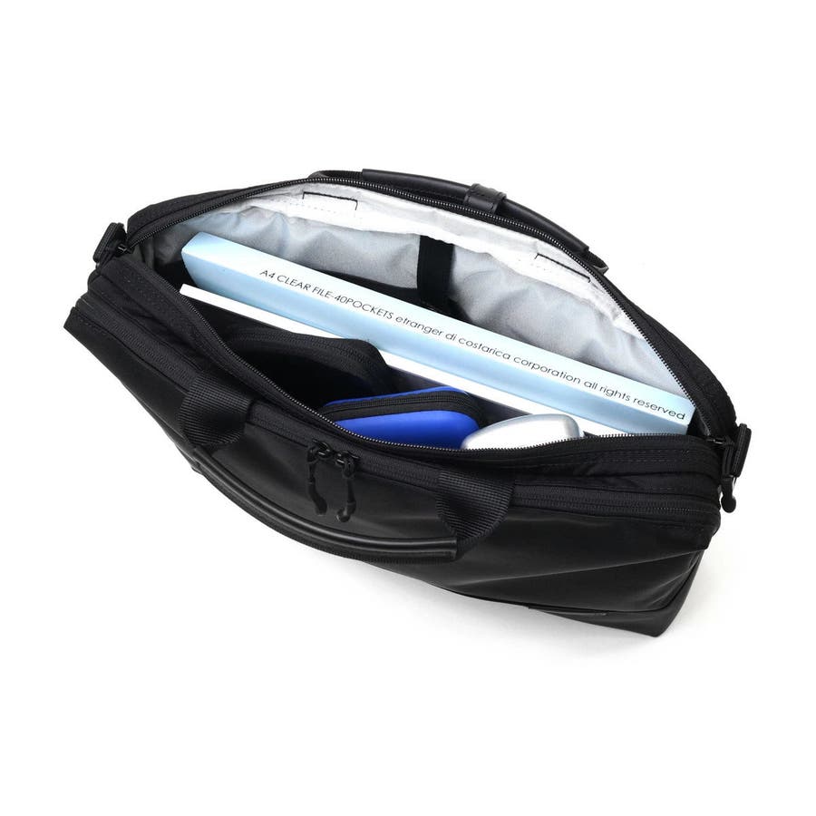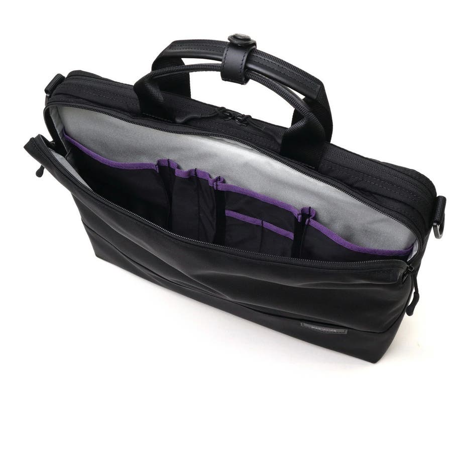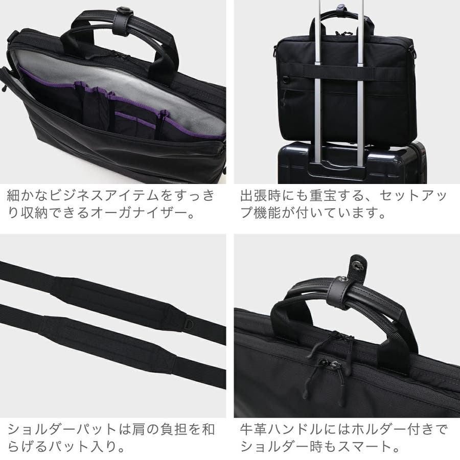 | 充実の機能性を備えた ビジネスの頼れる相棒 高機能かつ軽量で、毎日の通勤を快適にする2WAYブリーフケース。薄マチながらしっかりと底マチを設けたメインルーム、ビジネス小物の管理に役立つオーガナイザーなど、使いやすさを追求した設計となっています。着脱可能なショルダーストラップや、キャリーケースとのセットアップベルトを設け、どんな移動シーンでもストレスフリーに携帯できるのも魅力です。 |