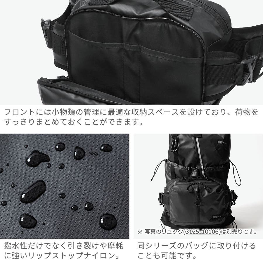 ミリタリーやアウトドアのエッセンスを加えたタフなデザインが特徴の『RICO』シリーズ。大きめで収納力に優れたウエストバッグ。高い耐久性と防水性を持つリップストップ生地は、撥水性だけでなく引き裂けや摩耗にも強く、アウトドアからデイリーユースまで活躍し実用的。また、同シリーズのバックパック(3125-10106)と組み合わせでき、ドッキングもお楽しみいただけるアイテムとなっています。