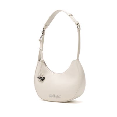丸くコンパクトなフォルムで、コーデを華やかにしてくれるハンドバッグ。メタルロゴのモチーフと、揺れるハートのチャームがポイント。手持ちバッグとしてはもちろん、アウターの上からでも肩掛けできる持ち手の長さになっています。コンパクトながらしっかり収納できるサイズ感で、デイリーからちょっとしたお出かけまで幅広く活躍するアイテムです。