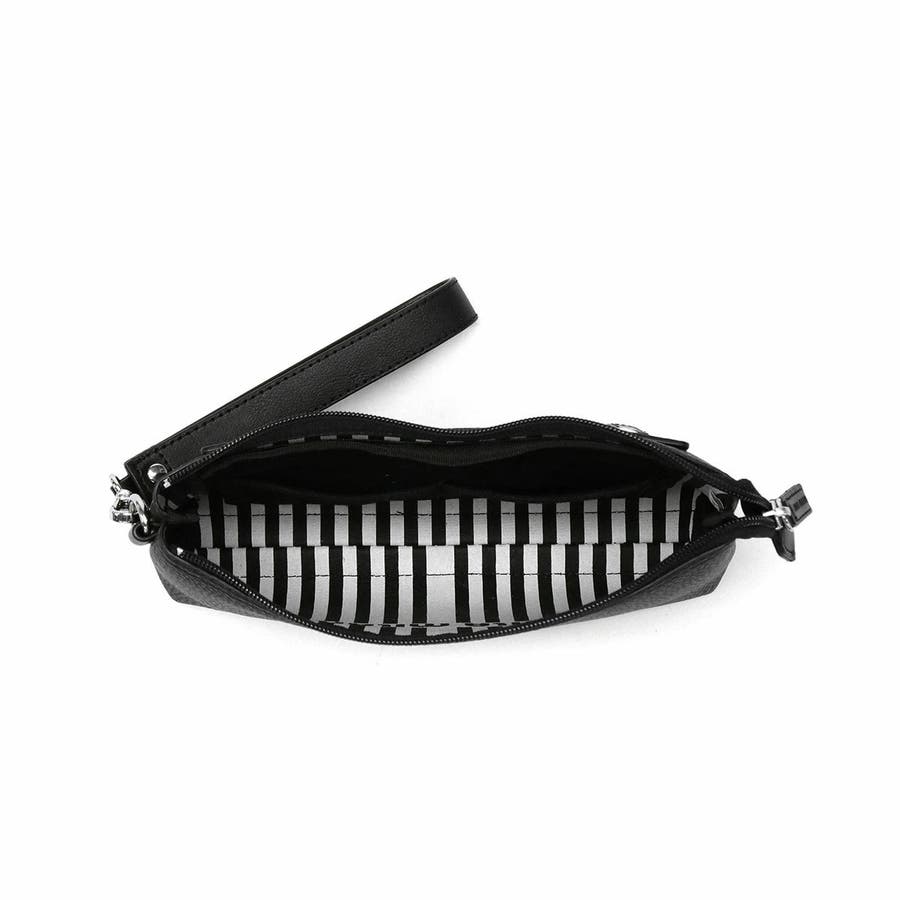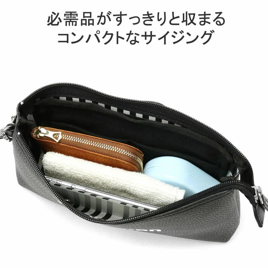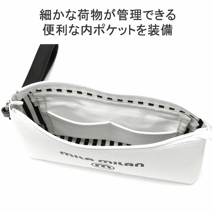 収納部は、長財布やスマートフォンなどがすっきり収まるコンパクトサイズ。内部には細々とした荷物の整理に役立つ小分けポケットを設けており使い勝手も抜群。外装はモノトーンのシンプルなデザインですが、内装にはストライプ&ブランドロゴを施し、アクセントの効いた仕上がりになっています。