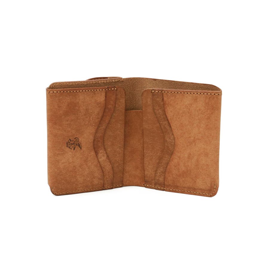 イタリア・フィレンツェ生まれのプエブロレザーを使用した二つ折りウォレット。プエブロレザーは、生後2年以上の雌牛をベジタブルタンニンで鞣した後、ニートフットオイルをじっくりと浸透させる“バケッタ製法”で作られた革。コンパクトながら優れた収納力を備えた、機能美あふれる一品です。