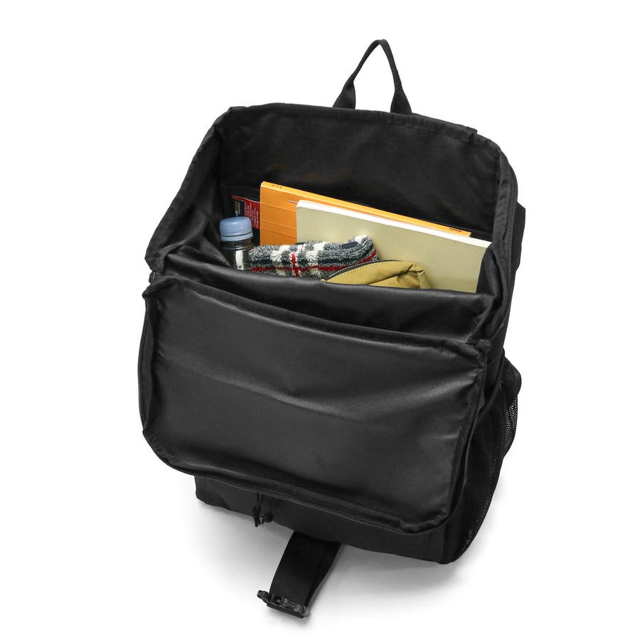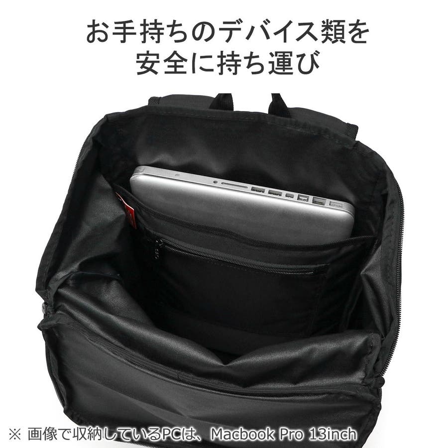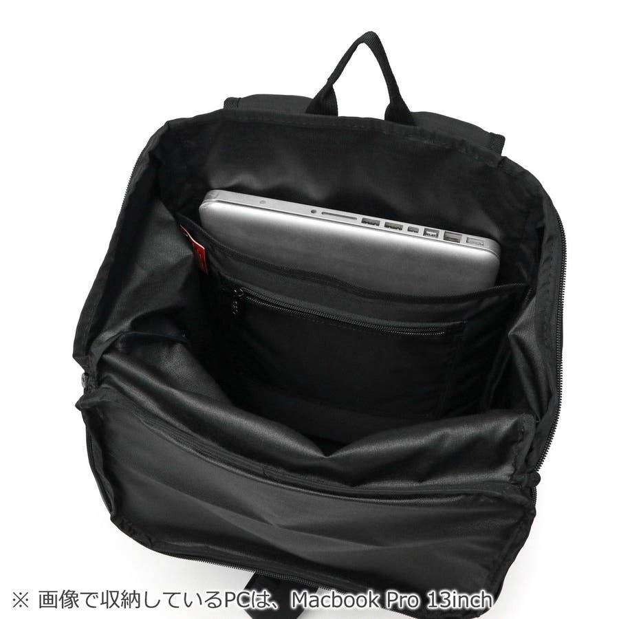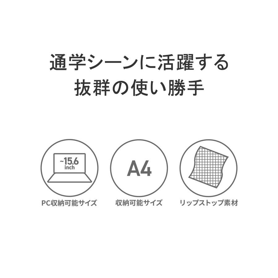PC収納やジップポケットなど豊富な収納部を搭載するこちらのアイテム。メインルームのファスナーの開閉口を背面に配置することで、電車内で前に背負った時に便利な仕様となっています。A4サイズの書類やファイルも綺麗に収納できるので、通学用のバックパックとしてもおすすめです。