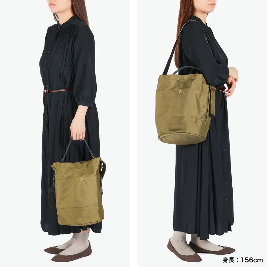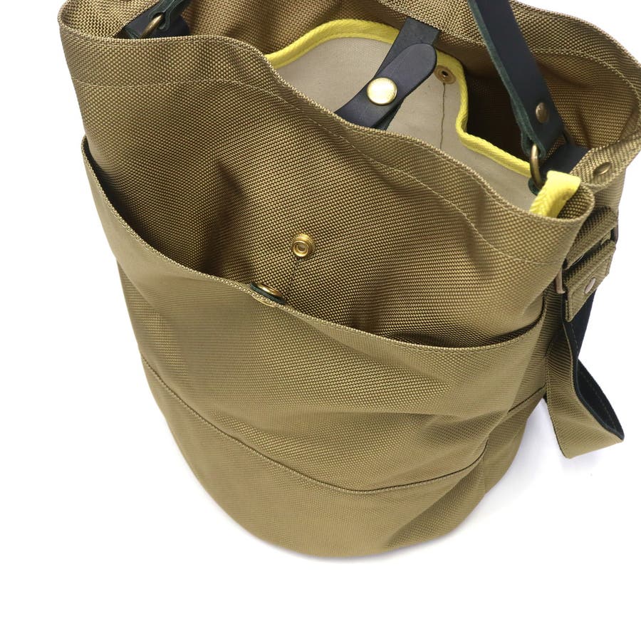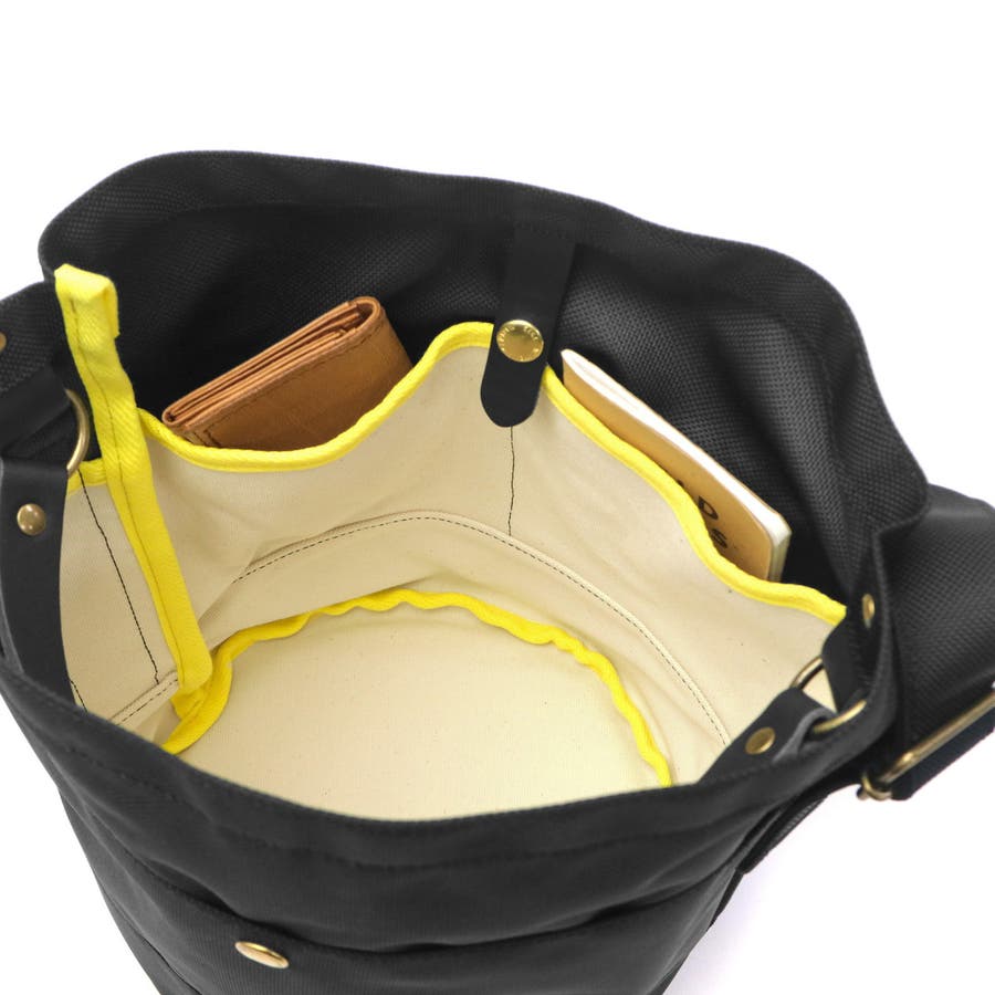 丈夫な66ナイロンと姫路レザーを組み合わせた、バケツ型のデザインが特徴の2WAYショルダーバッグ。ヨーロッパのガーデニング用バッグをモチーフにし、しっかりとした丸い底板があることで立てても置けて、ランチボックスなど厚みのあるものもきちんと持ち運べます。内側には鮮やかなイエローカラーのパイピングが施され、絶妙なアクセントに。レザーのハンドルを持ってトートとしても、お持ちいただけます。
