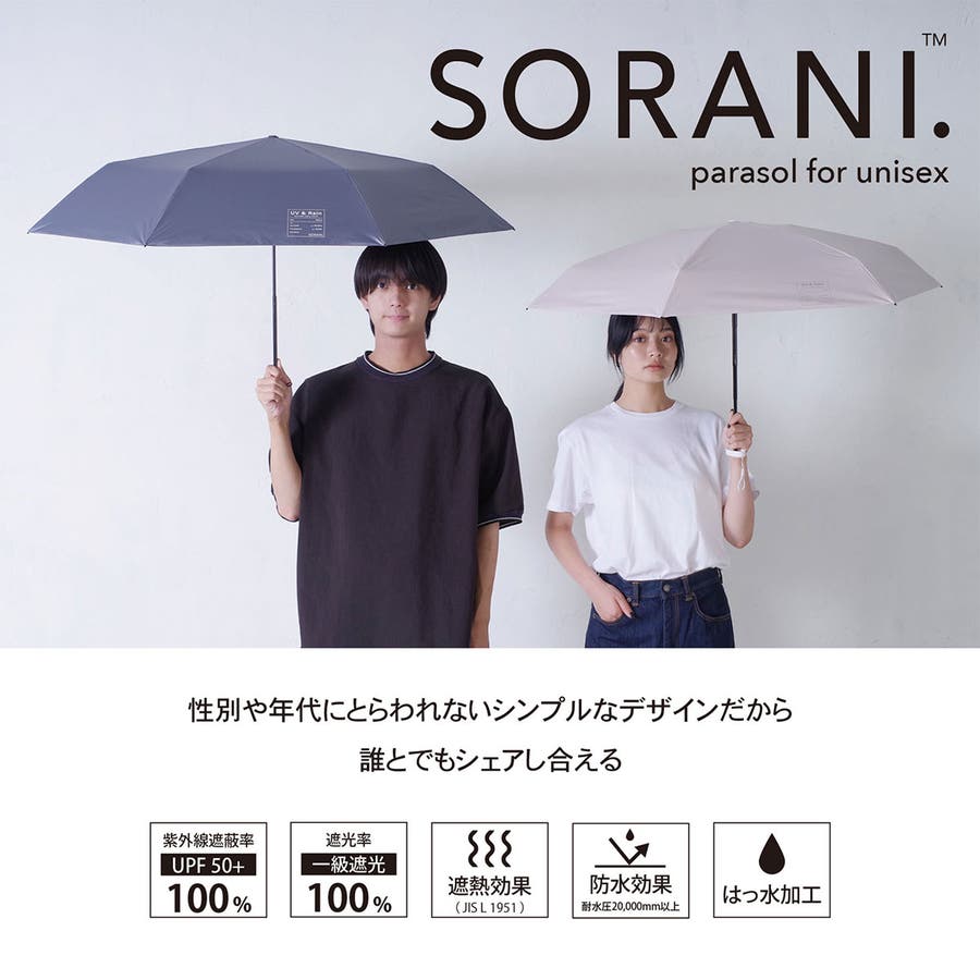性別や年代にとらわれないシンプルなデザインの、晴雨兼用日傘シリーズ『SORANI./ソラニ』。紫外線遮蔽率100%、UPF50+、遮光率100%、遮熱性に加え、雨の日にも安心なはっ水・防水効果も施しており、オールシーズンお使いいただけるアイテムです。