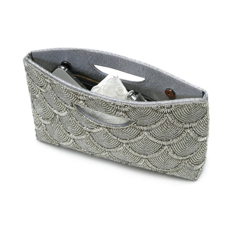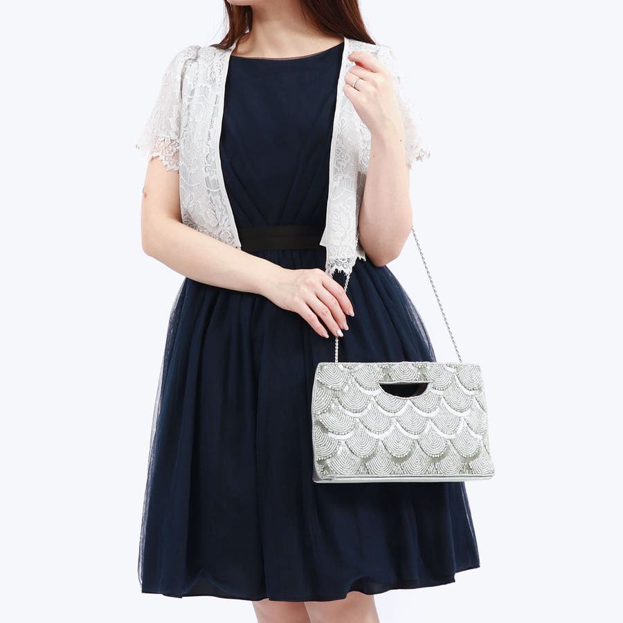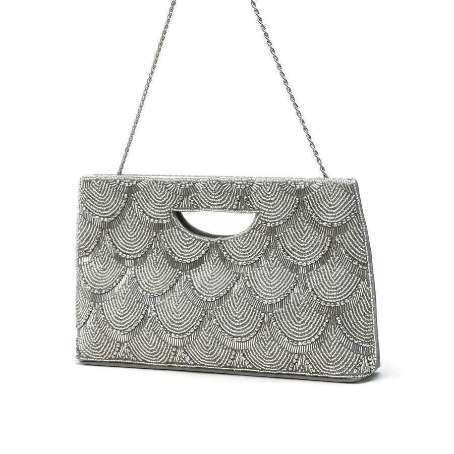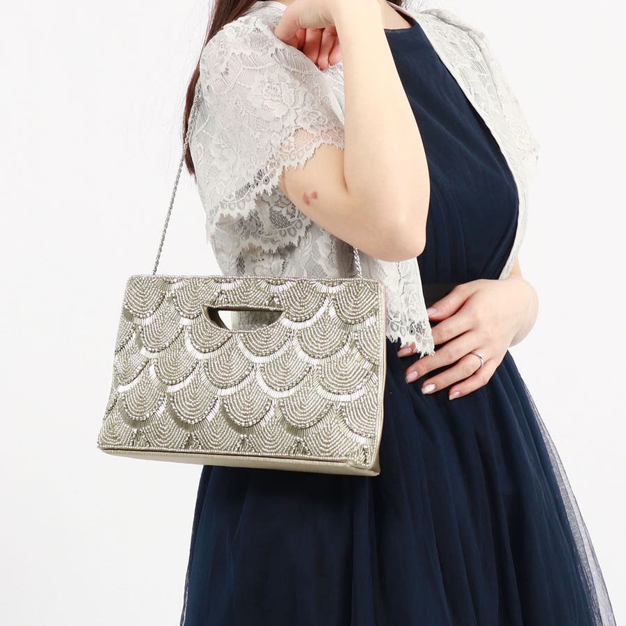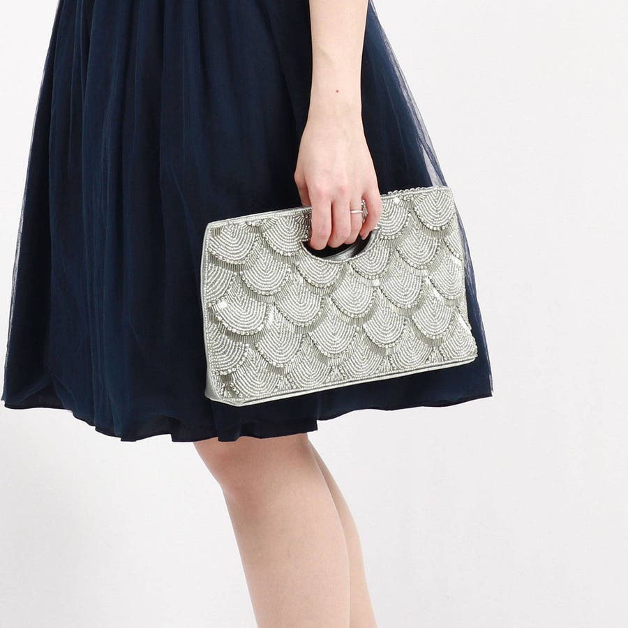 甘さを抑えたスカラップ模様のビーズ刺繍が華やかなクラッチバッグ。財布はもちろんスマートフォン、袱紗(ふくさ)などの必需品が入るサイズ感です。取り外しが可能なショルダーチェーンが付属しており肩掛けも可能。落ち着いたワントーンでまとめられており、ドレスアップスタイルへの合わせやすさも魅力です。