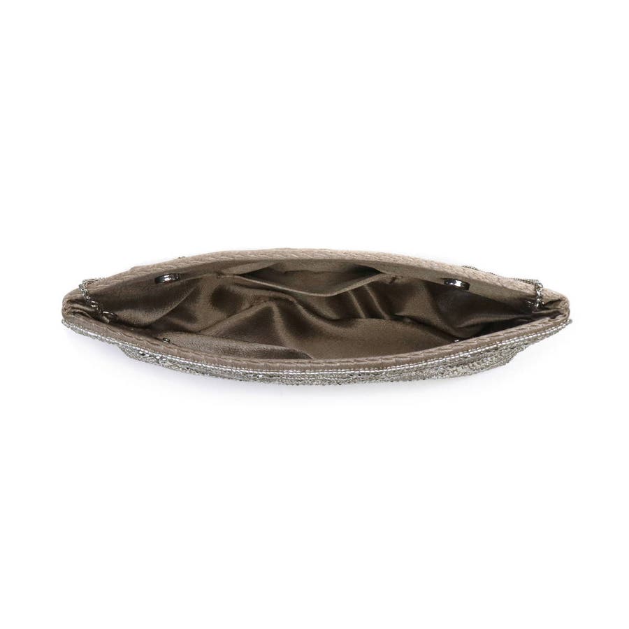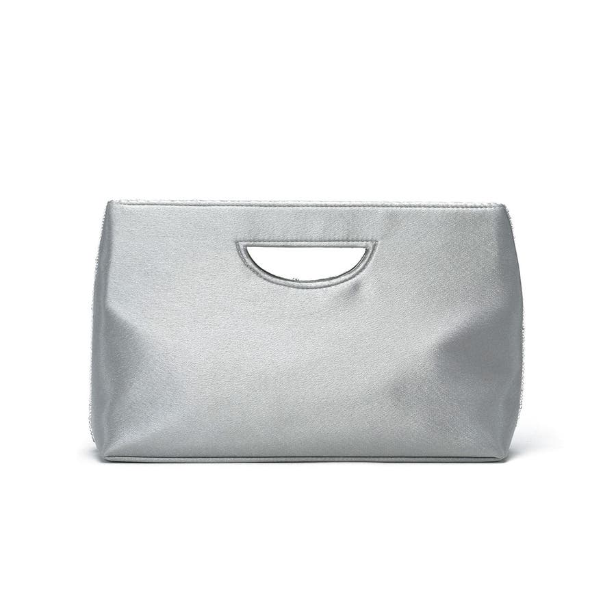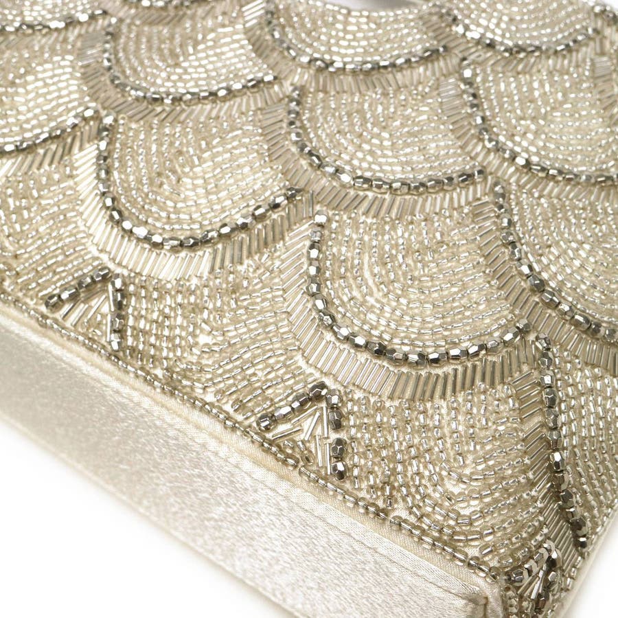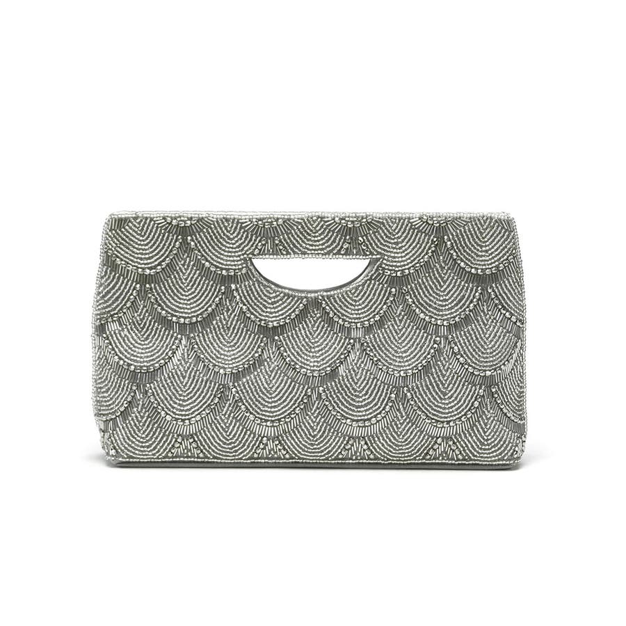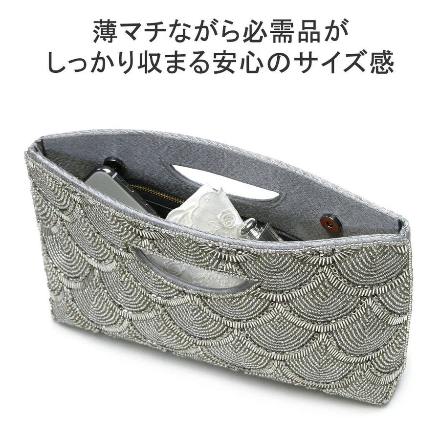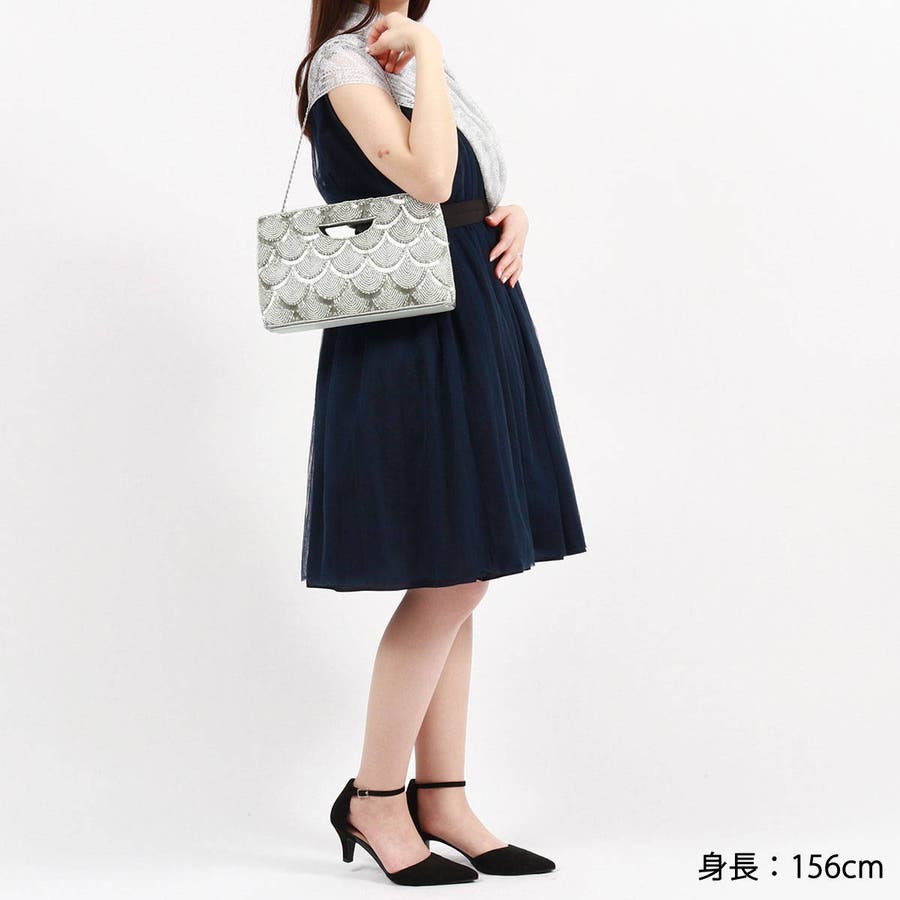 甘さを抑えたスカラップ模様のビーズ刺繍が華やかなクラッチバッグ。財布はもちろんスマートフォン、袱紗(ふくさ)などの必需品が入るサイズ感です。取り外しが可能なショルダーチェーンが付属しており肩掛けも可能。落ち着いたワントーンでまとめられており、ドレスアップスタイルへの合わせやすさも魅力です。