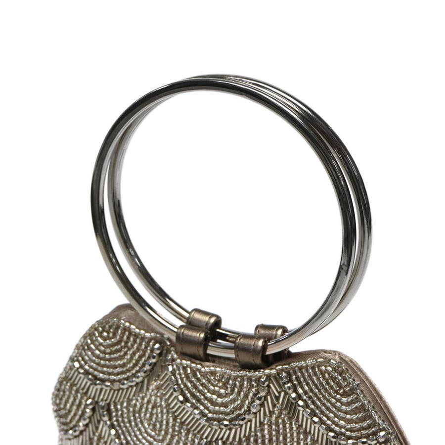 甘さを抑えたスカラップ模様のビーズ刺繍が華やかなリングハンドルバッグです。ご祝儀袋はもちろん、ミニ財布やスマホ、リップなど必要最低限のアイテムが収納可能なサイズ感。ロングショルダーチェーンがセットになっており、斜め掛けも可能です。落ち着いたワントーンでまとめられており、ドレスアップスタイルへの合わせやすさも魅力です。