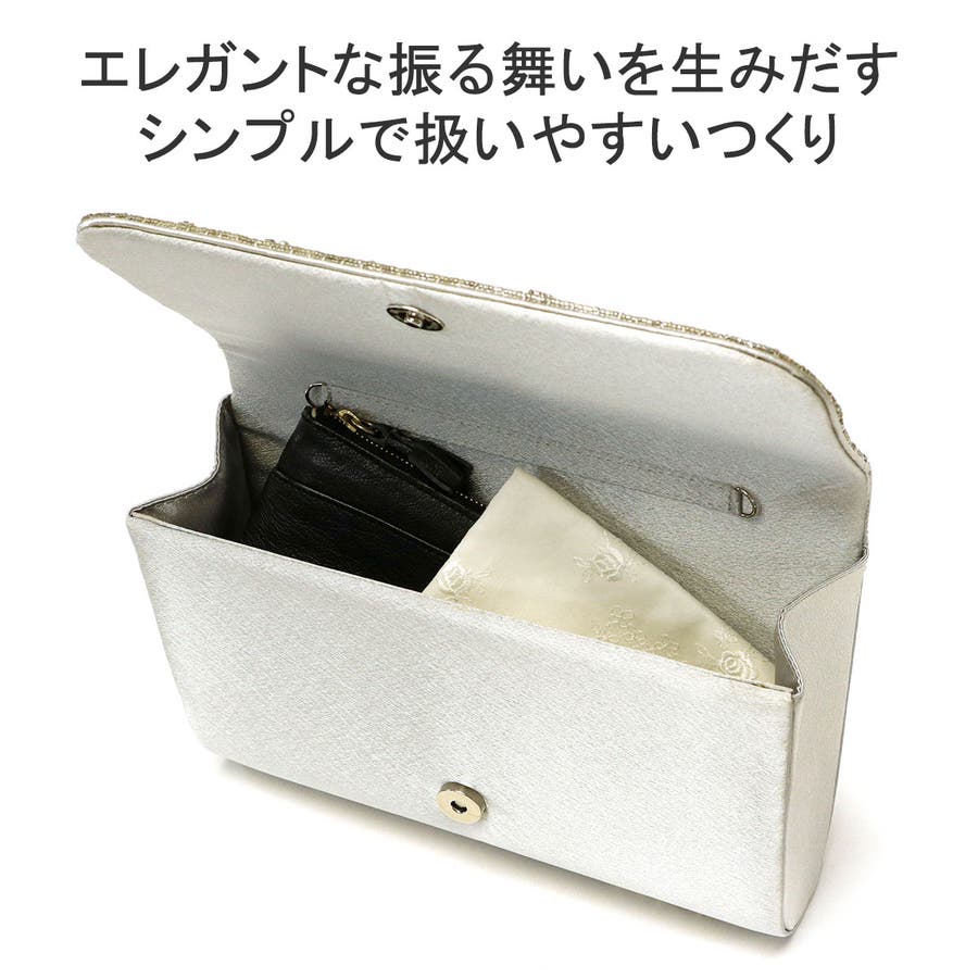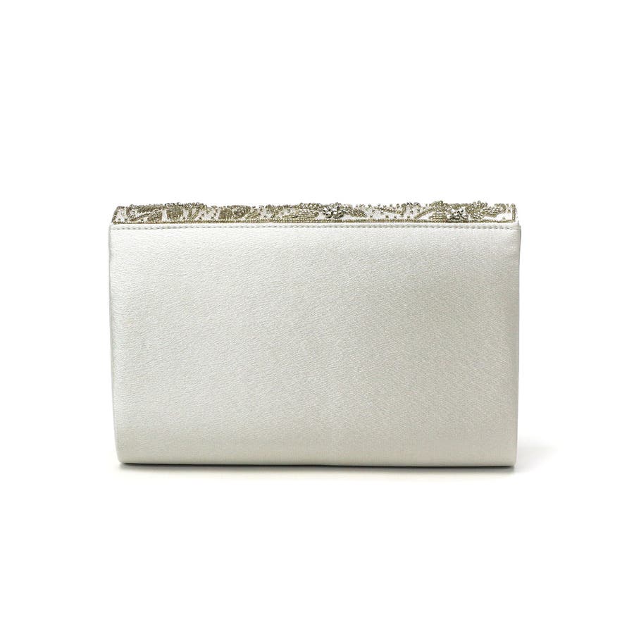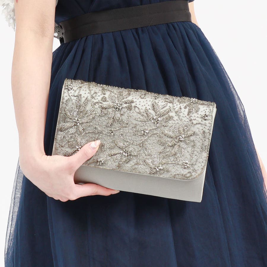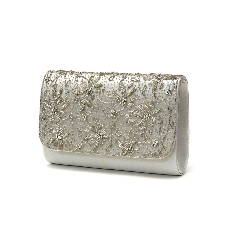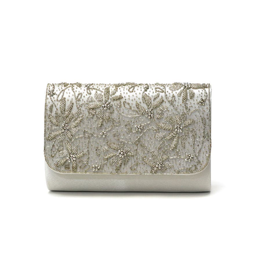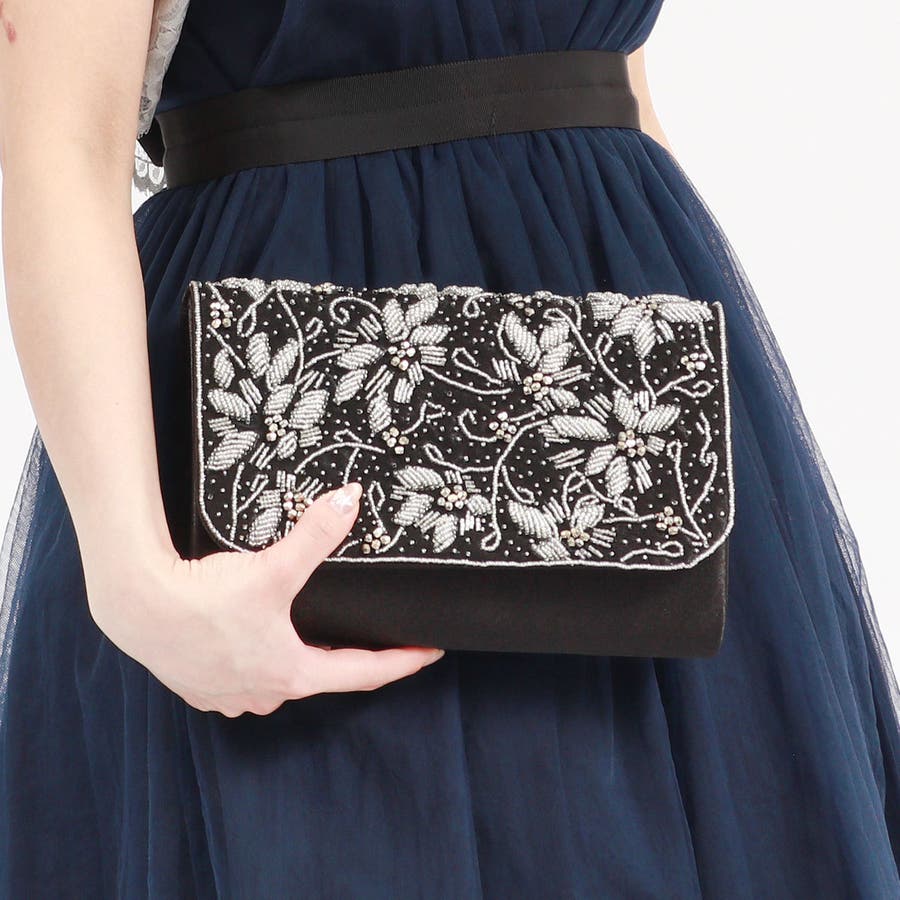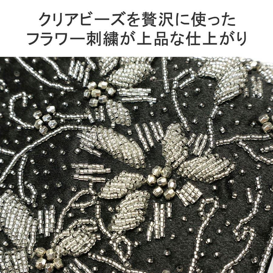 ビーズ刺繍を贅沢にあしらった華やかなボックス型クラッチバッグ。財布はもちろんスマートフォン、袱紗(ふくさ)などの必需品が入る使い勝手の良い大きめサイズです。取り外し可能のチェーンをつければショルダーバッグにもなる2WAY仕様もポイント。様々なオケージョンやドレスのアクセントとしてアクセサリーのように映えるアイテムです。